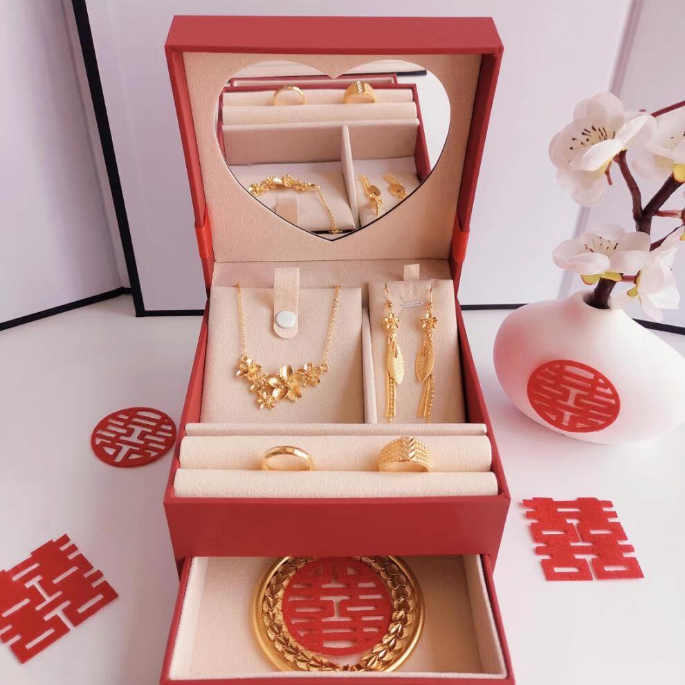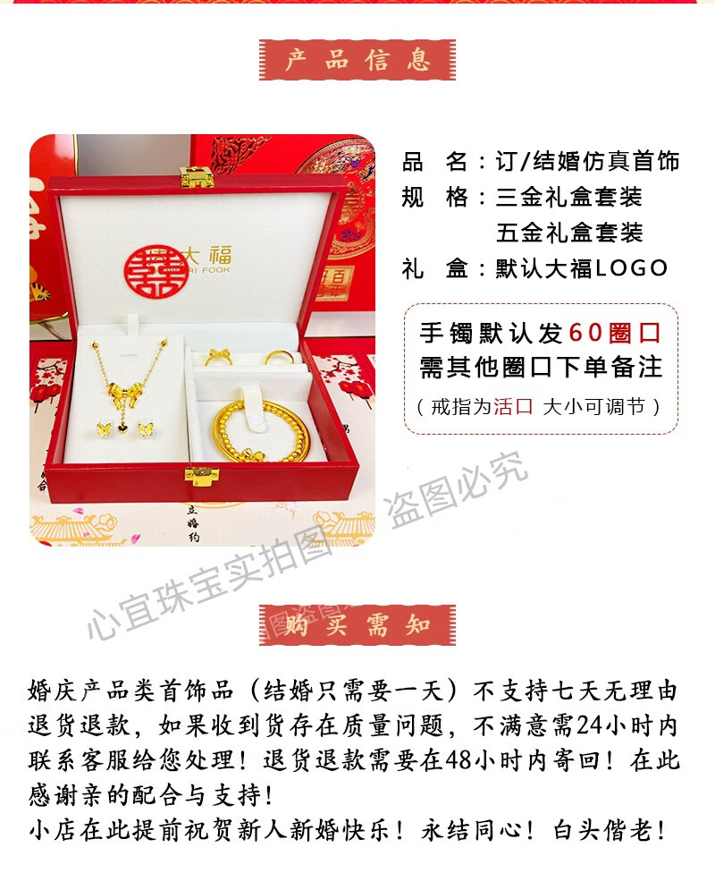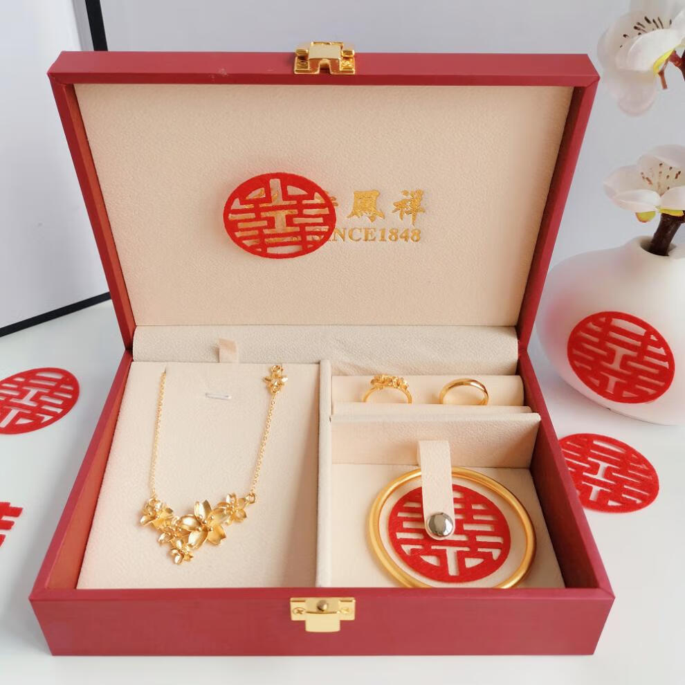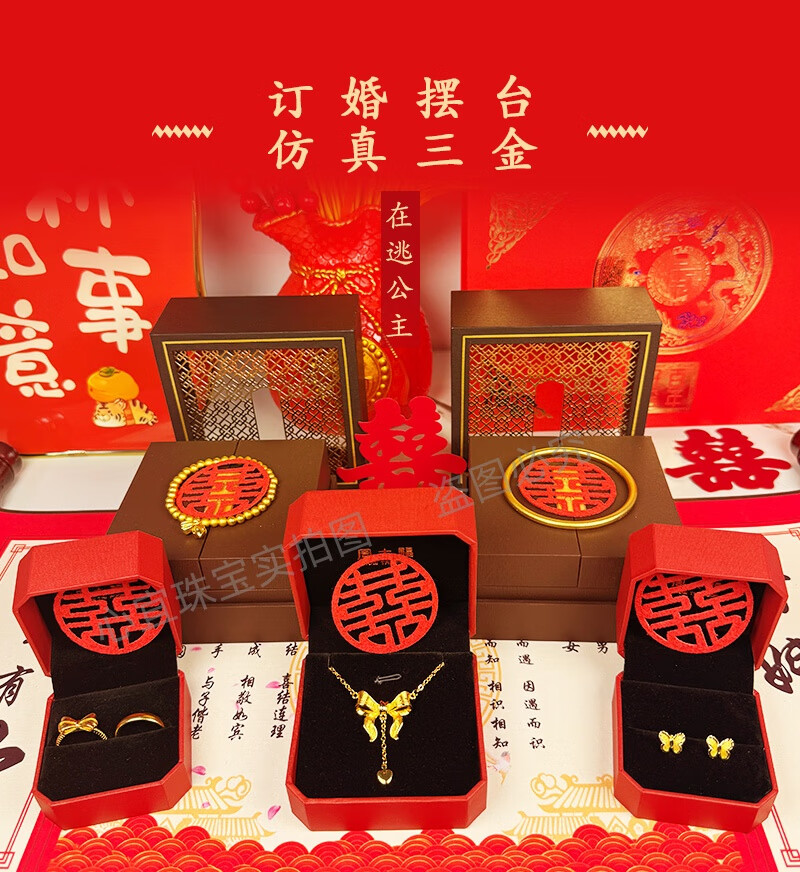 Engagement fake three-gold three-gold jewelry set, engagement simulation hardware set, wedding stage props, realistic three-shenghua hardware set + single-layer gift box + happy words