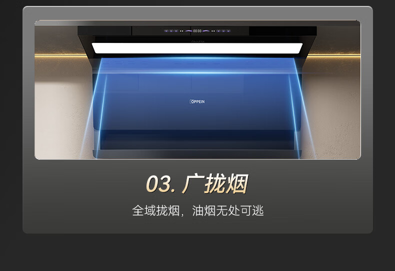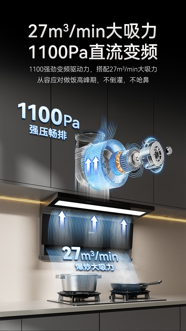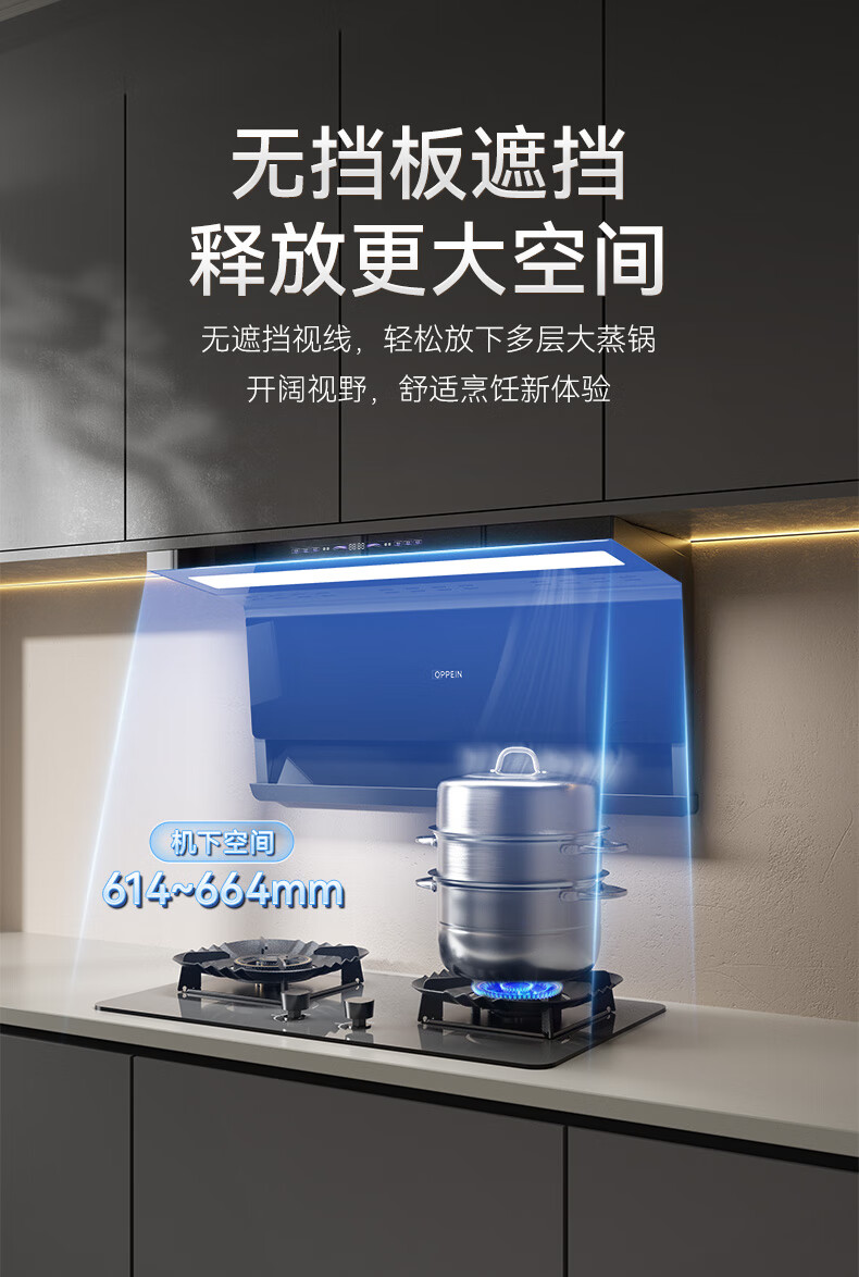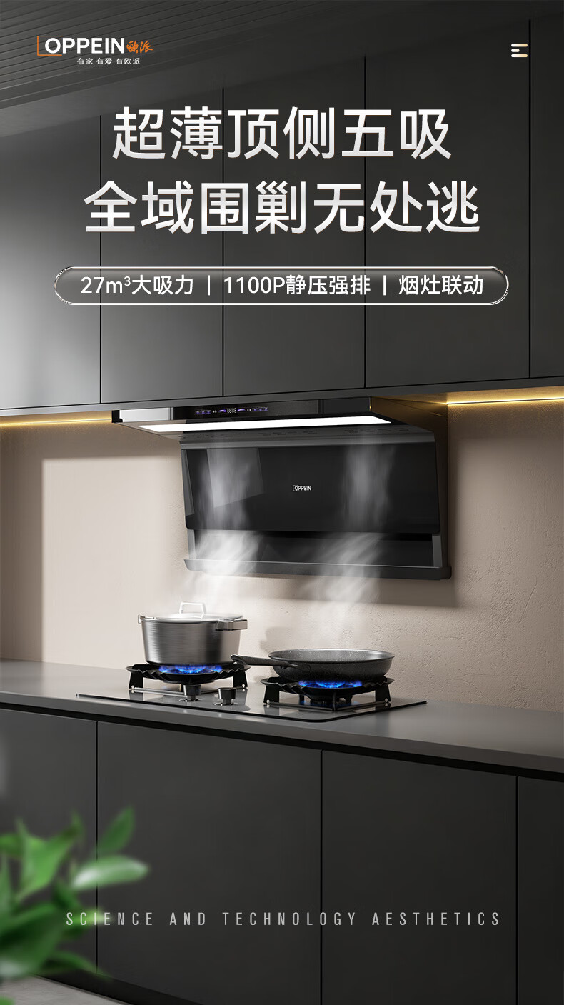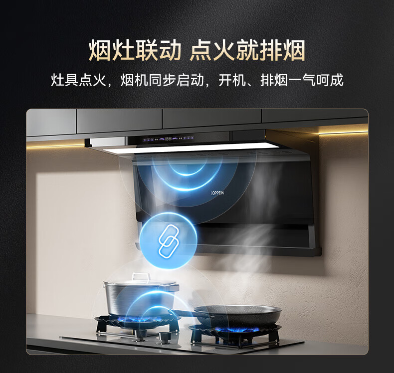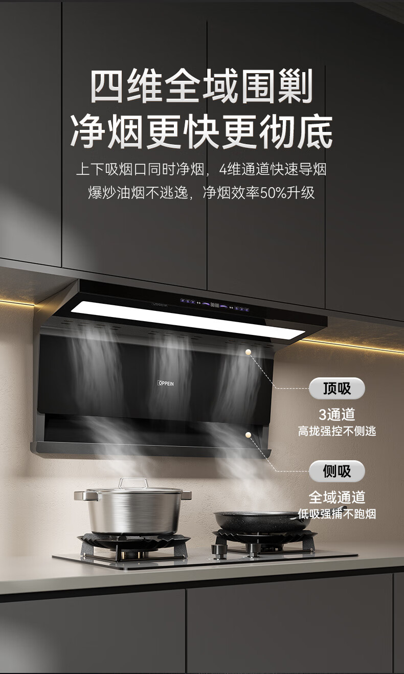 OPPEIN range hood top side double suction high suction household range hood 27m variable frequency high suction hand wave intelligent control stir-fry hood stove set linkage two-piece set with flip-top double nine-cavity fierce stove 89L