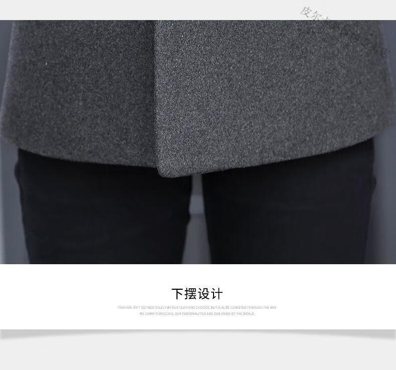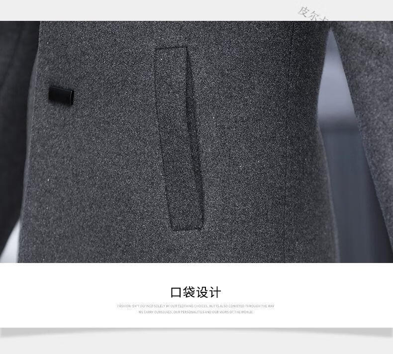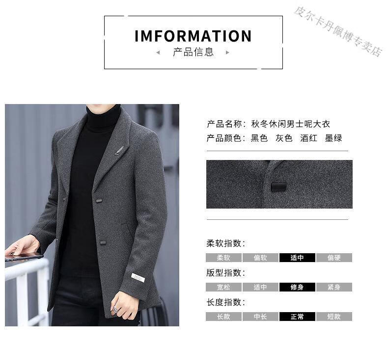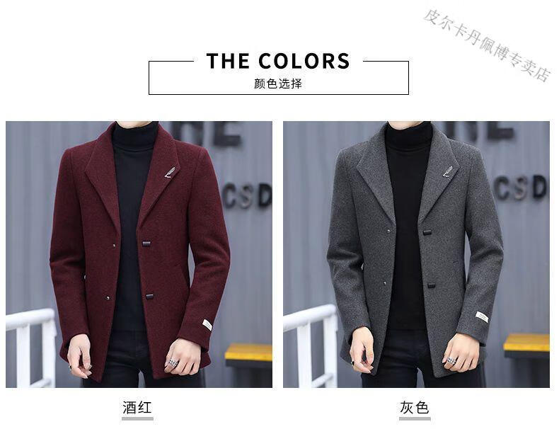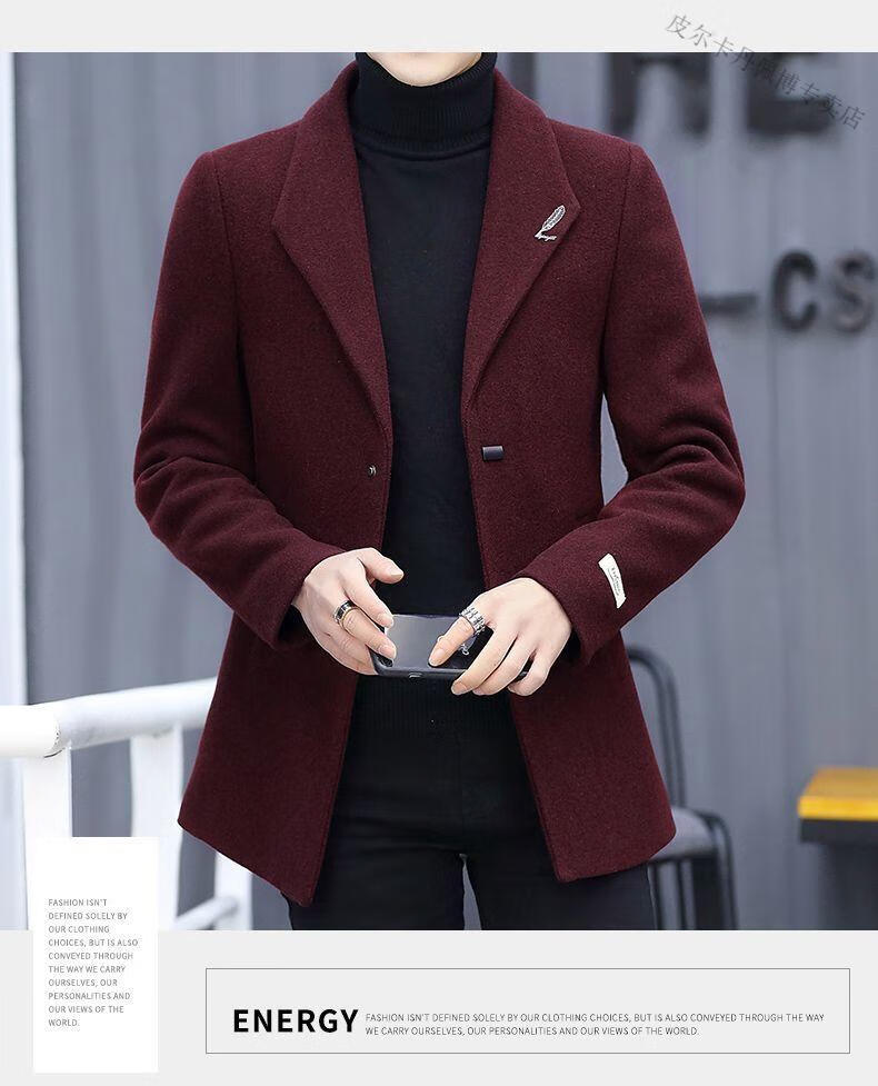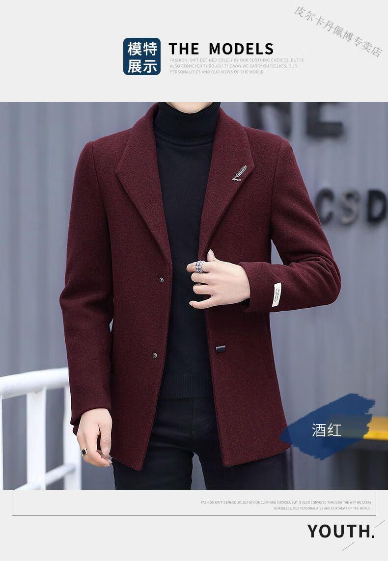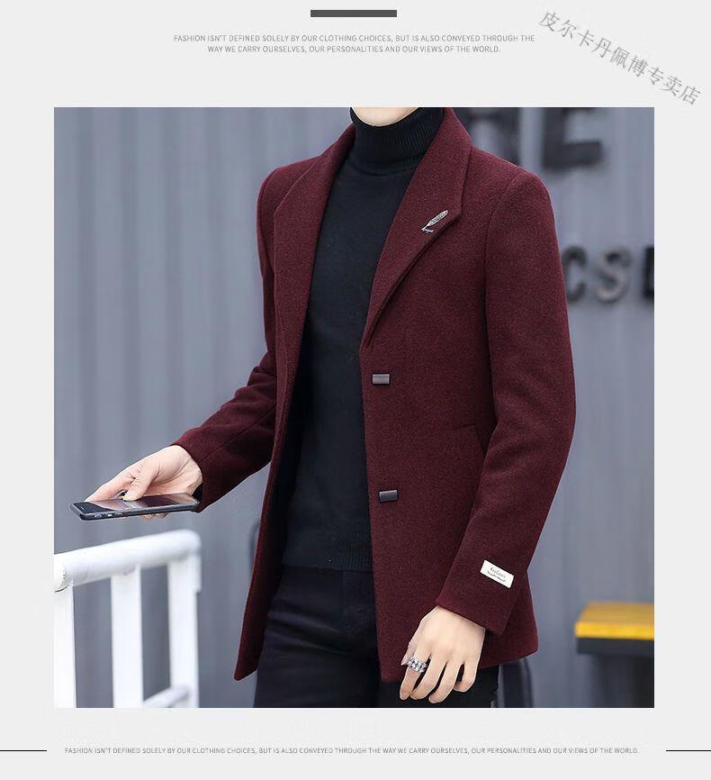 Pierre Cardin woolen coat men's short plus velvet thickened autumn and winter Korean version trendy slim British casual woolen coat burgundy 2XL 150-170Jin Jin equals 0.5 kg