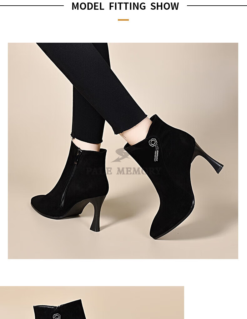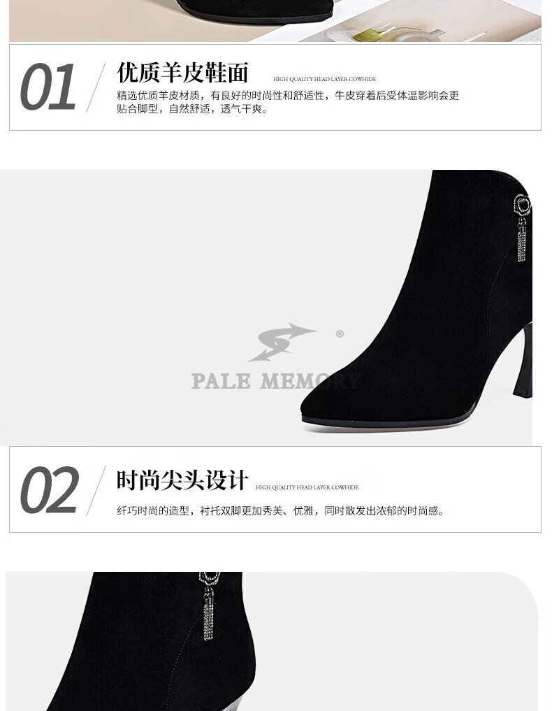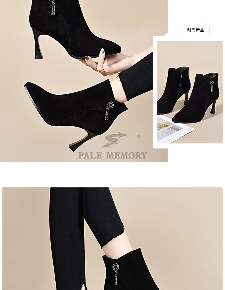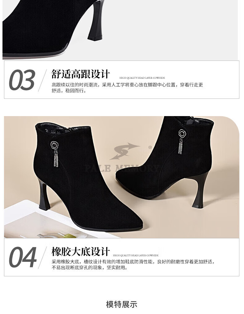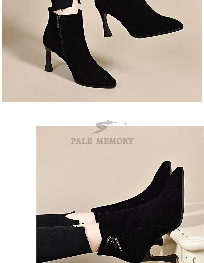 Pale memory brand high-heeled short boots for women 2025 autumn and winter new style genuine leather pointed toe stiletto frosted soft leather ankle boots plus velvet women's boots black velvet lining 36