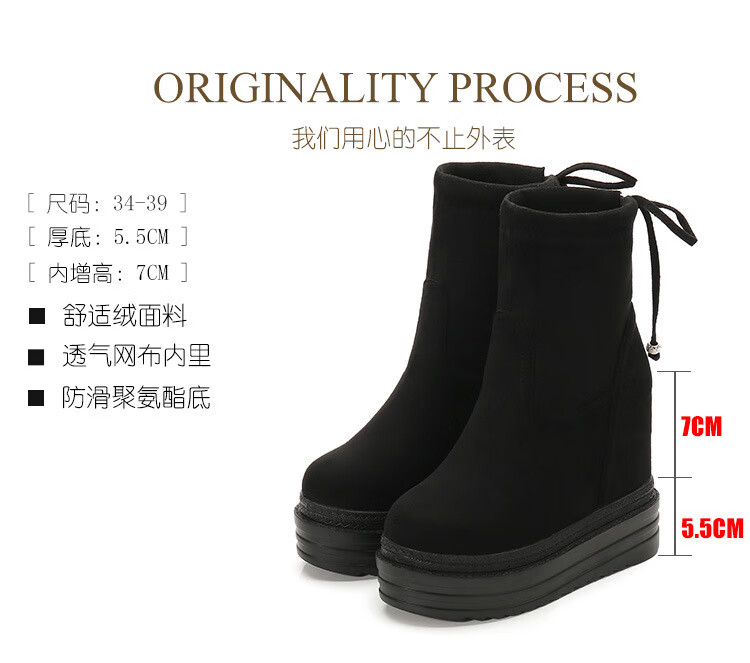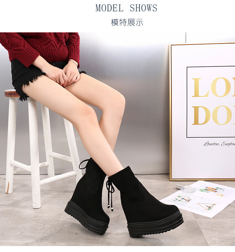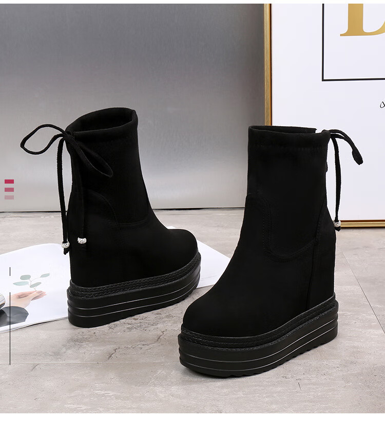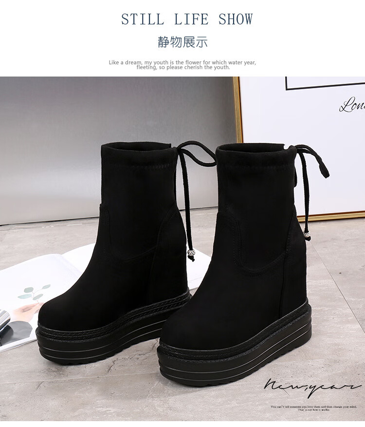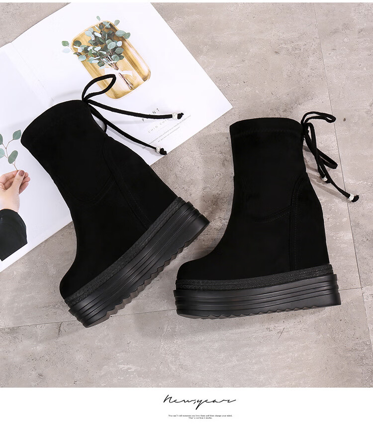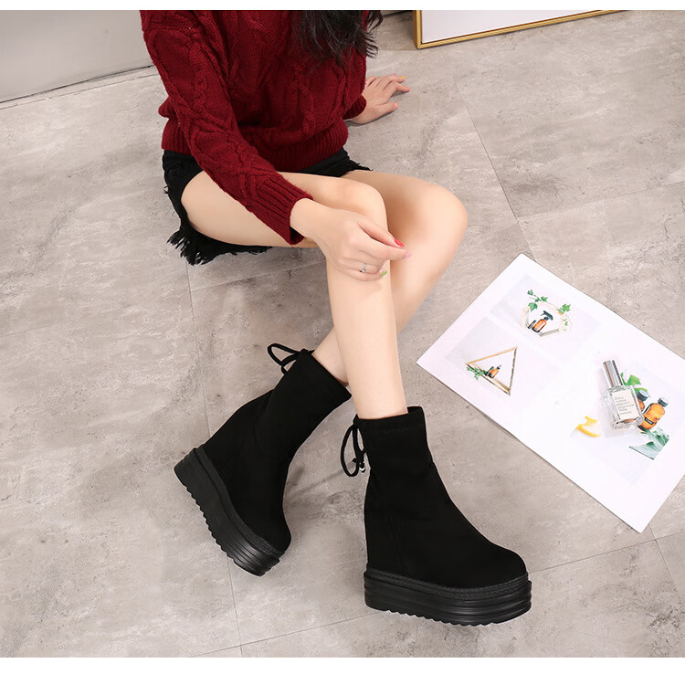 Woodpecker 2025 Autumn and Winter Inner Heightening Thick-soled Short Boots Wedge Super High-heeled Shoes 12CM Mid-calf Boots Suede Stretch Women's Boots Black Heel Height 11cm 34