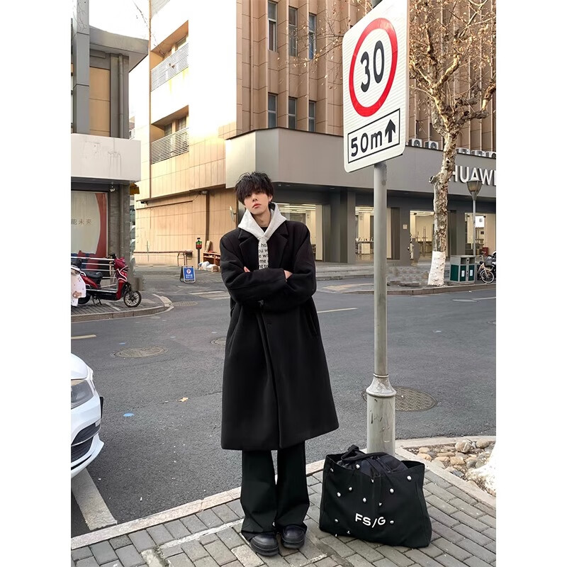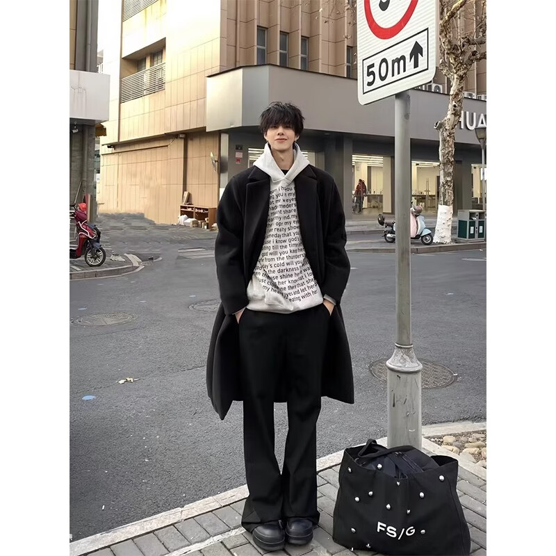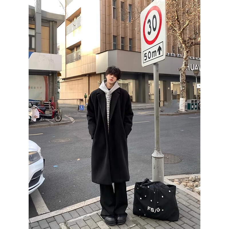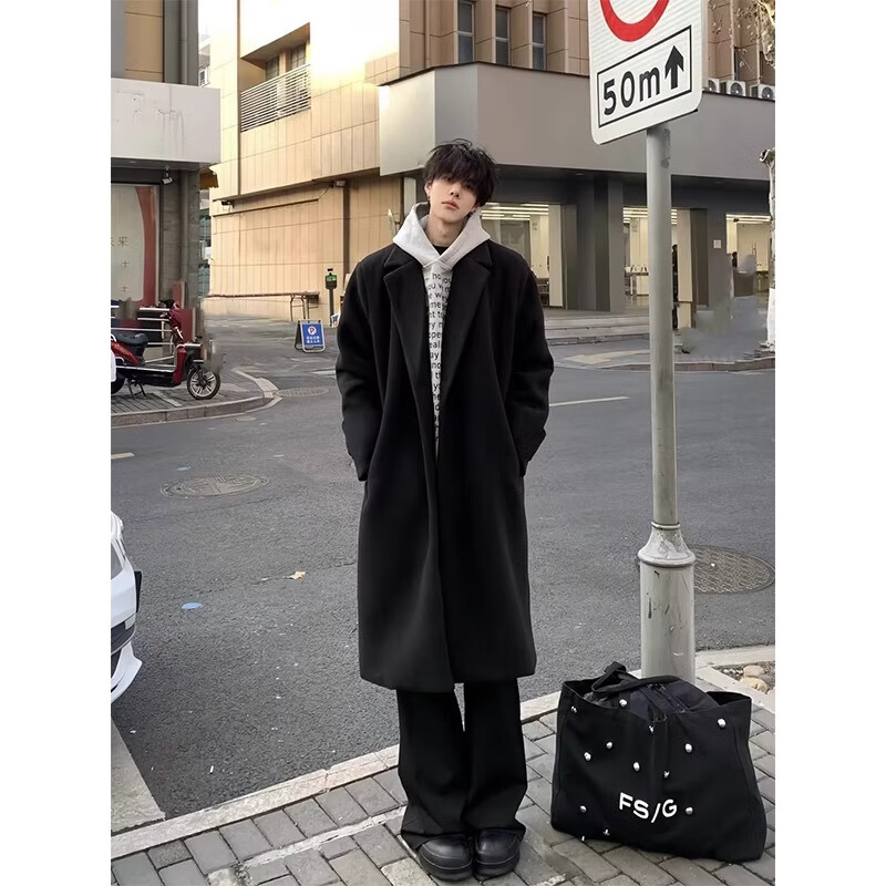 Shelley Jones Abrigo de lana negro de longitud media para hombre Otoño e invierno Nuevo cortavientos por encima de la rodilla de alta calidad Abrigo de lana atractivo estilo británico Negro Regular M Recomendado 80-100 Jin Jin es igual a 0,5 kg