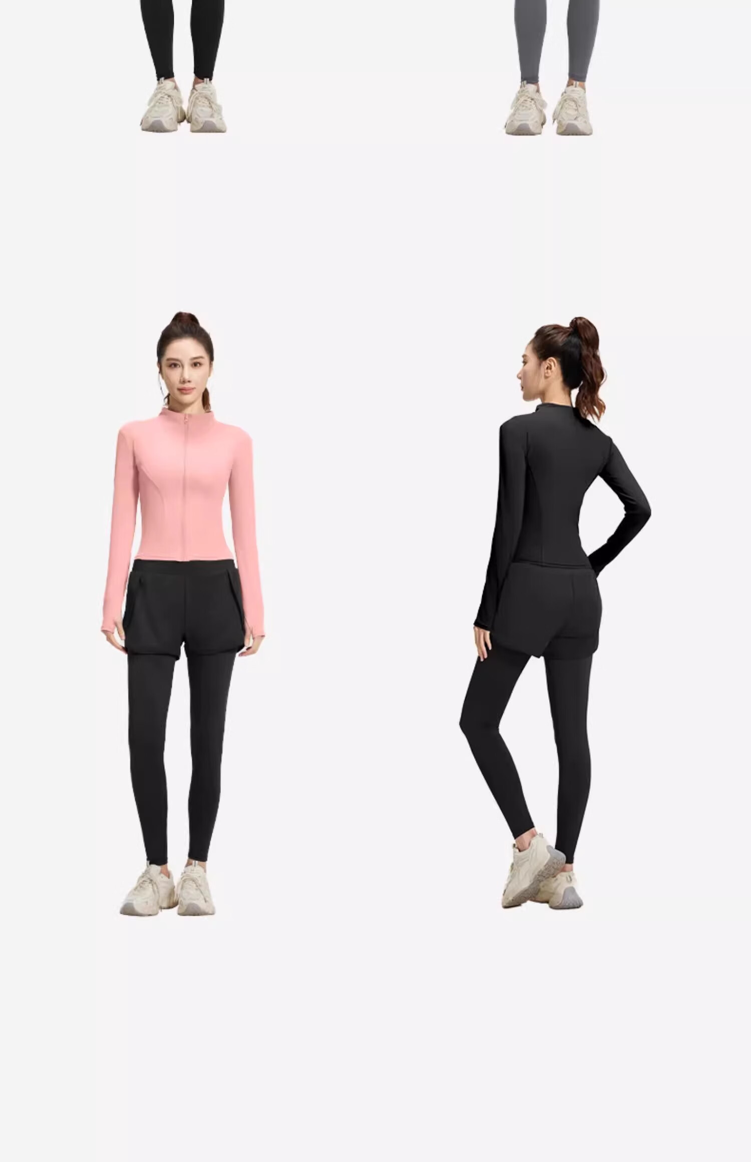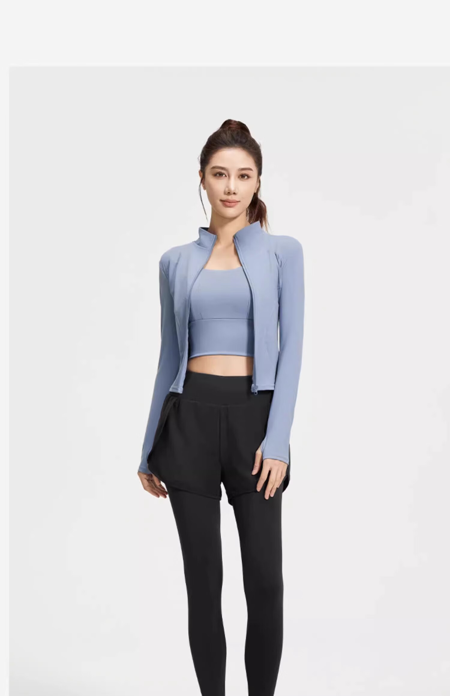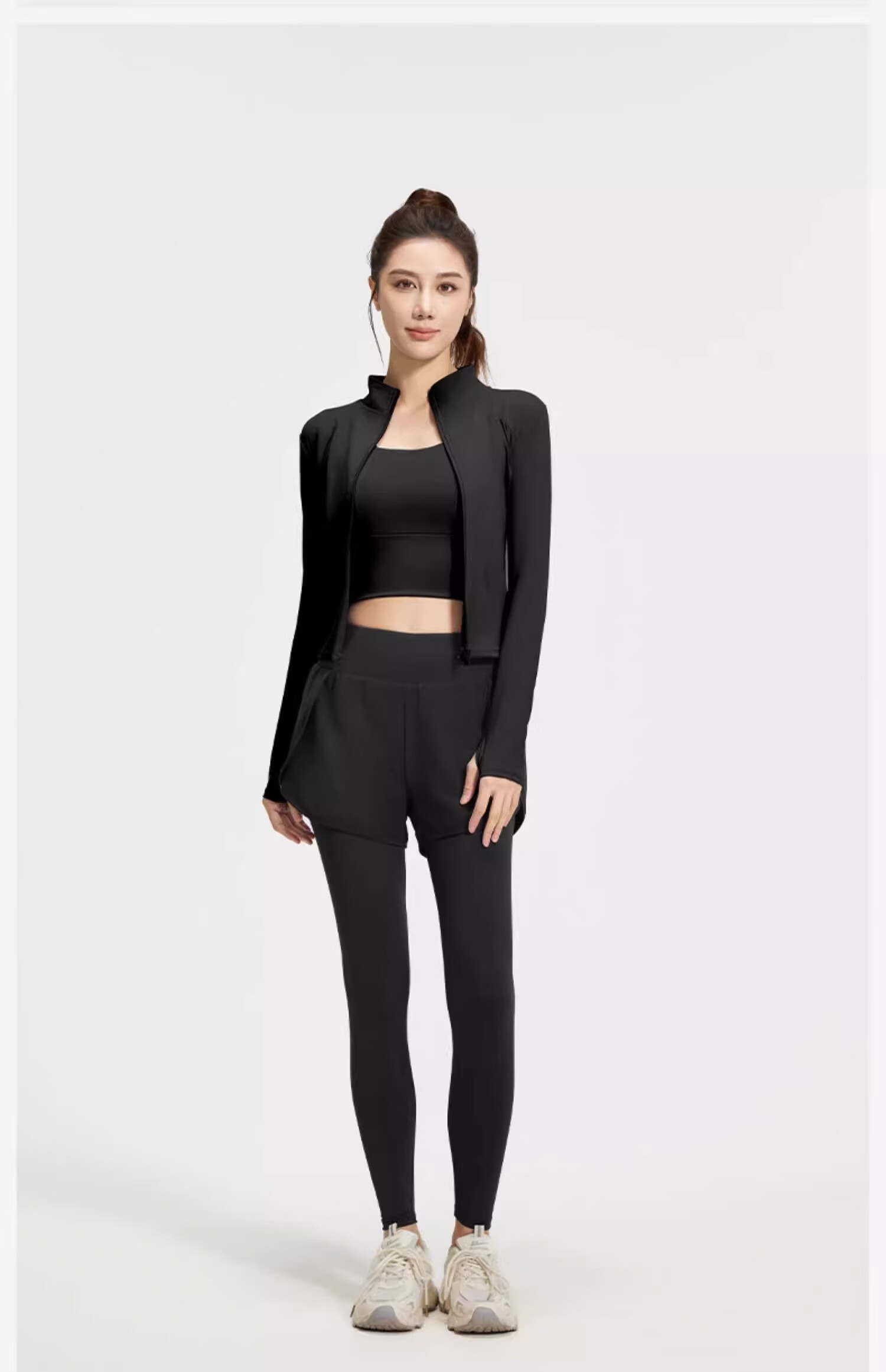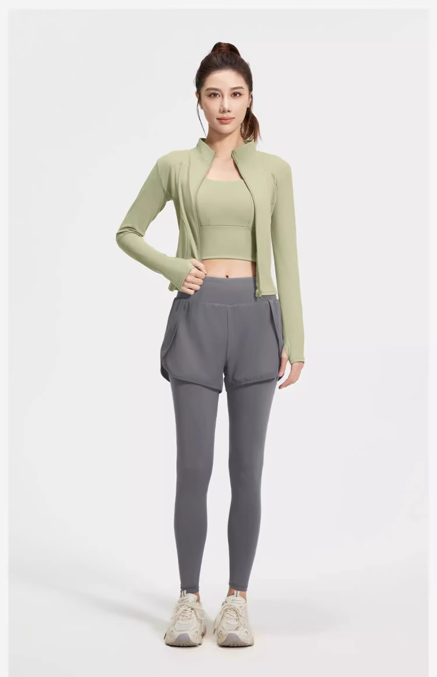 Yoga sportswear suit jacket fitness vest underwear fake two-piece trousers Pilates training suit running autumn and winter cardamom green + cardamom green + black jacket + fixed coaster bra + fake two-piece trousers M recommended 95-105 Jin Jin equals 0.5 kg