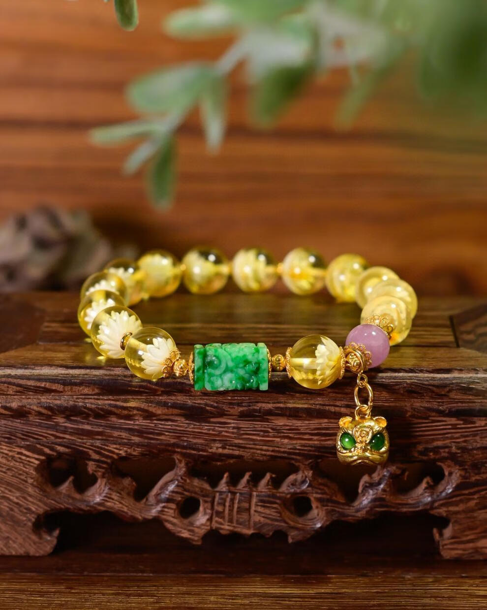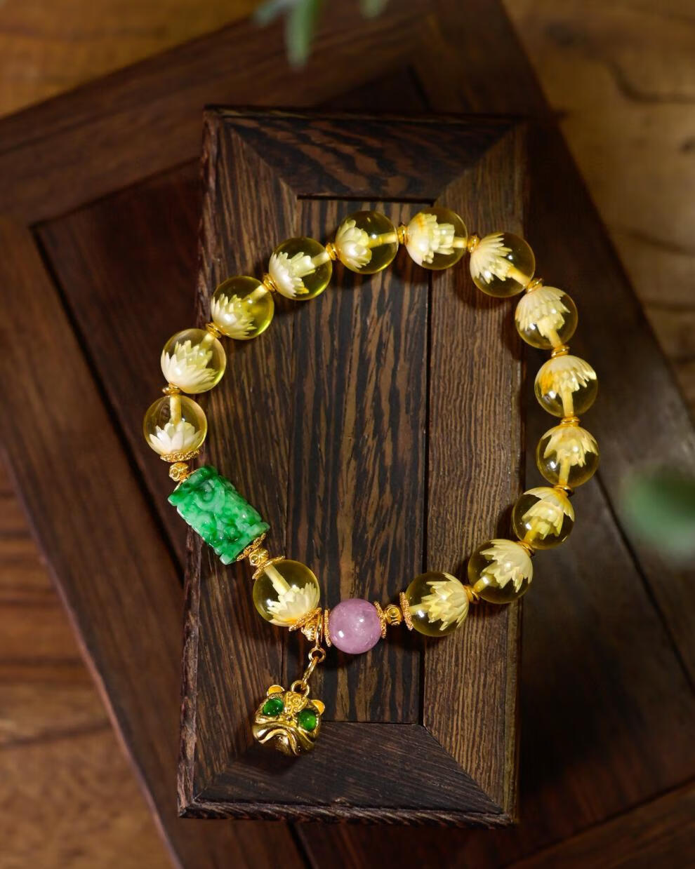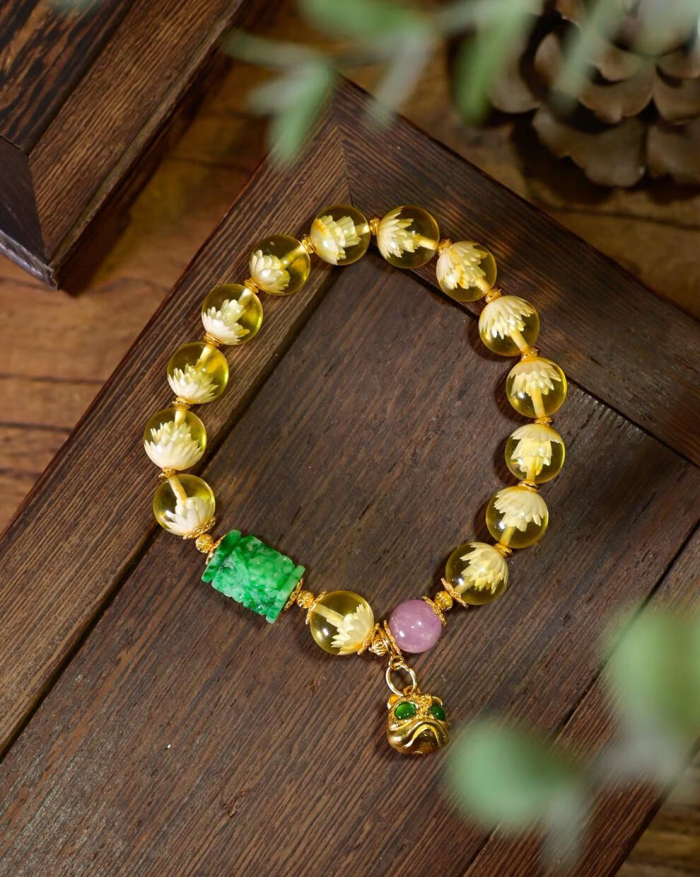 Yuze natural water purified gold amber bracelet, amber carved lotus bracelet, spicy green honey bucket beads, sterling silver gilt lion awakening pendant, natural beeswax lotus bracelet