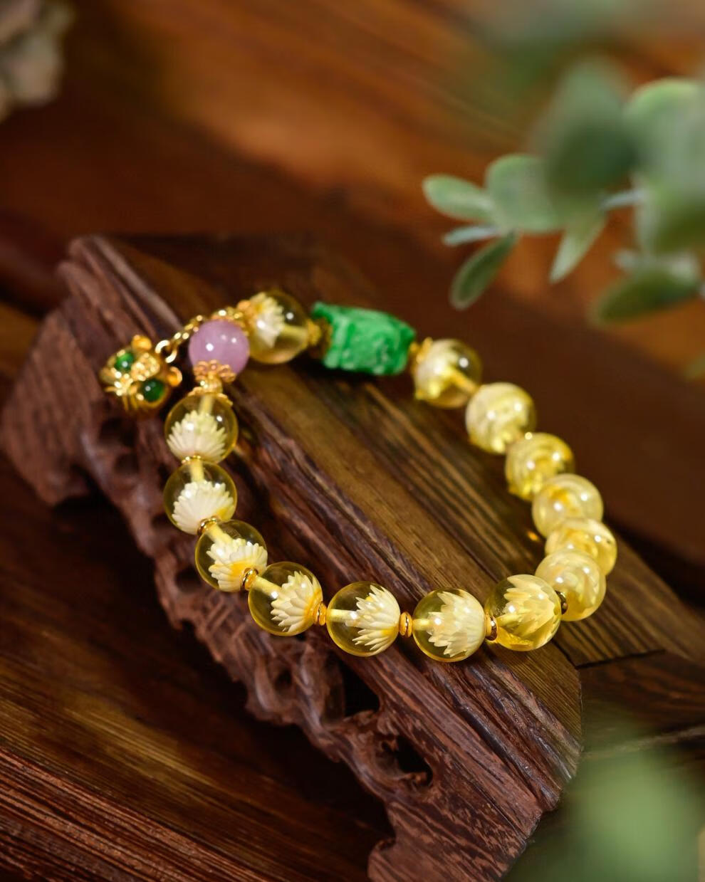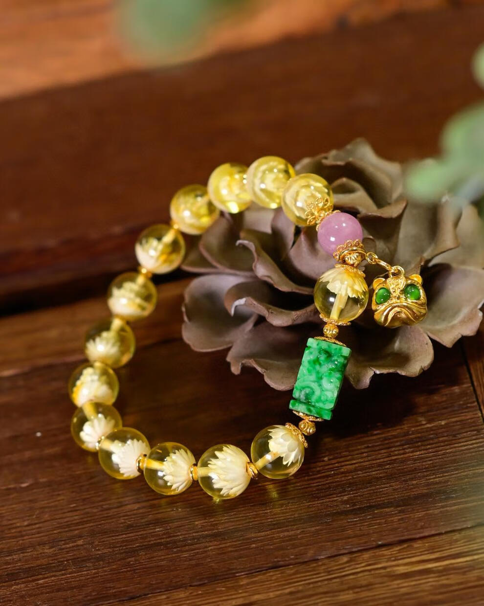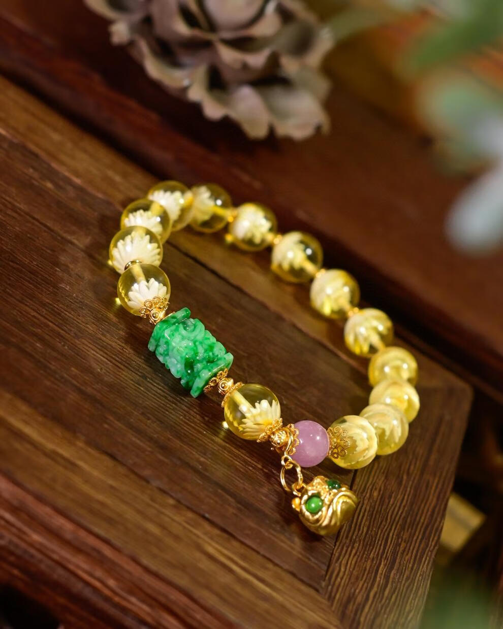 Yuze natural water purified gold amber bracelet, amber carved lotus bracelet, spicy green honey bucket beads, sterling silver gilt lion awakening pendant, natural beeswax lotus bracelet