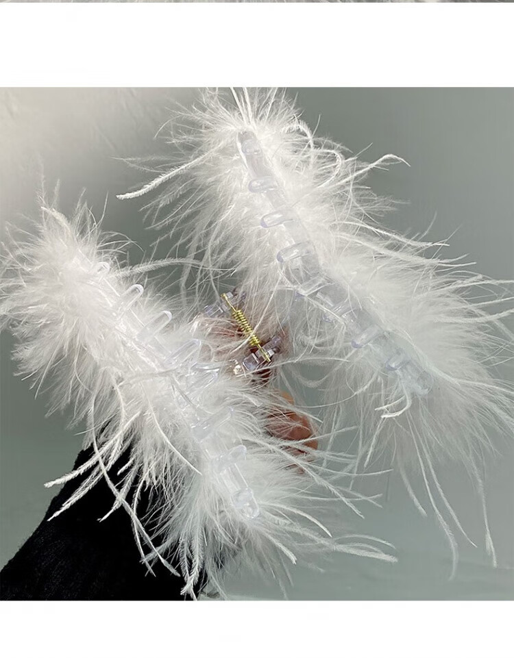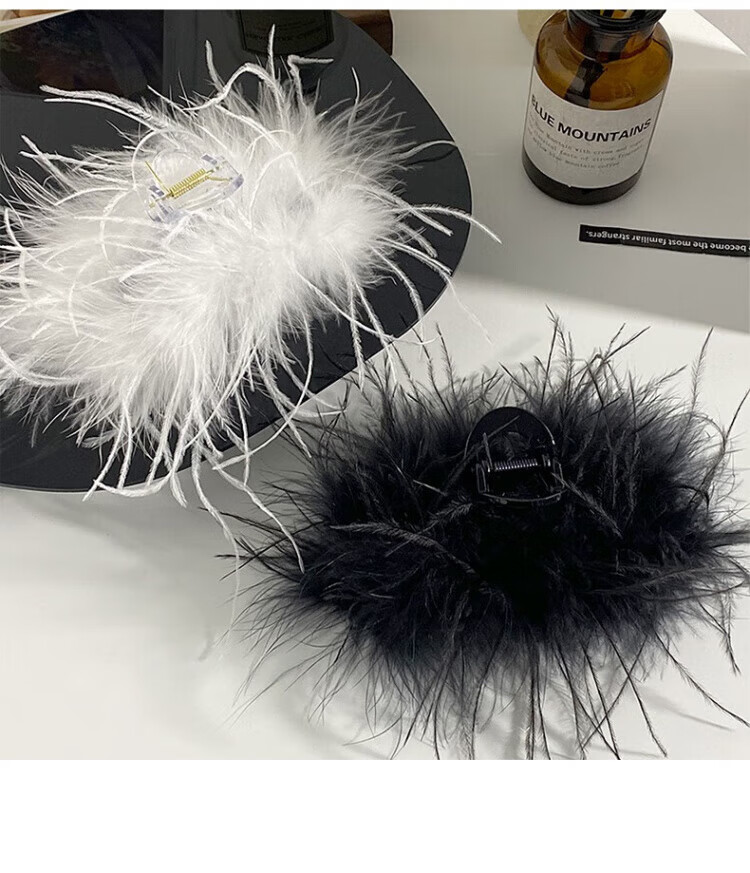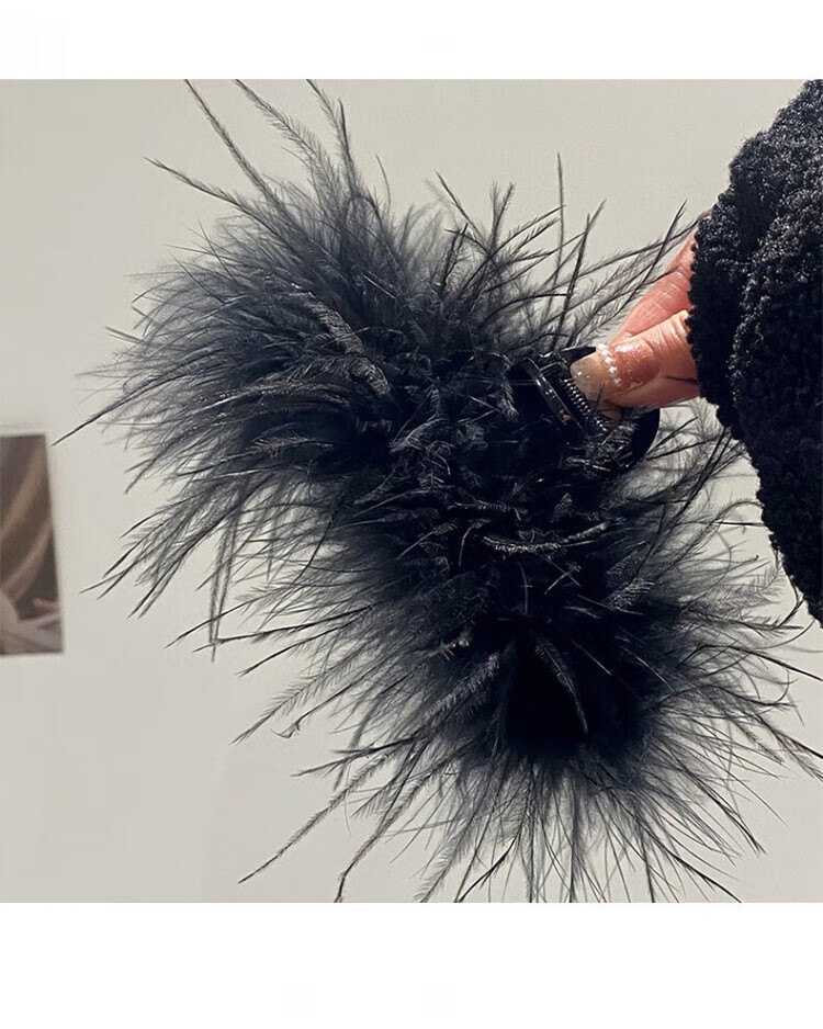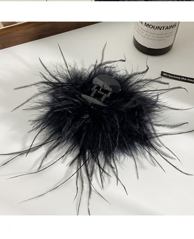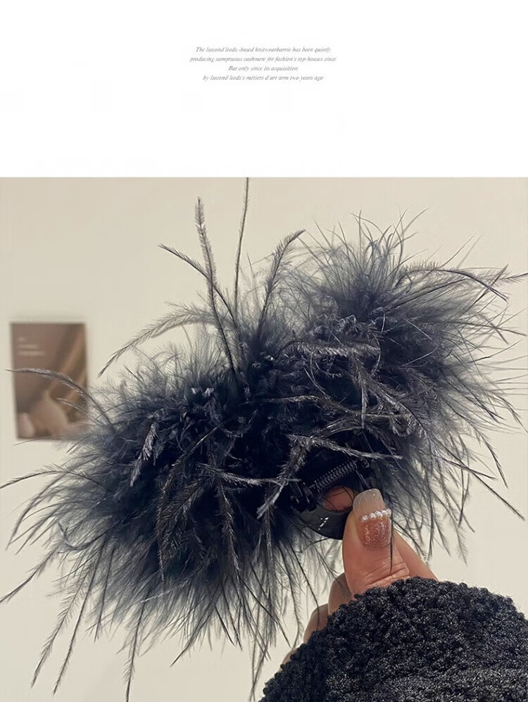 Xiaopanda Korean style ins style feather gripping hairpin for women ostrich hair clip for the back of the head plush shark clip hairpin black extra large size 13cm extra large base clip