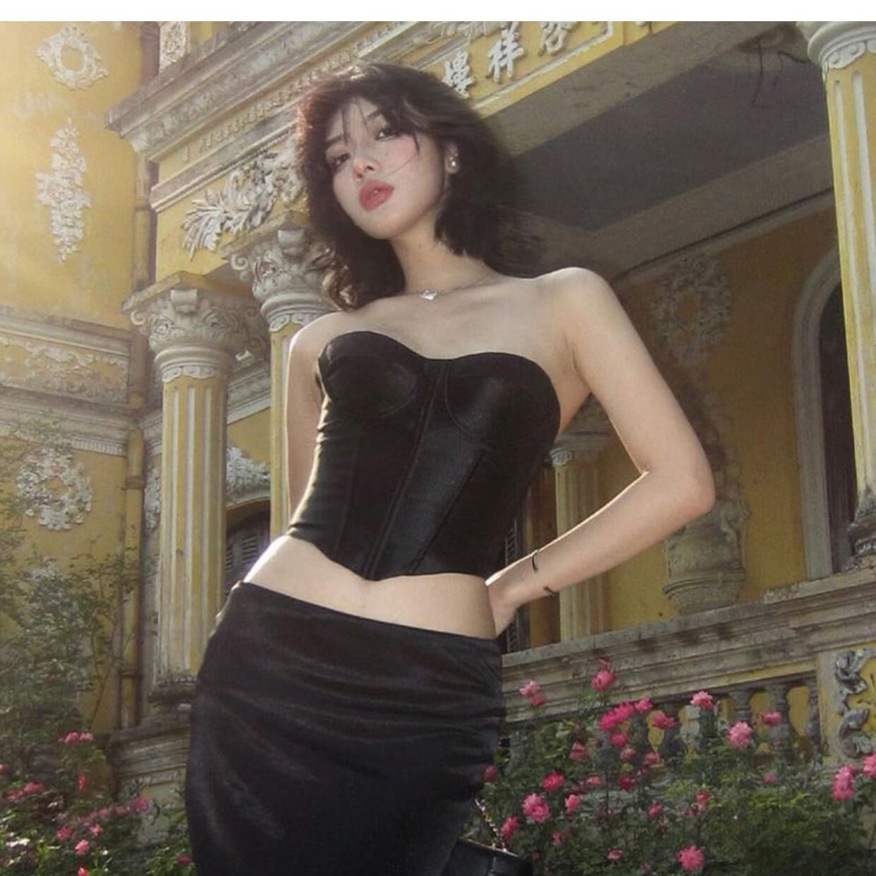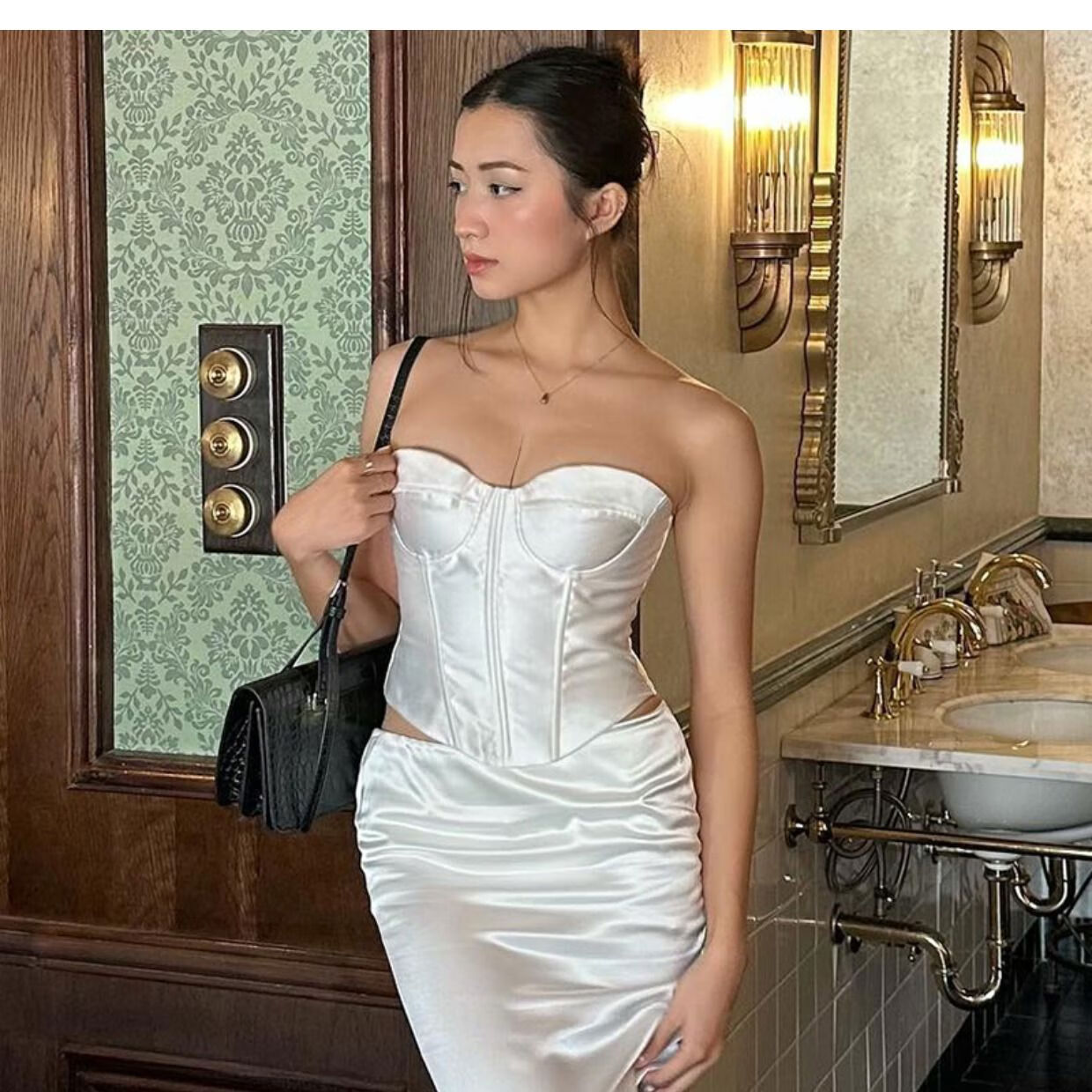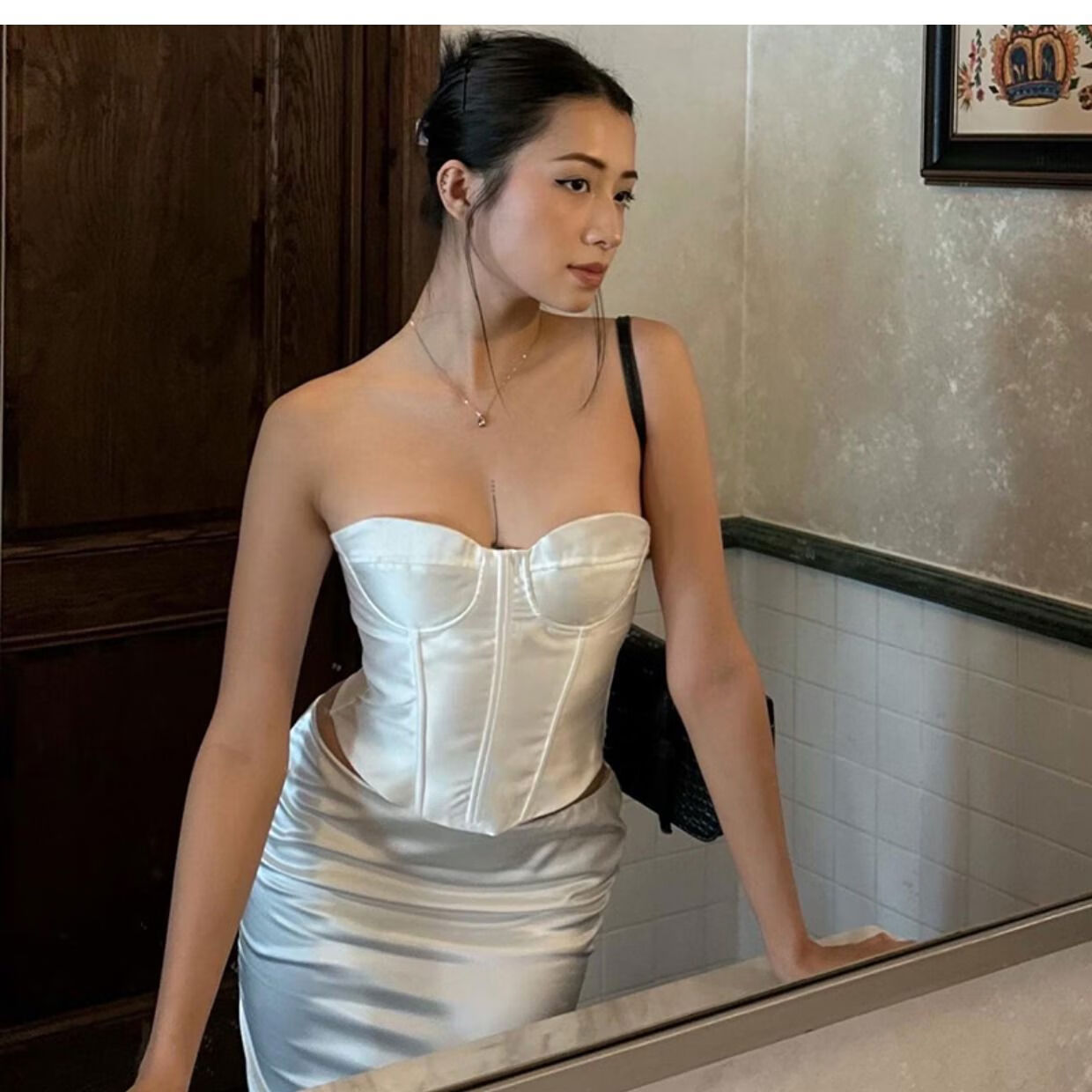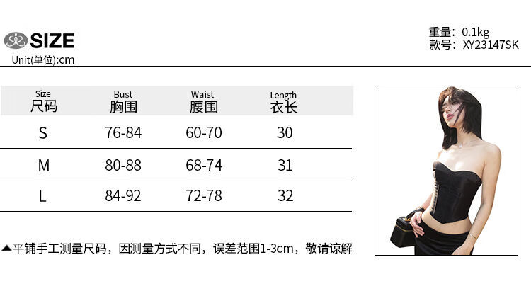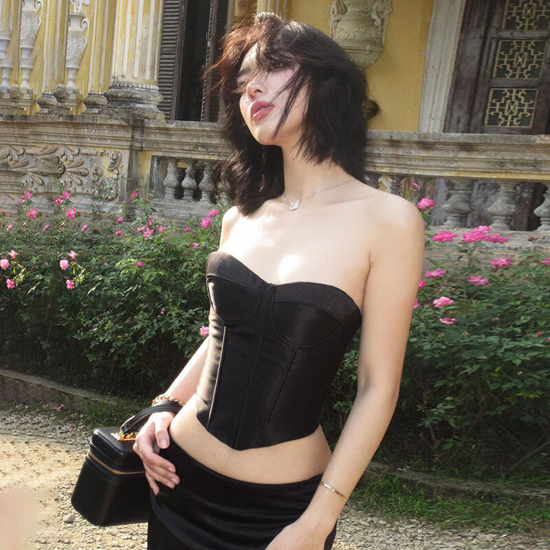 Satin black tube top for women, French style hot girl fishbone corset, beautiful little shirt for outer wear, black S