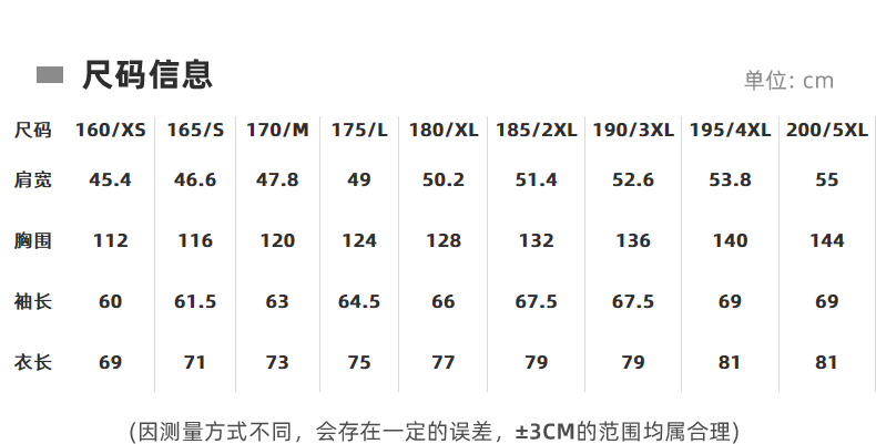 China (cm) 165 / 88-90 170 / 96-98 175 / 108-110 180 / 118-122 185 / 126-130
