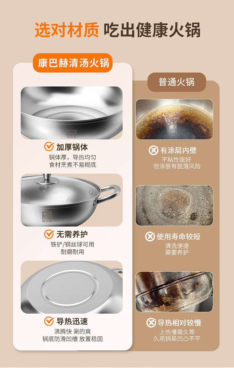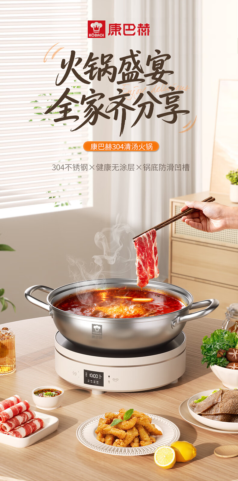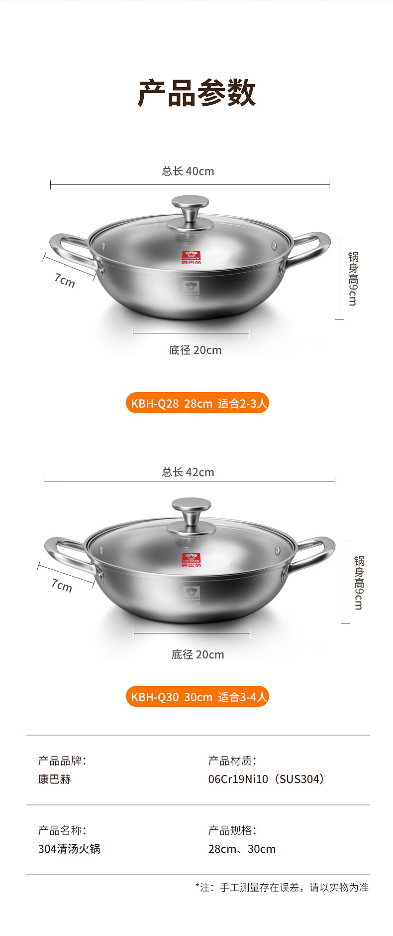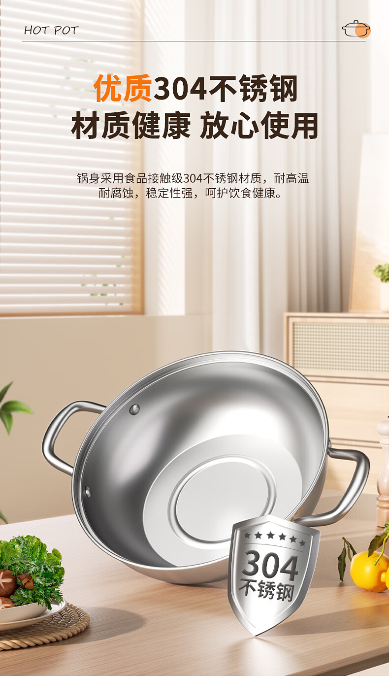 Kangbach hot pot 304 stainless steel uncoated thickened soup pot household hot pot pot for mutton shabu-shabu open flame induction cooker universal free soup spoon colander suitable for 2-3 people 28cm