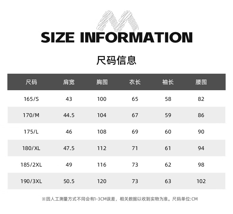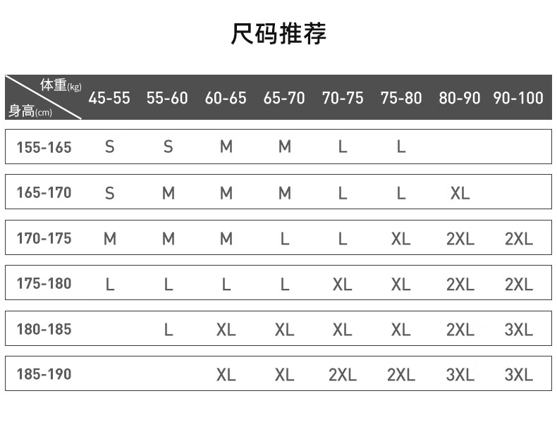 China (cm) 165 / 88-90 170 / 96-98 175 / 108-110 180 / 118-122 185 / 126-130
