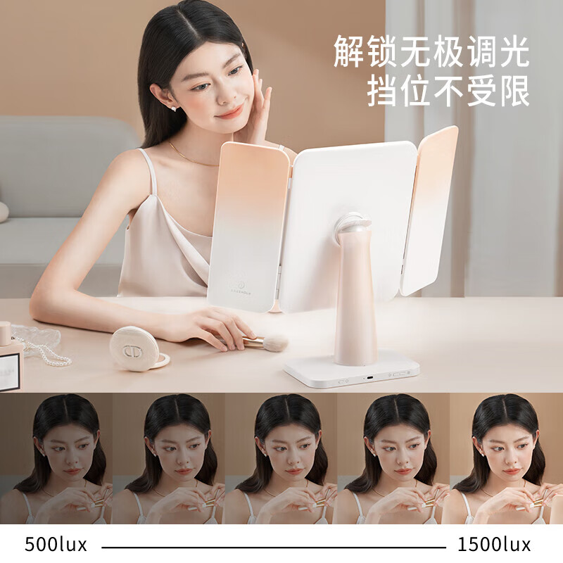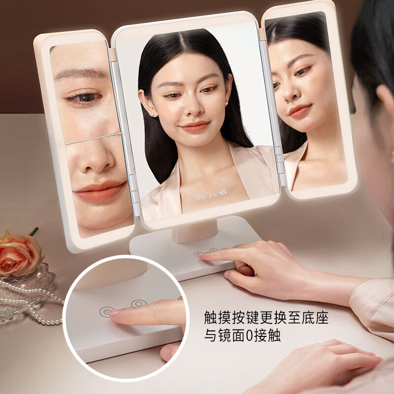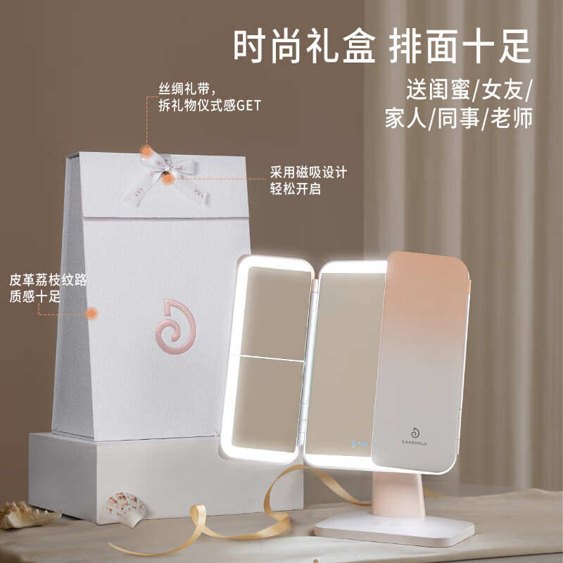 EASEHOLD three-sided folding shell mirror LED with light fill-in dressing table desktop makeup mirror teacher gift pearl white exclusive version 5000mah three-color light rechargeable
