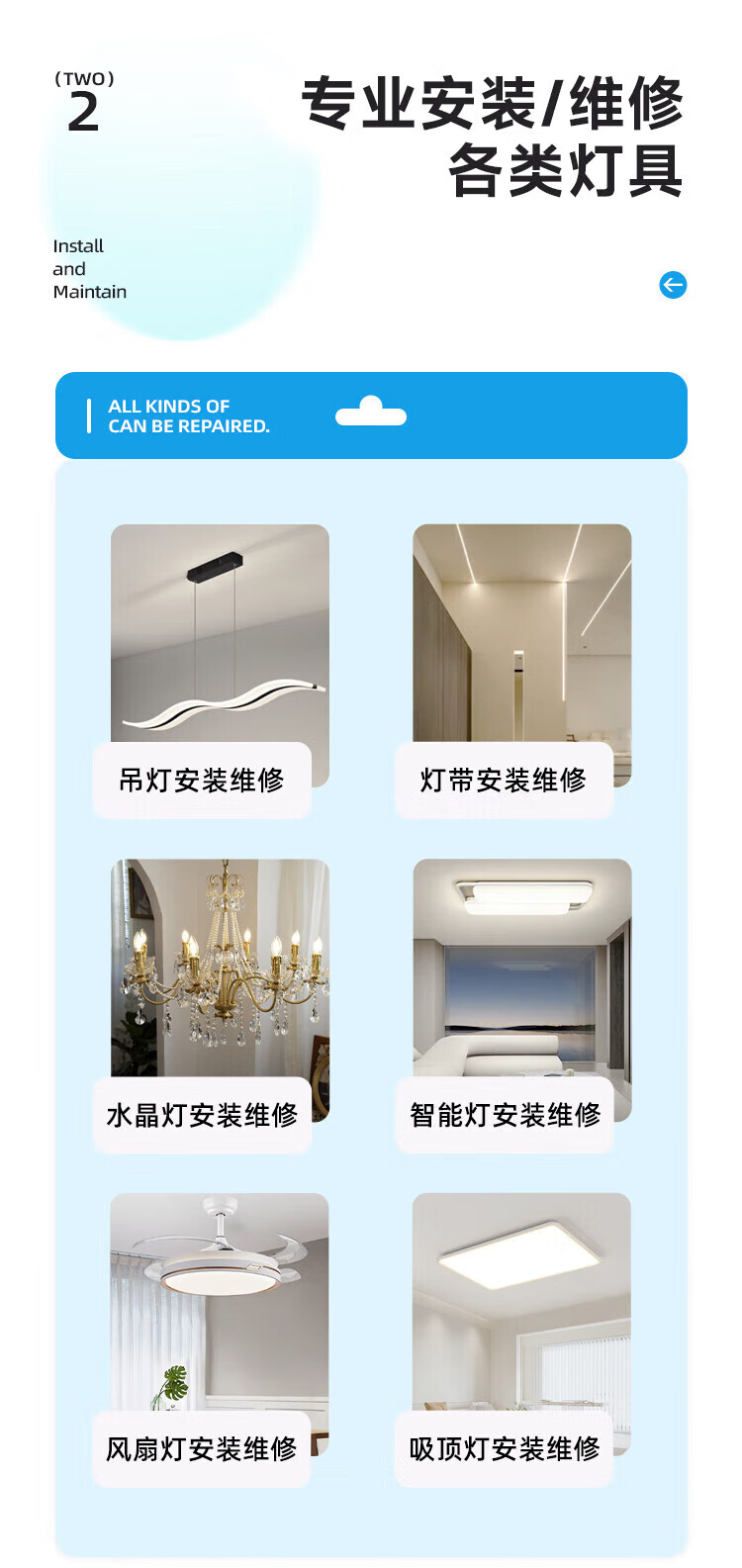 Lighting installation and repair door-to-door service Prepaid water and electricity repair installation bulb replacement door-to-door service Lighting repair