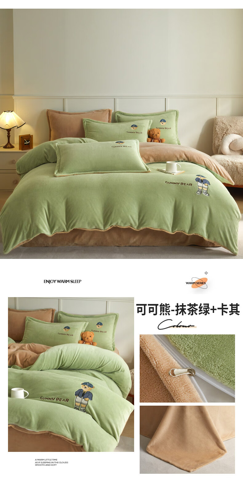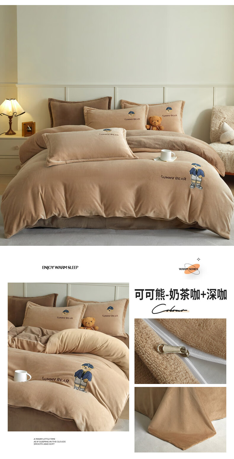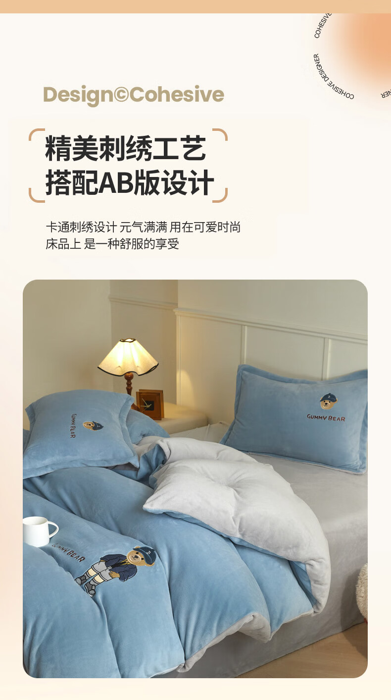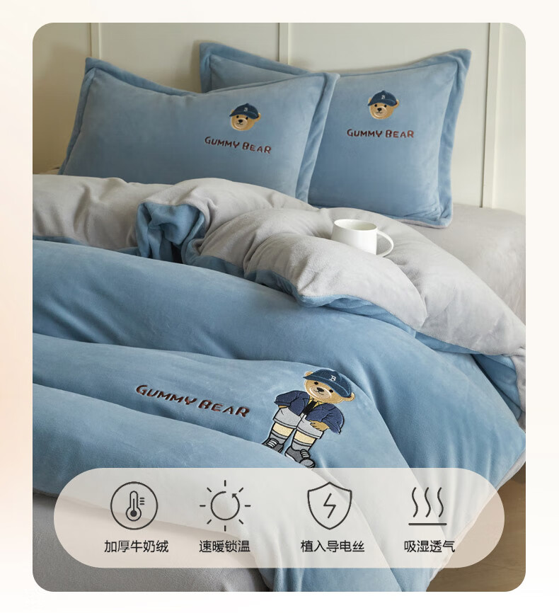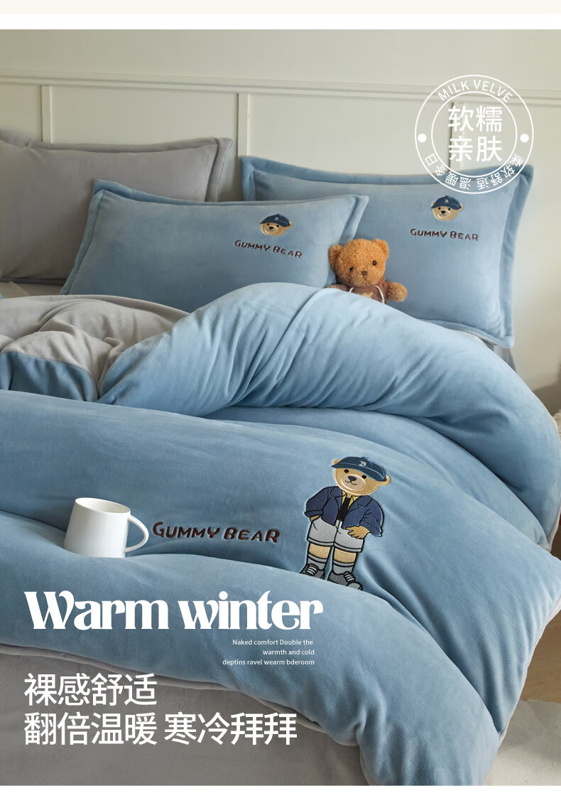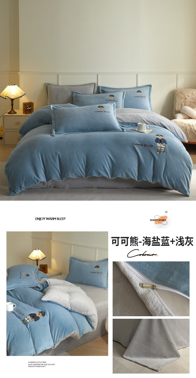 Mercury series 180 count high-end embroidered milk velvet bed four-piece set Class A baby velvet children's coral velvet quilt cover plus velvet Coco Bear - sea salt blue + light gray antistatic + thickened + no shedding 1.5m fitted sheet four-piece quilt cover 220*240 antistatic + thickened + no shedding