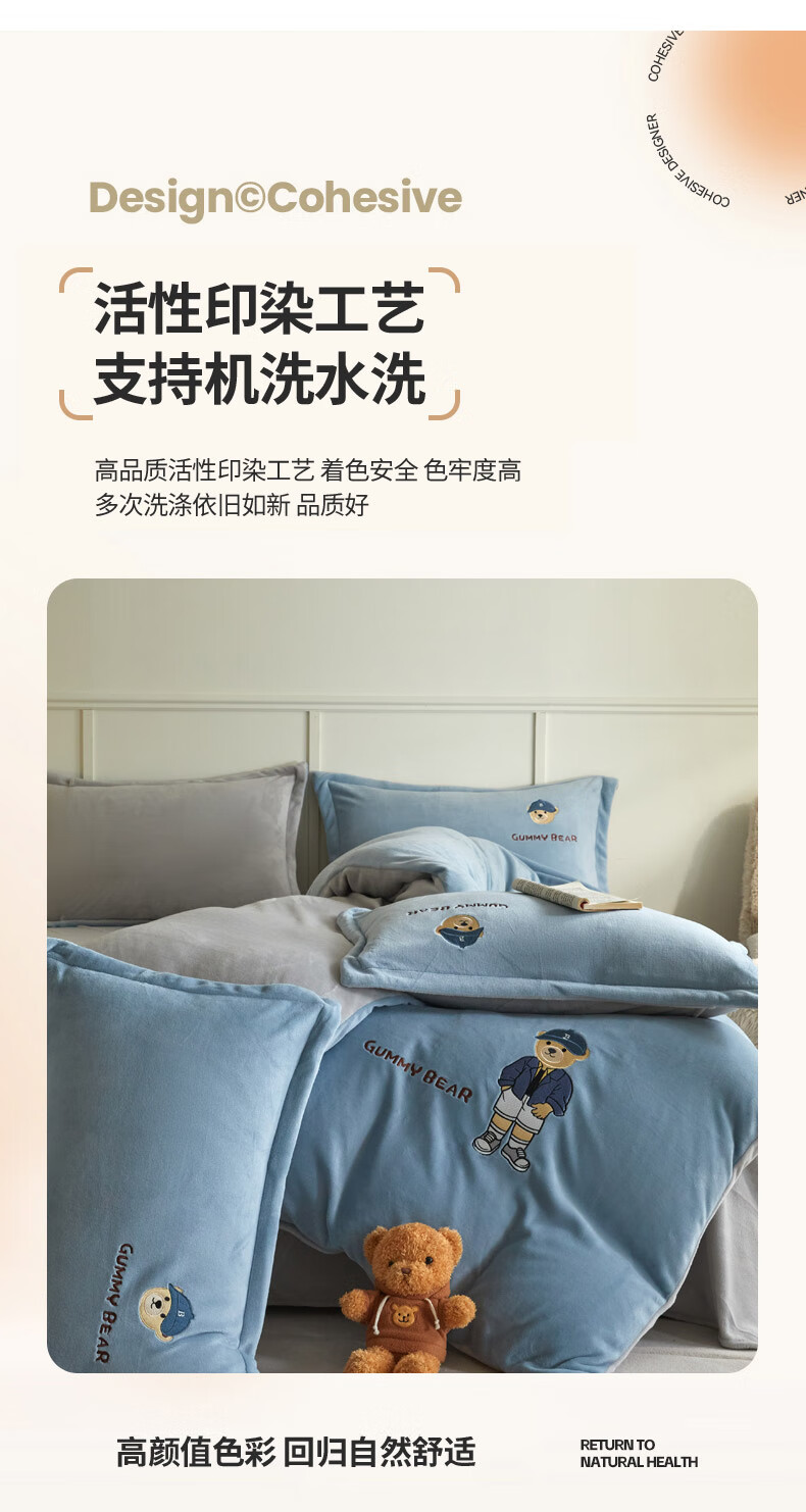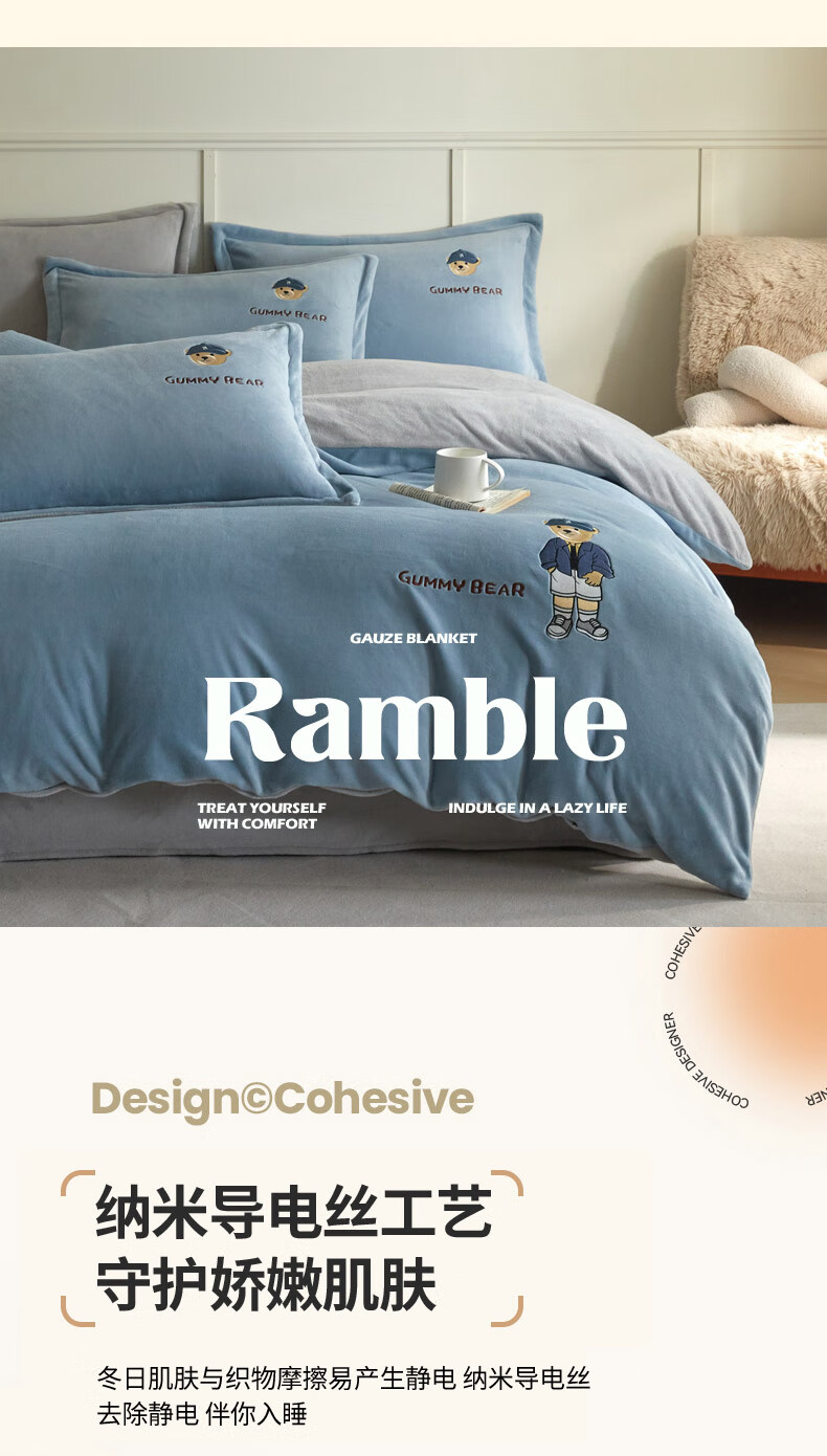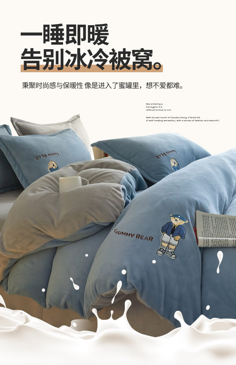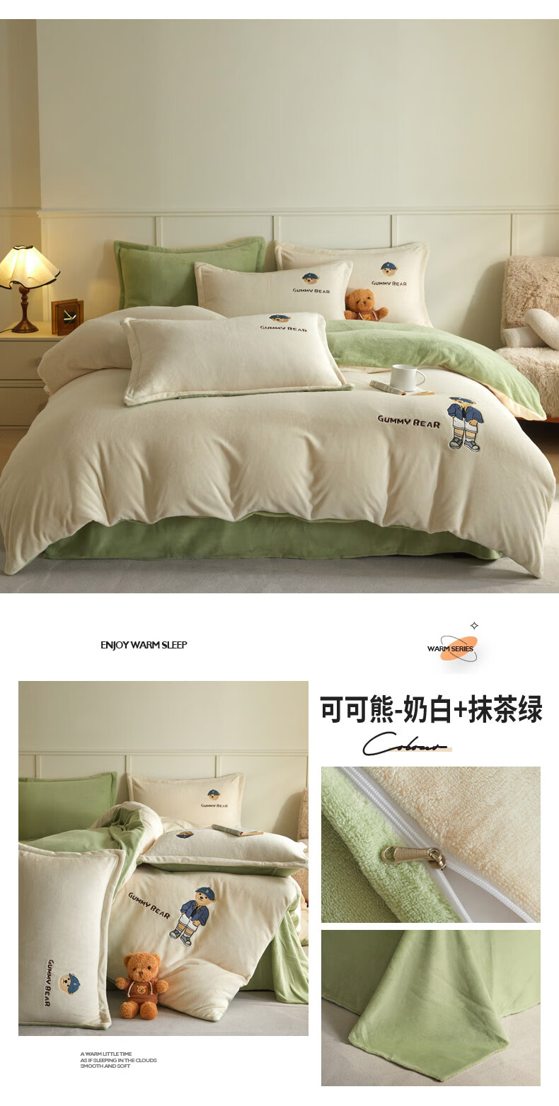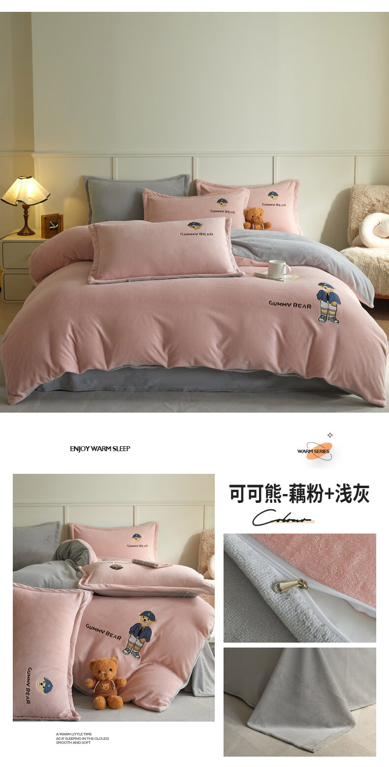 Mercury series 180 count high-end embroidered milk velvet bed four-piece set Class A baby velvet children's coral velvet quilt cover plus velvet Coco Bear - sea salt blue + light gray antistatic + thickened + no shedding 1.5m fitted sheet four-piece quilt cover 220*240 antistatic + thickened + no shedding