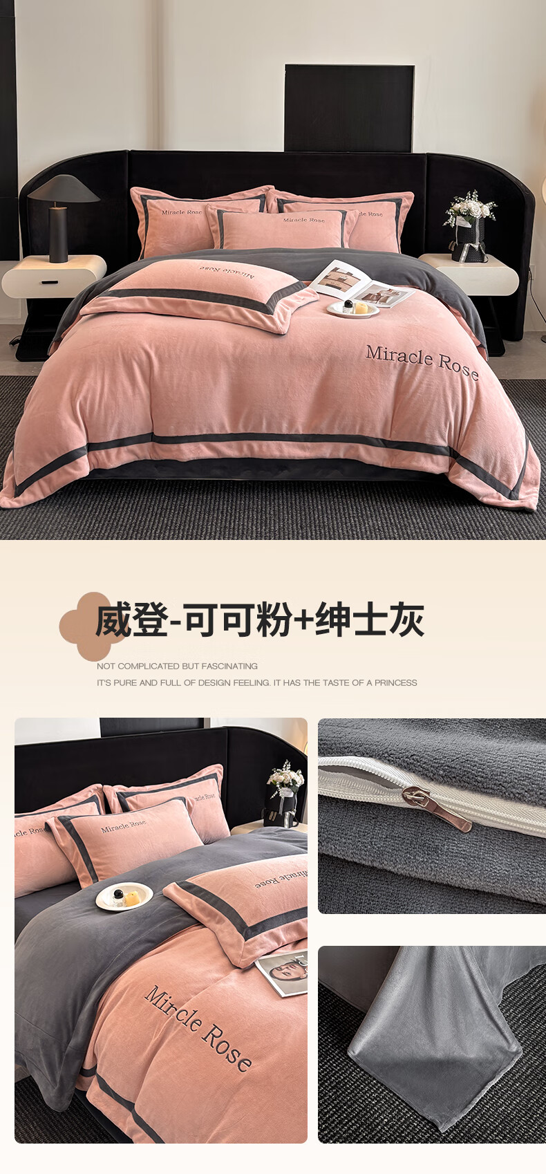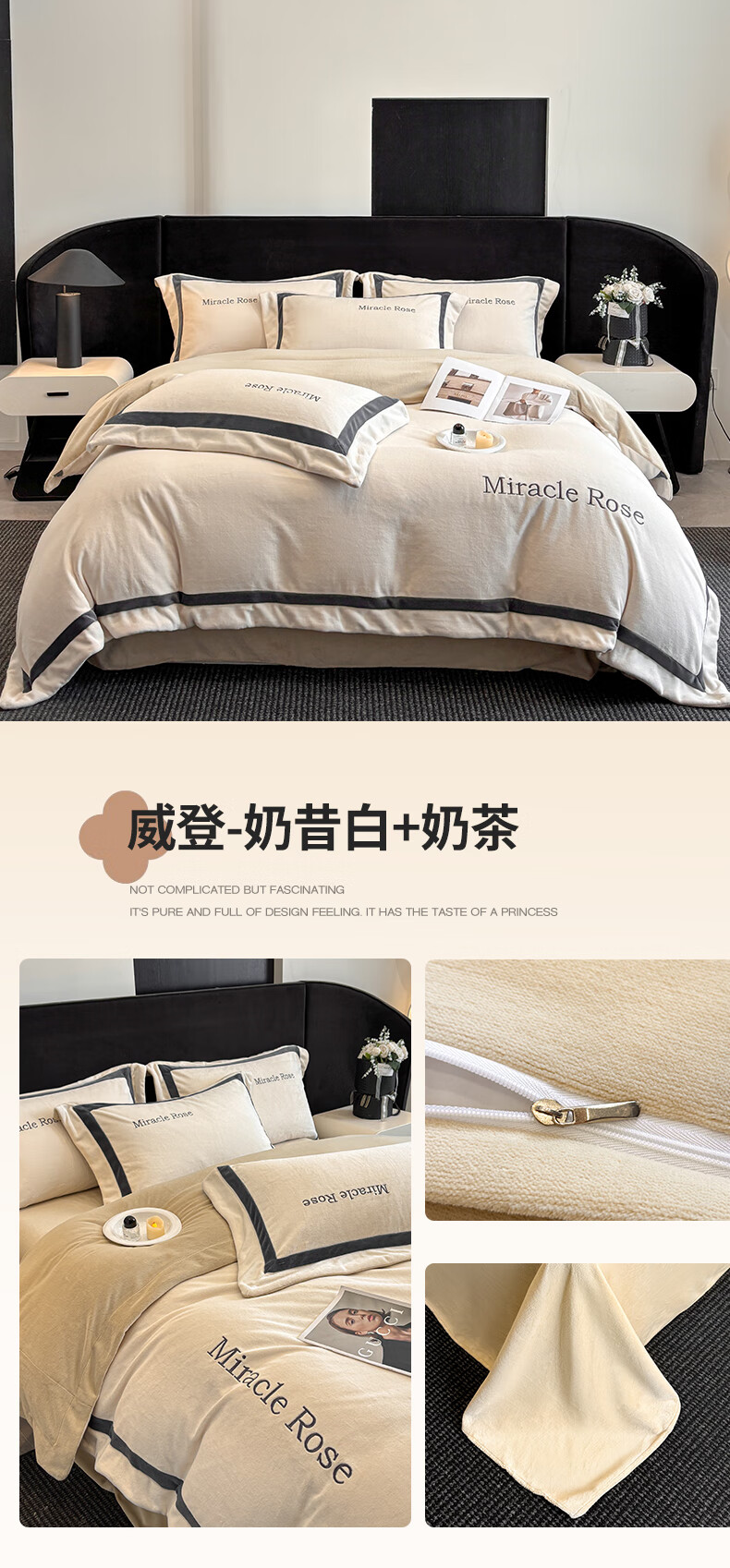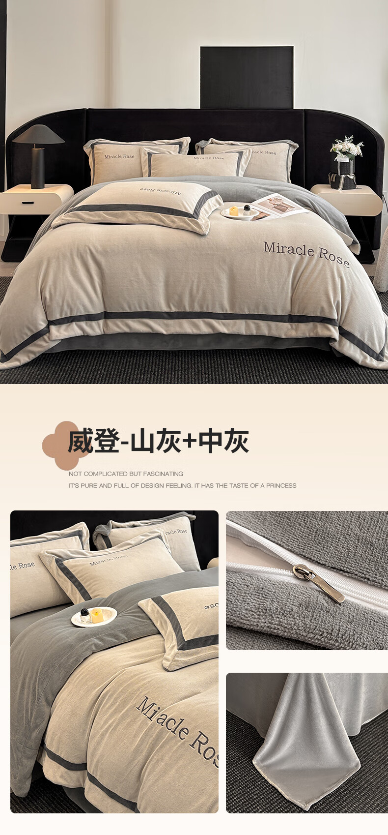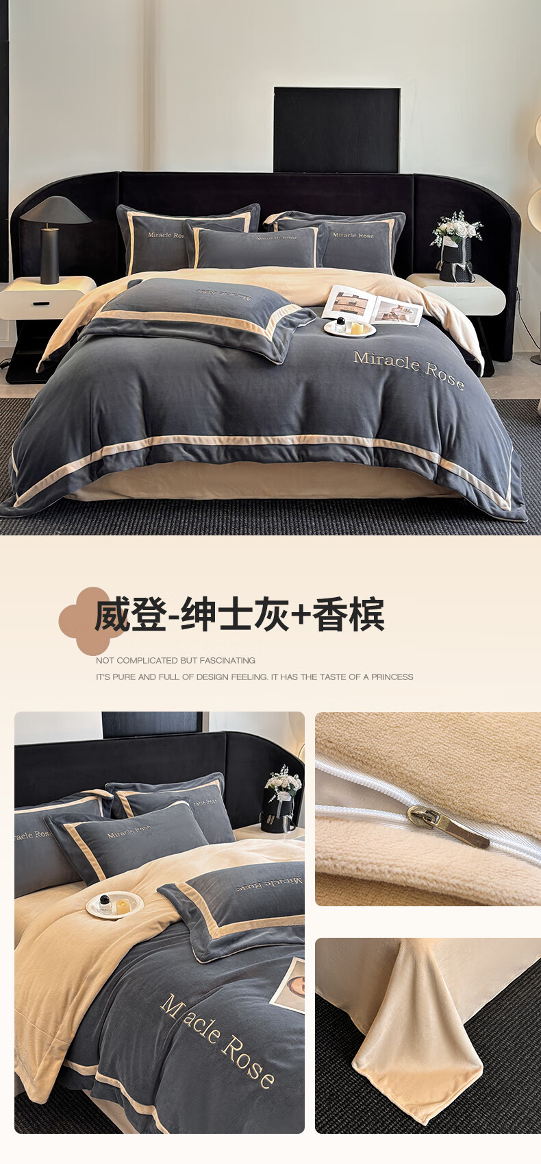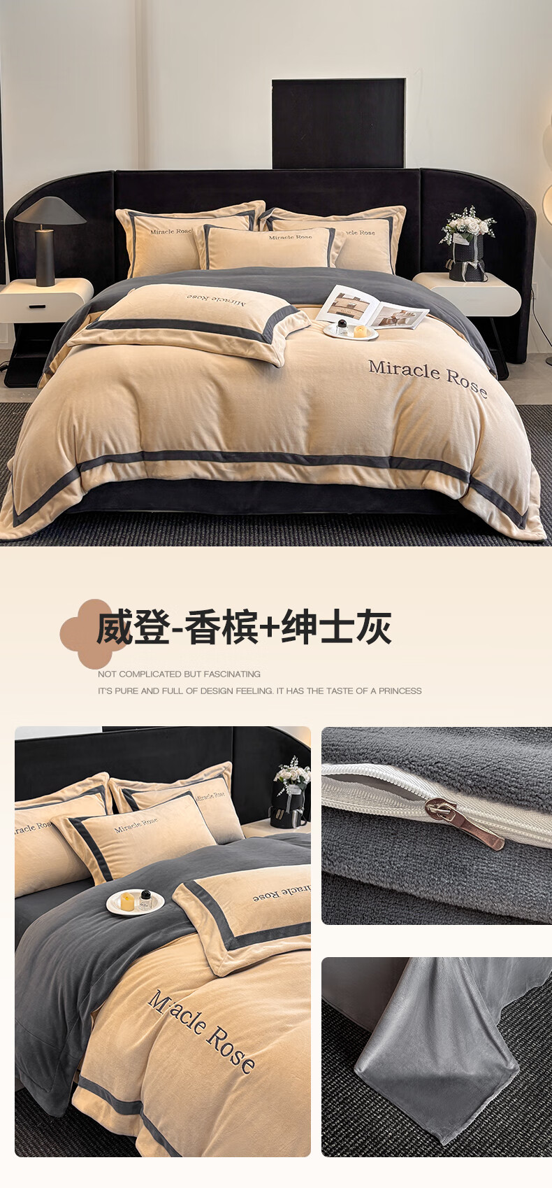 Mercury series 200-count high-end embroidered milk velvet four-piece set, Class A flannel coral velvet bed sheet, double-sided velvet quilt cover, autumn Vuitton-champagne + gentleman gray, anti-static + thickened + no lint, 1.5m bed sheet style four-piece set, anti-static + thickened + no lint
