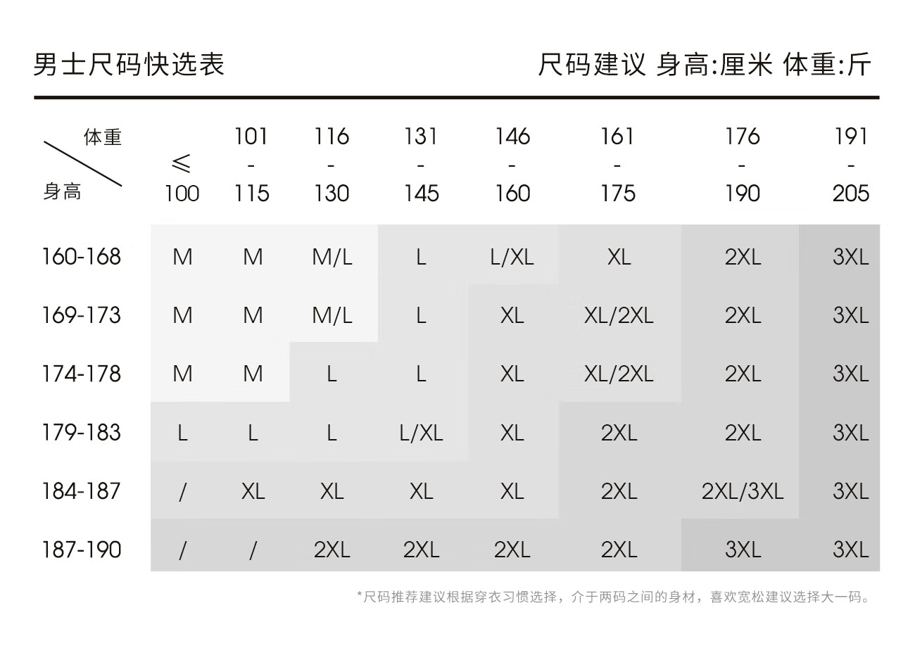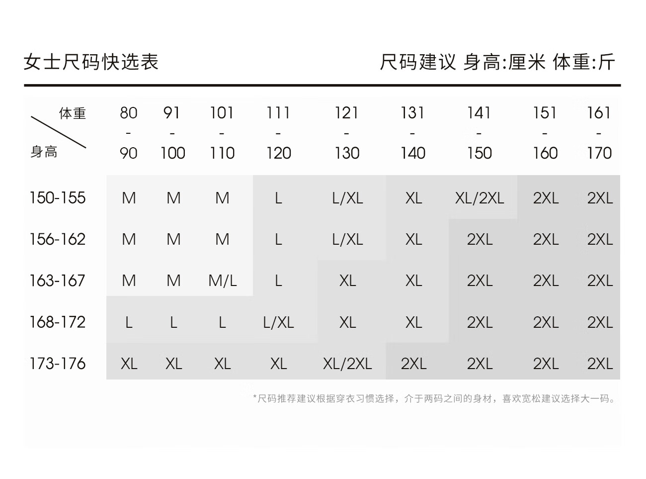 China (cm) 160-165/84-86 165-170 / 88-90 167-172 / 92-96 168-173 / 98-102 170-176 / 106-110