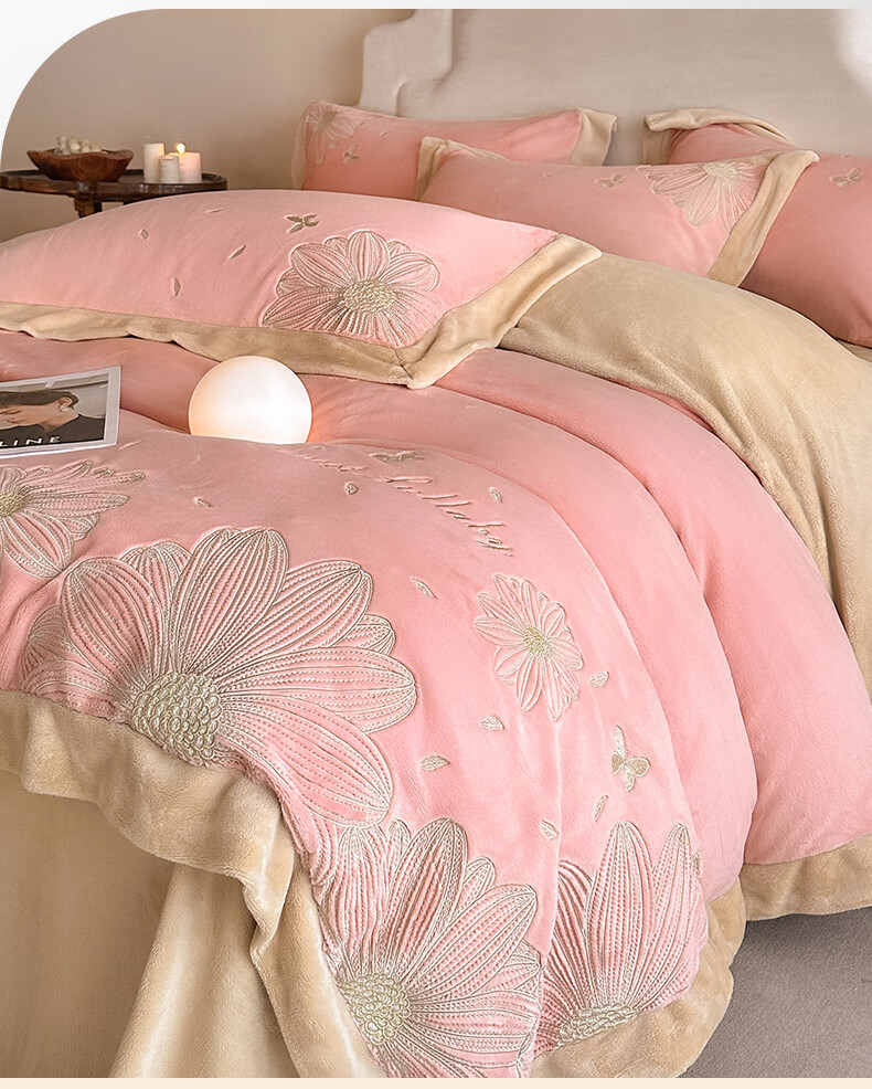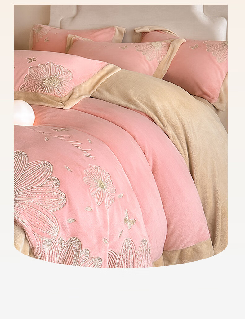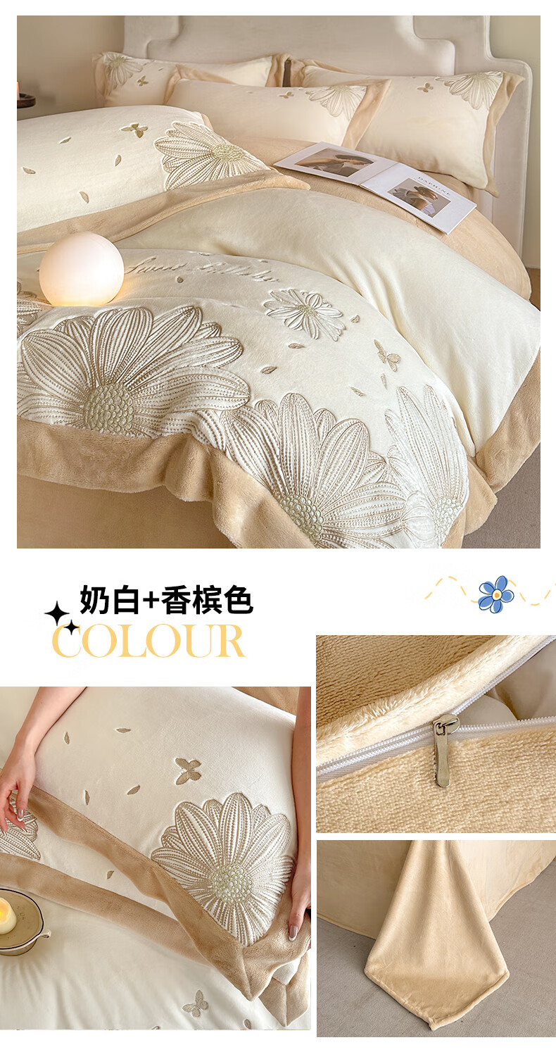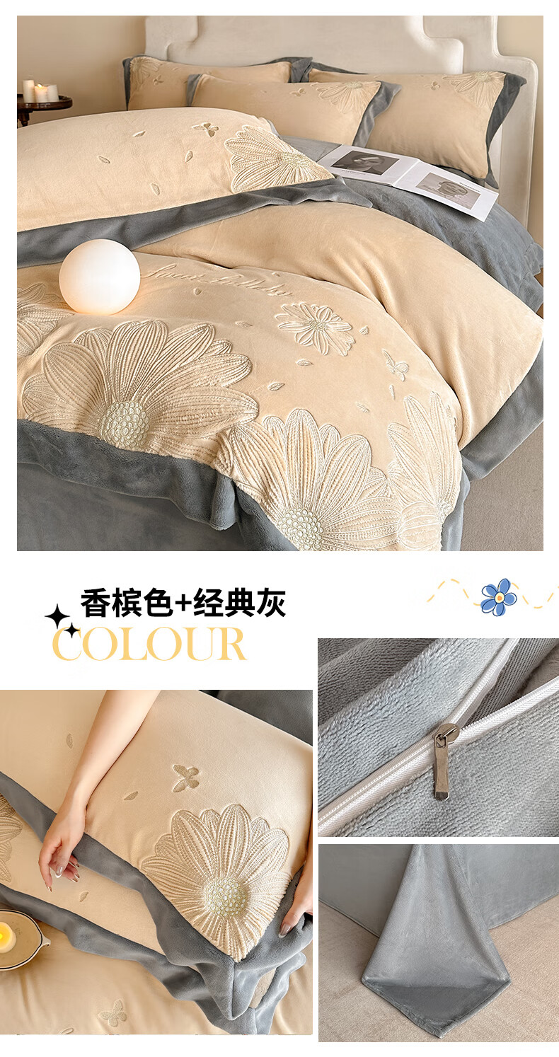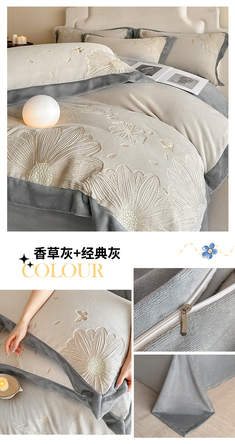 Mercury Series 200 Count Class A Embroidered Milk Velvet Four-piece Set Thickened Winter Coral Velvet Flannel Plus Velvet Bed Sheet Cover Vanilla Gray + Classic Gray Antistatic + Thickened + No Shedding 2.0m Sheet Style Four-piece Set Antistatic + Thickened + No Shedding
