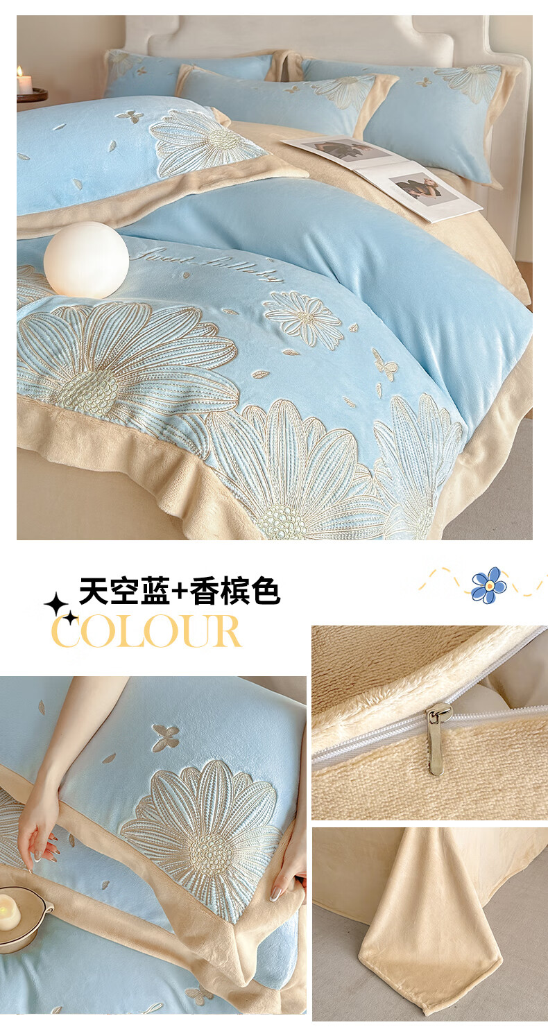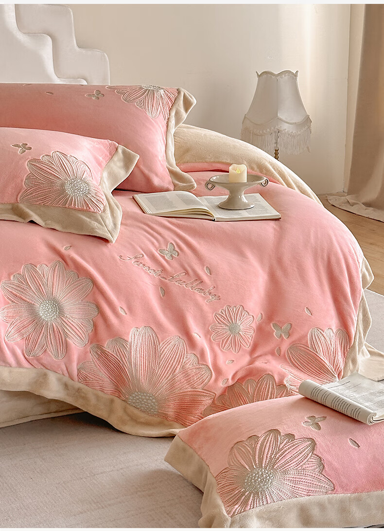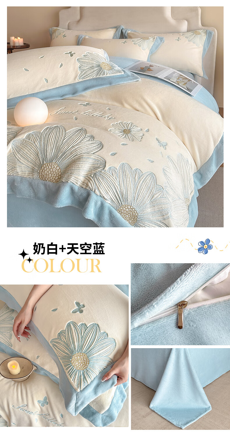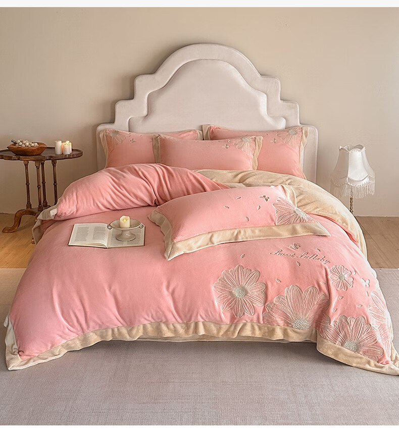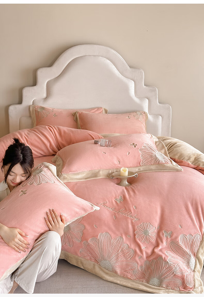 Mercury Series 200 Count Class A Embroidered Milk Velvet Four-piece Set Thickened Winter Coral Velvet Flannel Plus Velvet Bed Sheet Cover Vanilla Gray + Classic Gray Antistatic + Thickened + No Shedding 2.0m Sheet Style Four-piece Set Antistatic + Thickened + No Shedding