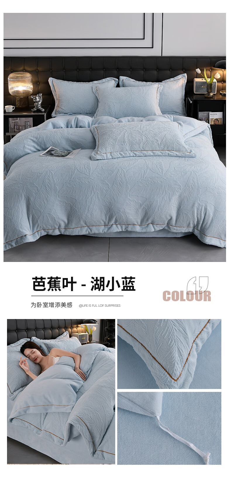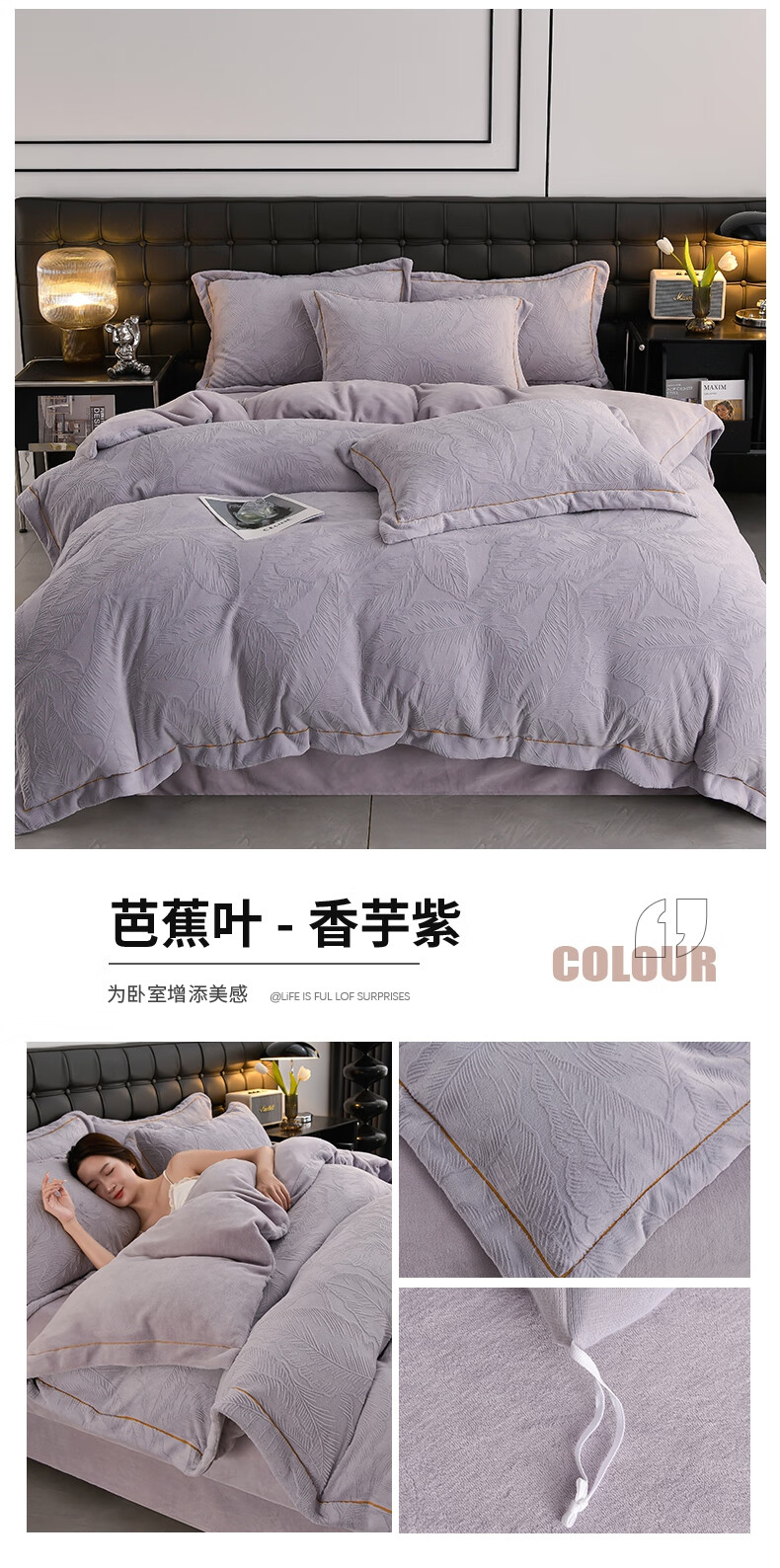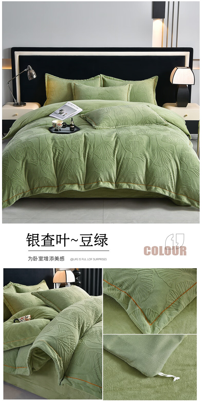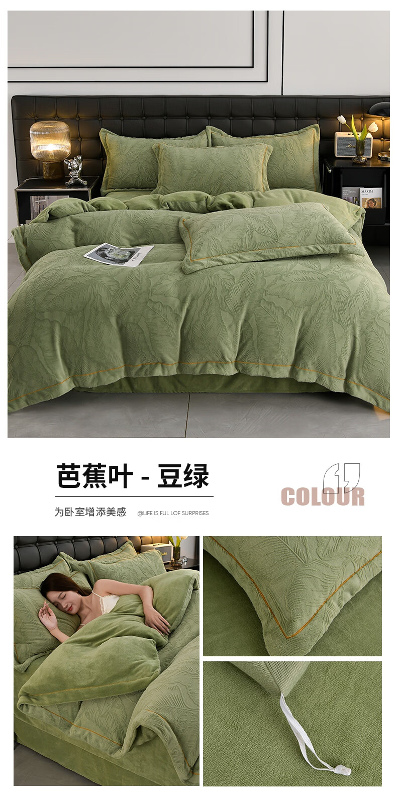 Mercury Series A Type Winter Thickened Carved Milk Four-piece Set Warm Coral Double-sided Velvet Plus Velvet Quilt Cover Sheet Bed Banana Leaf-Bean Green Antistatic + Thickened + No Shedding 1.8m Fitted Sheet Four-piece Set Antistatic + Thickened + No Shedding