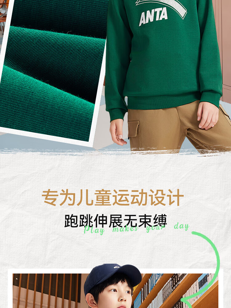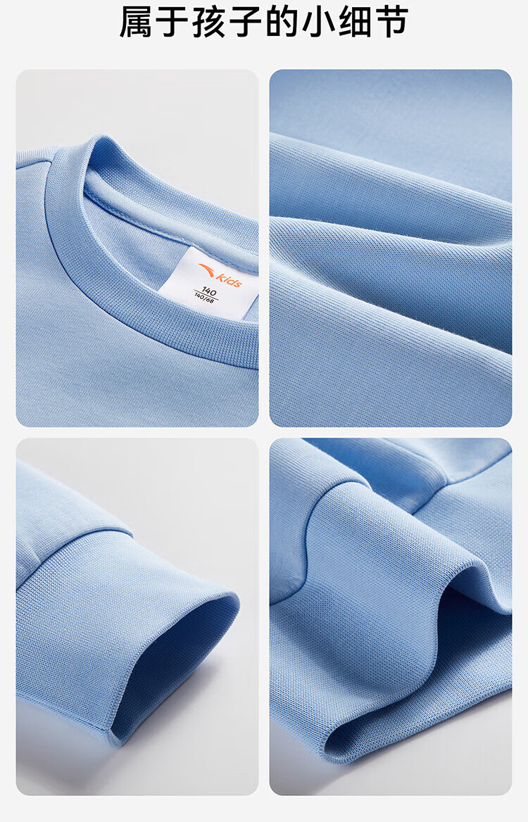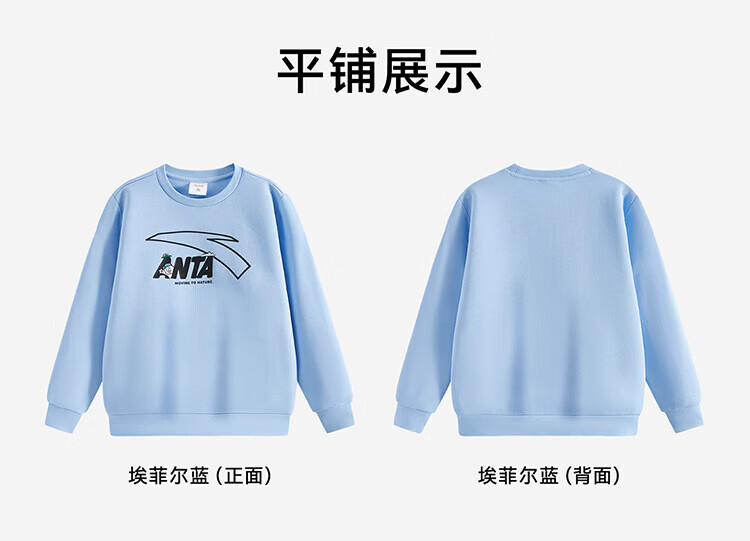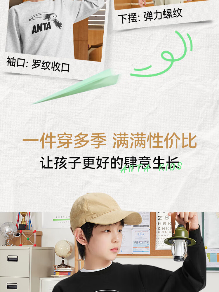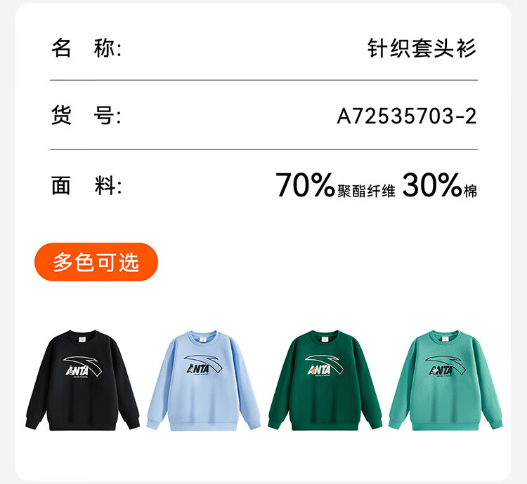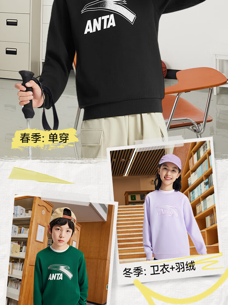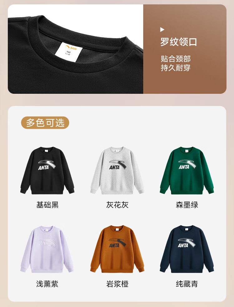 ANTA children's sports sweatshirt for men, women, middle and large children 2025 spring and autumn new cotton skin-friendly loose and comfortable long-sleeved top black velvet colorful 165 cm