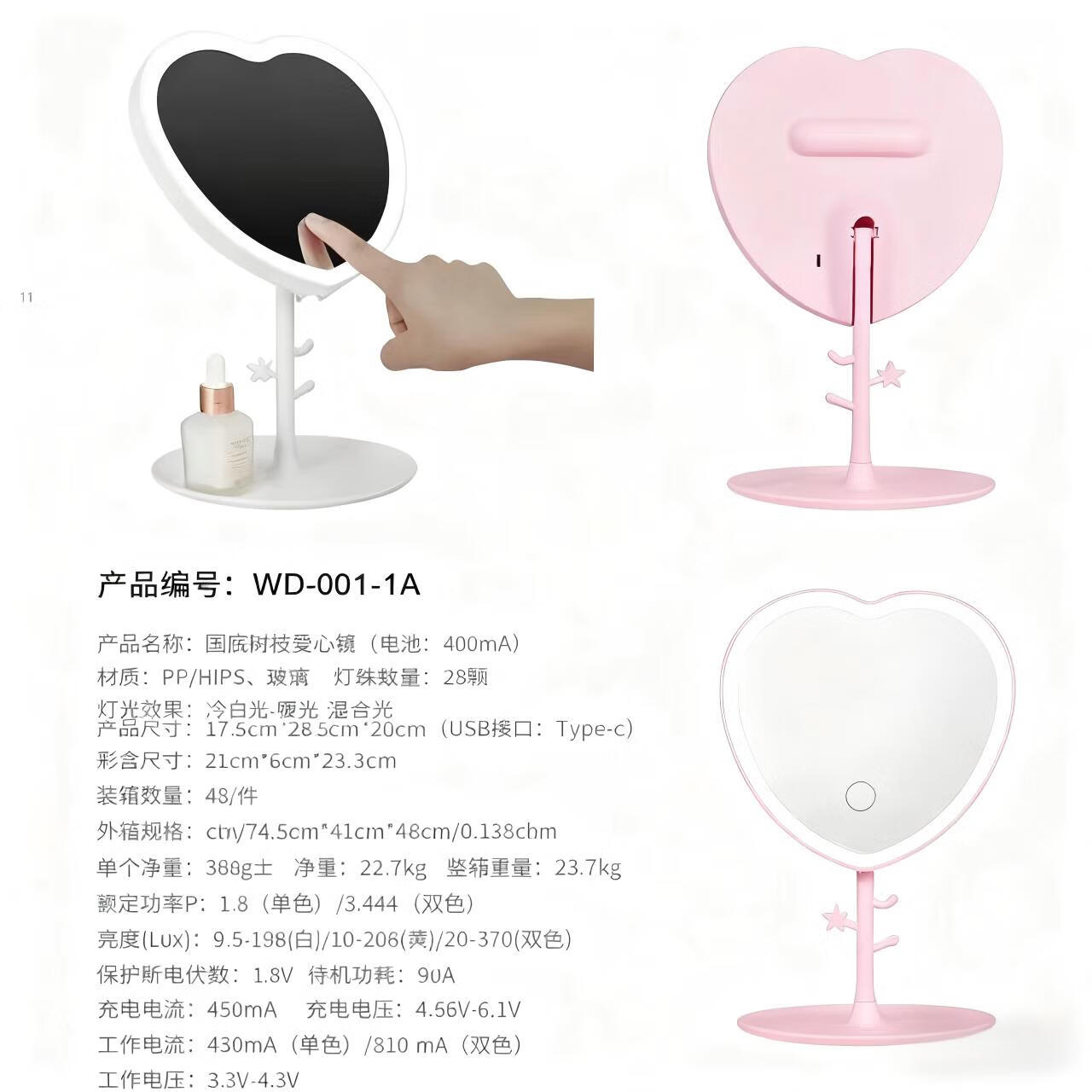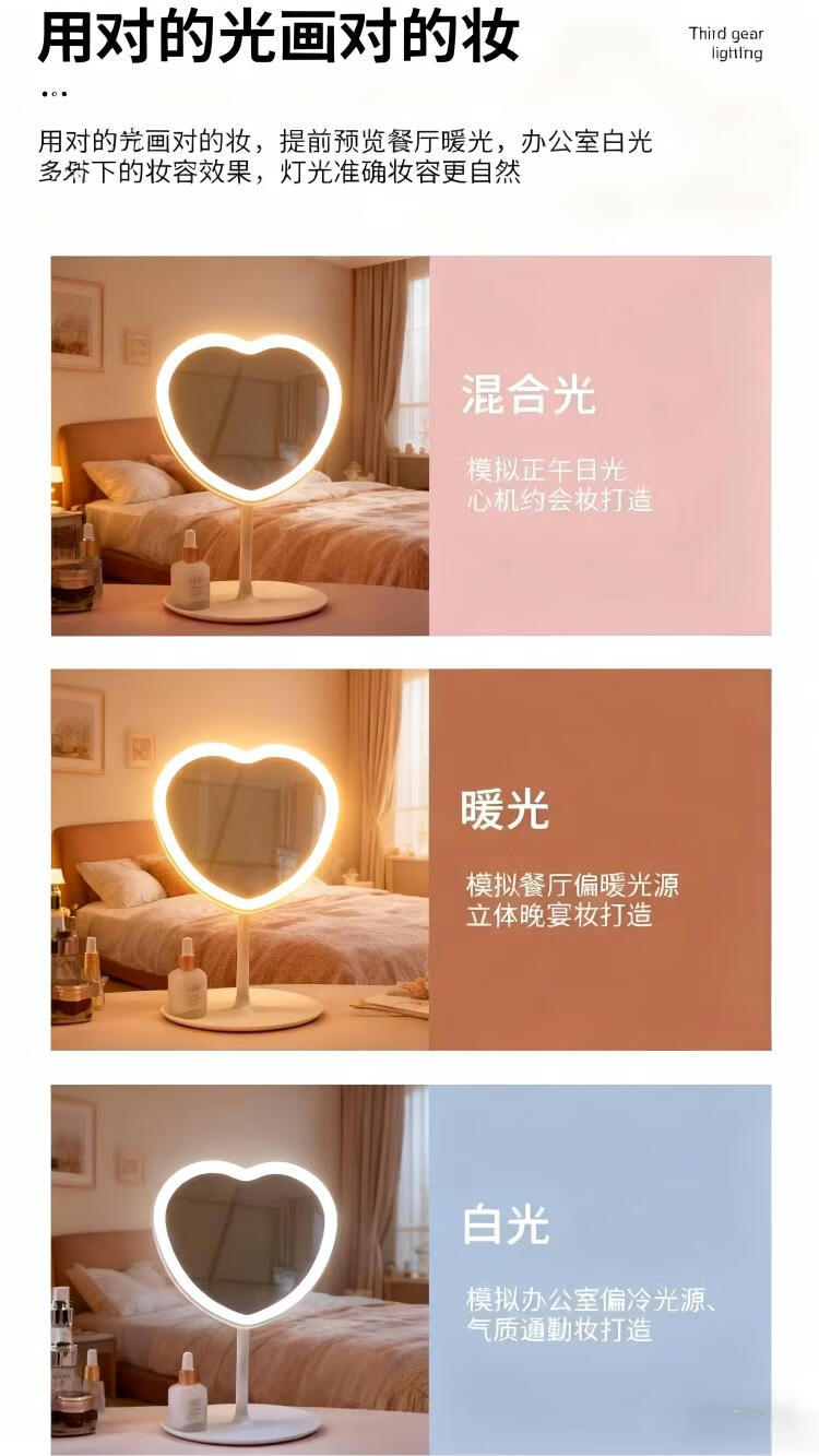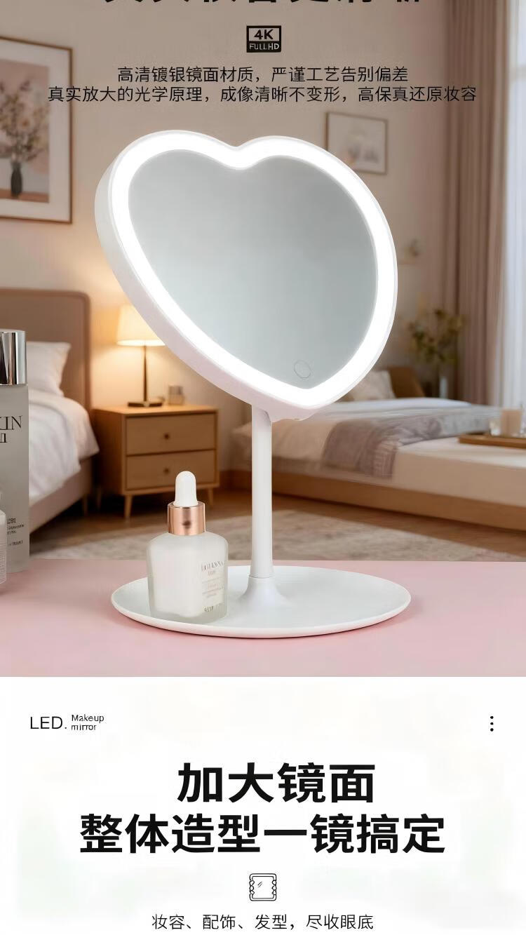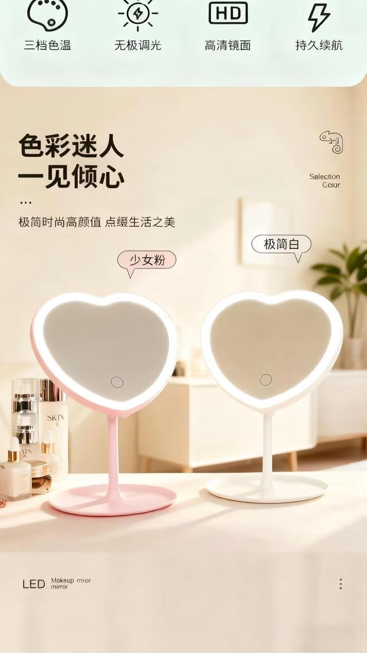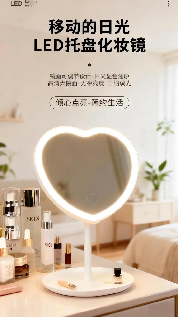 Love makeup mirror with light fill-in LED mirror princess mirror storage rack tray touch-up tabletop vanity mirror white three-color light