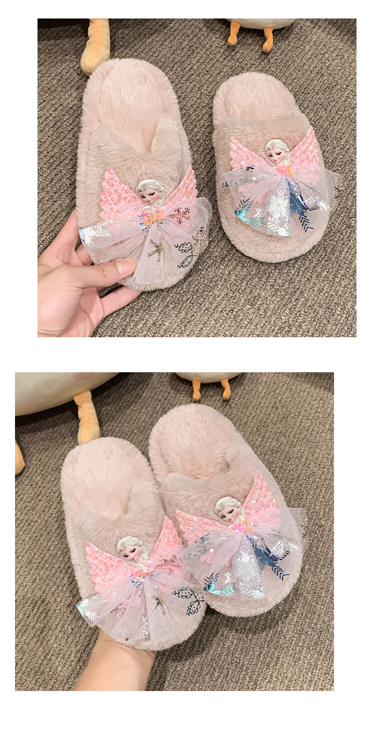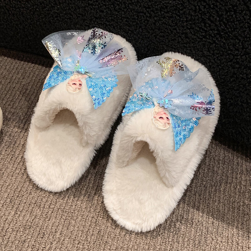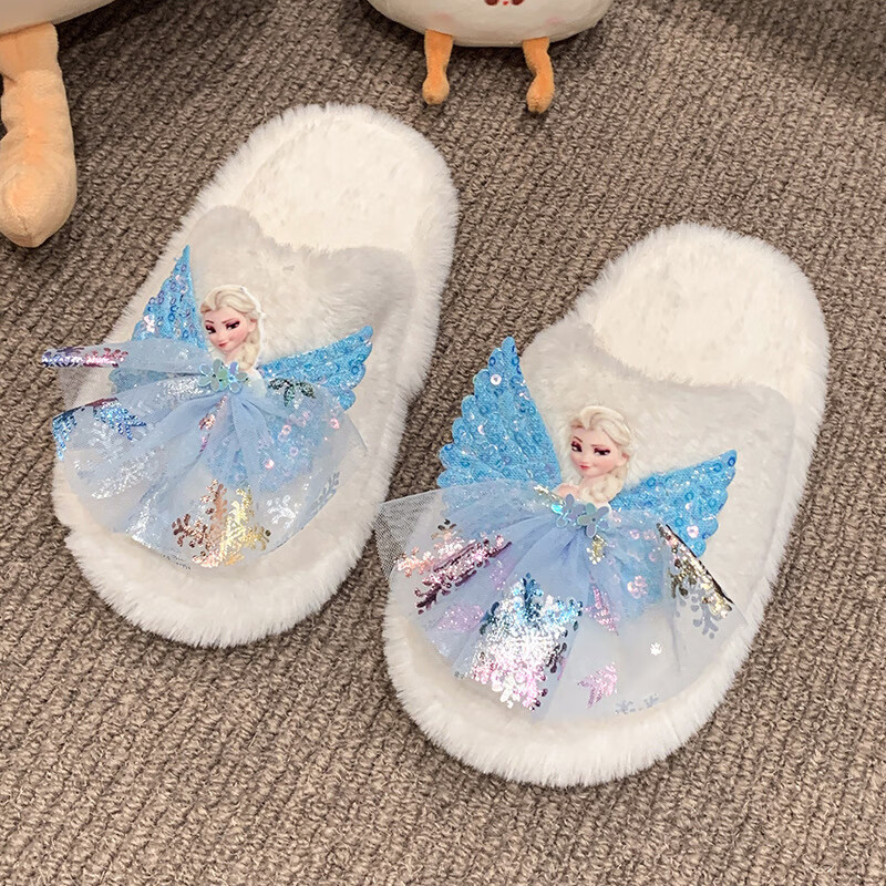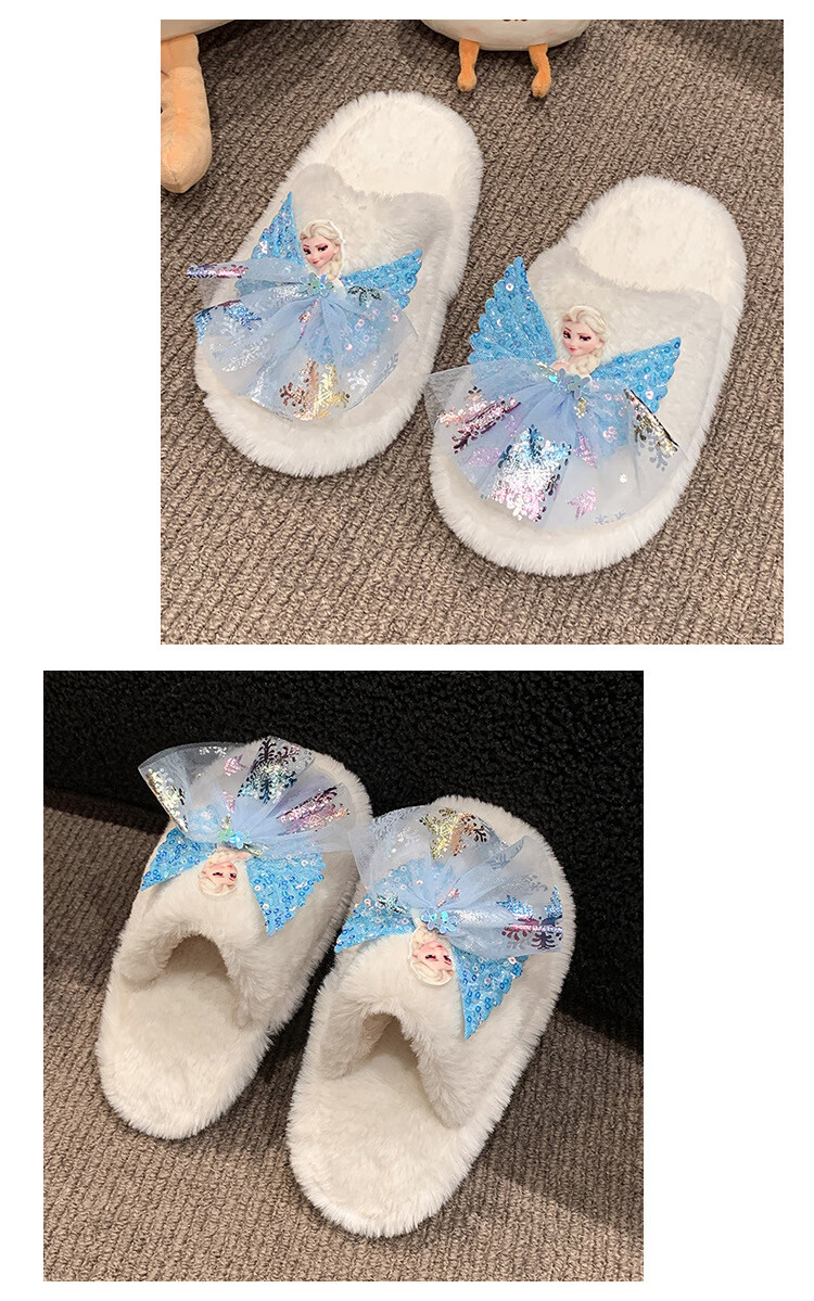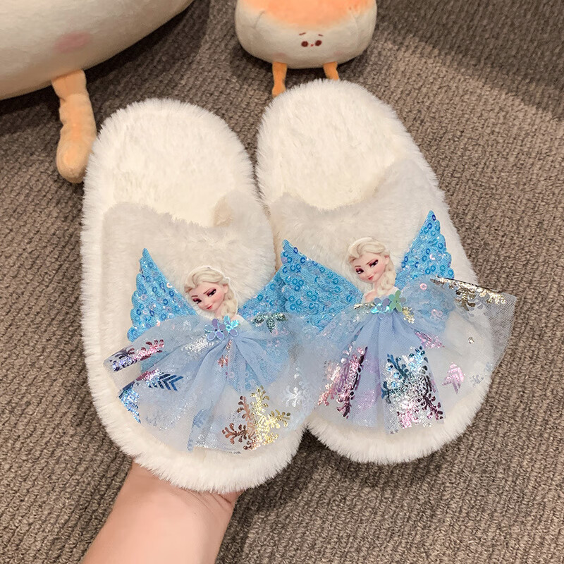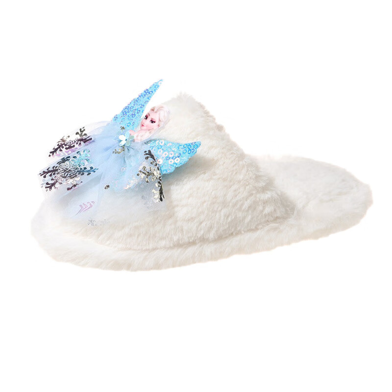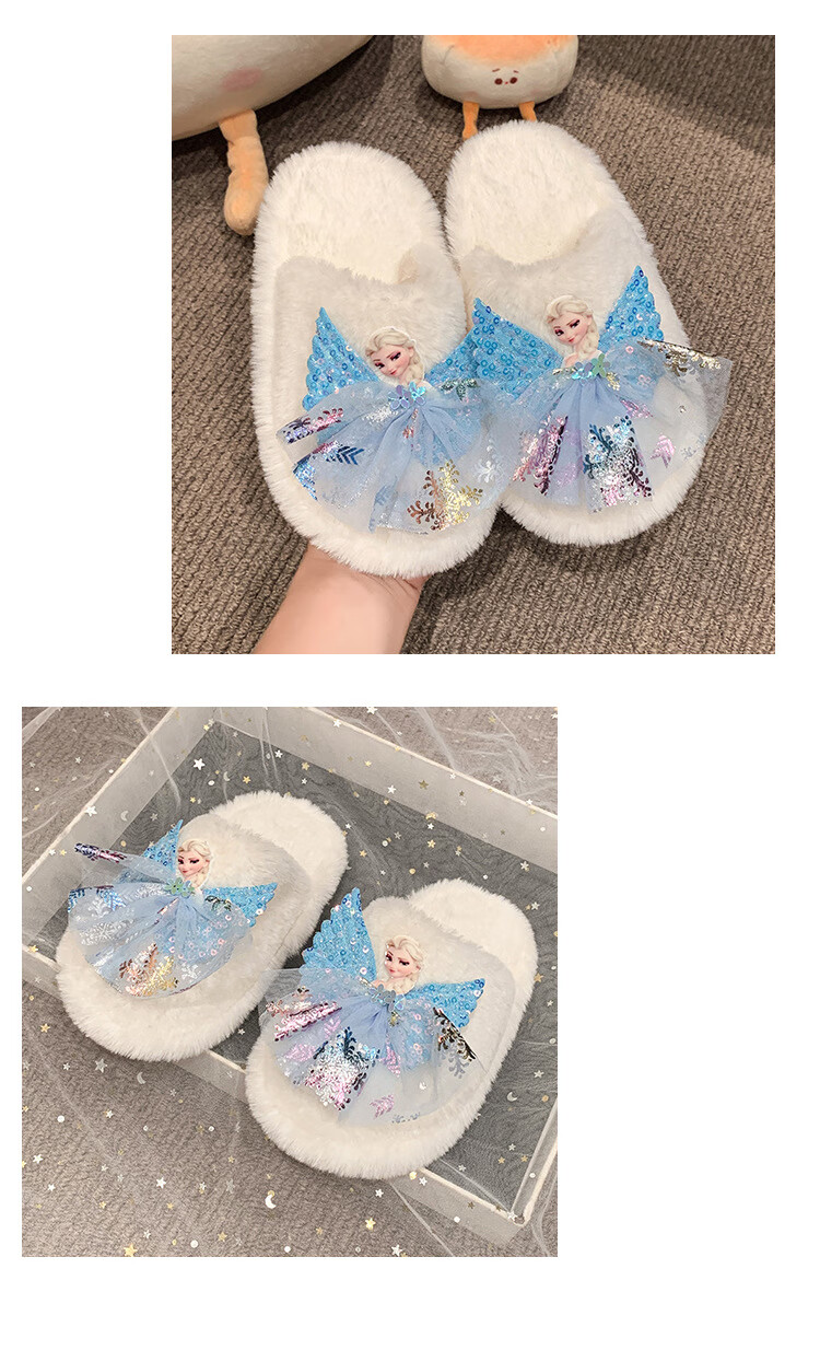 SKONWAT children's winter plush plush slippers, fashionable new girls' Elsa Princess home flat heel Baotou warm cotton slippers, white, size 26-27, inner length 18cm