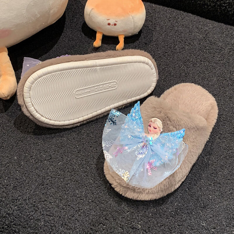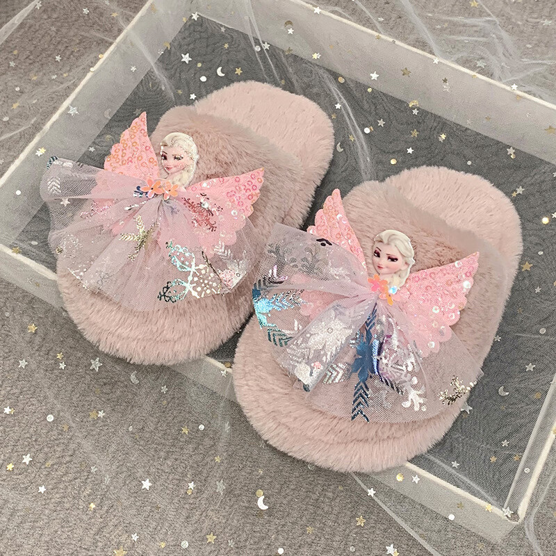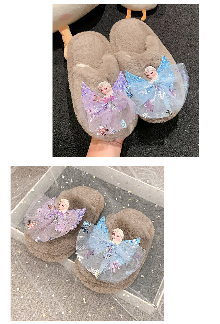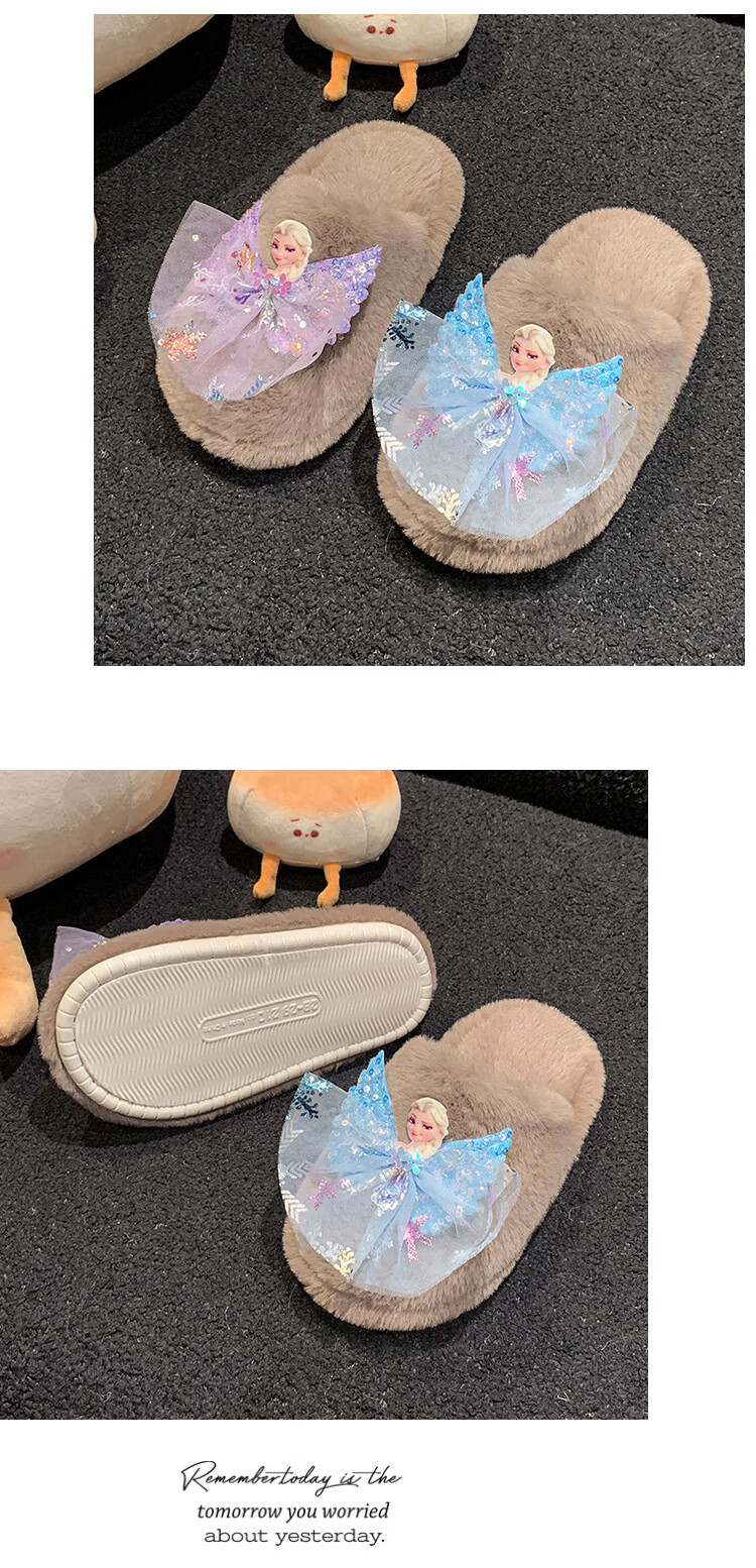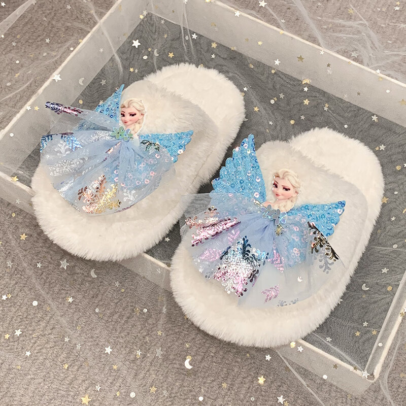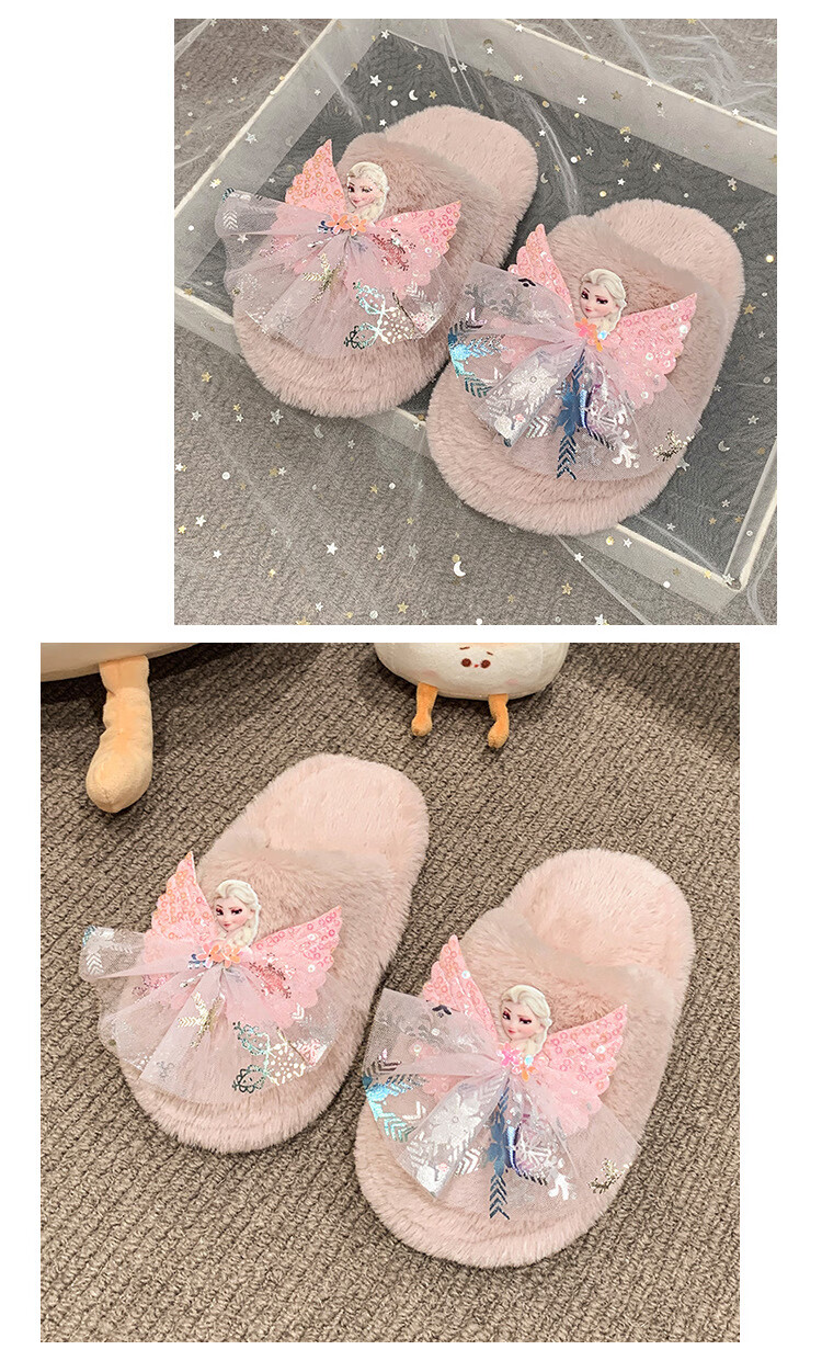 SKONWAT children's winter plush plush slippers, fashionable new girls' Elsa Princess home flat heel Baotou warm cotton slippers, white, size 26-27, inner length 18cm