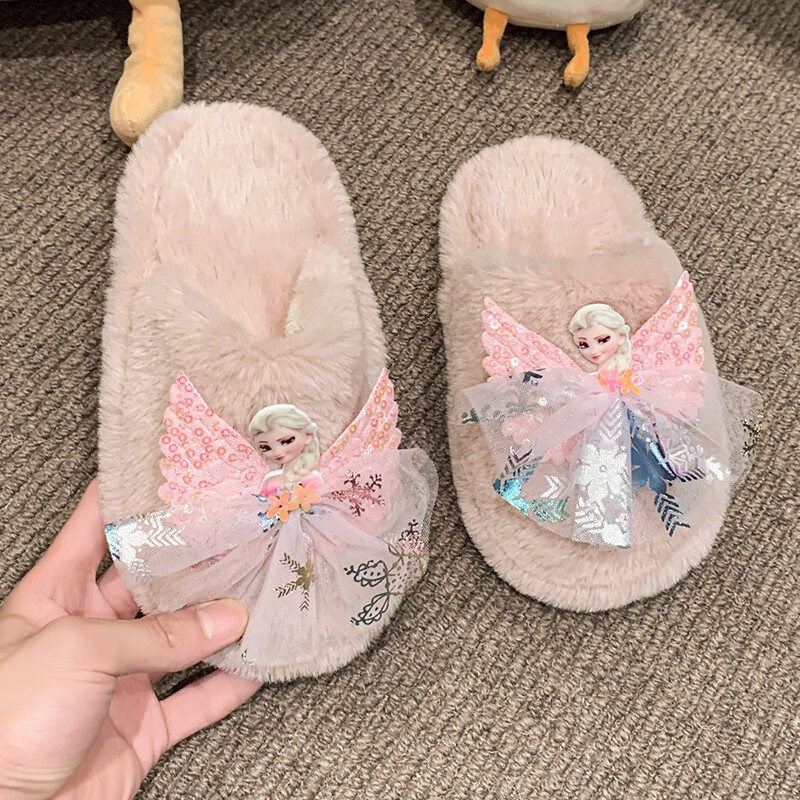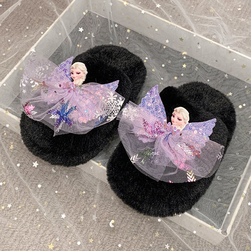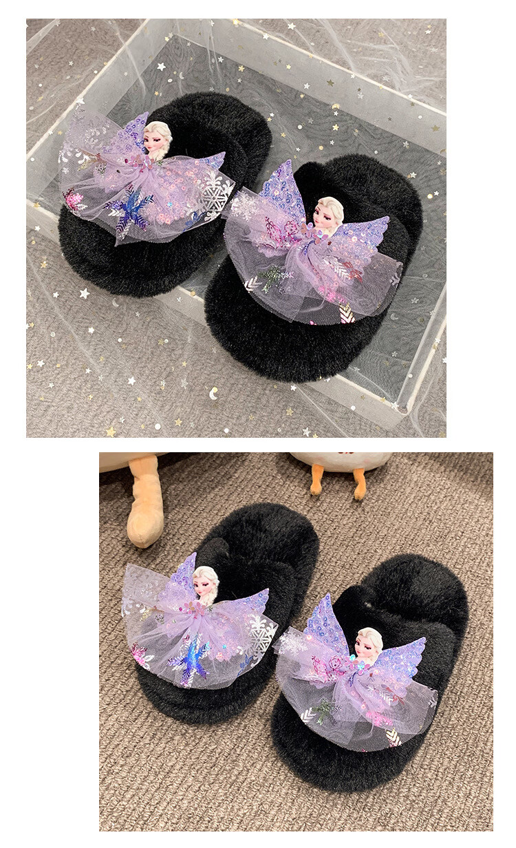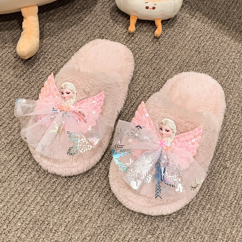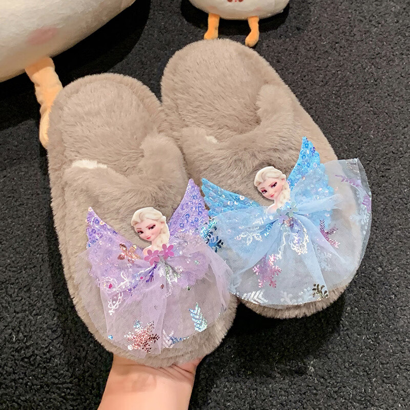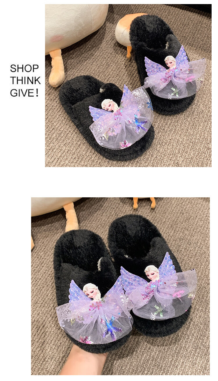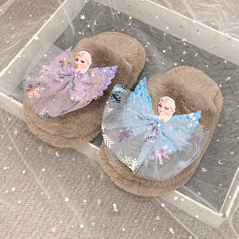 SKONWAT children's winter plush plush slippers, fashionable new girls' Elsa Princess home flat heel Baotou warm cotton slippers, white, size 26-27, inner length 18cm