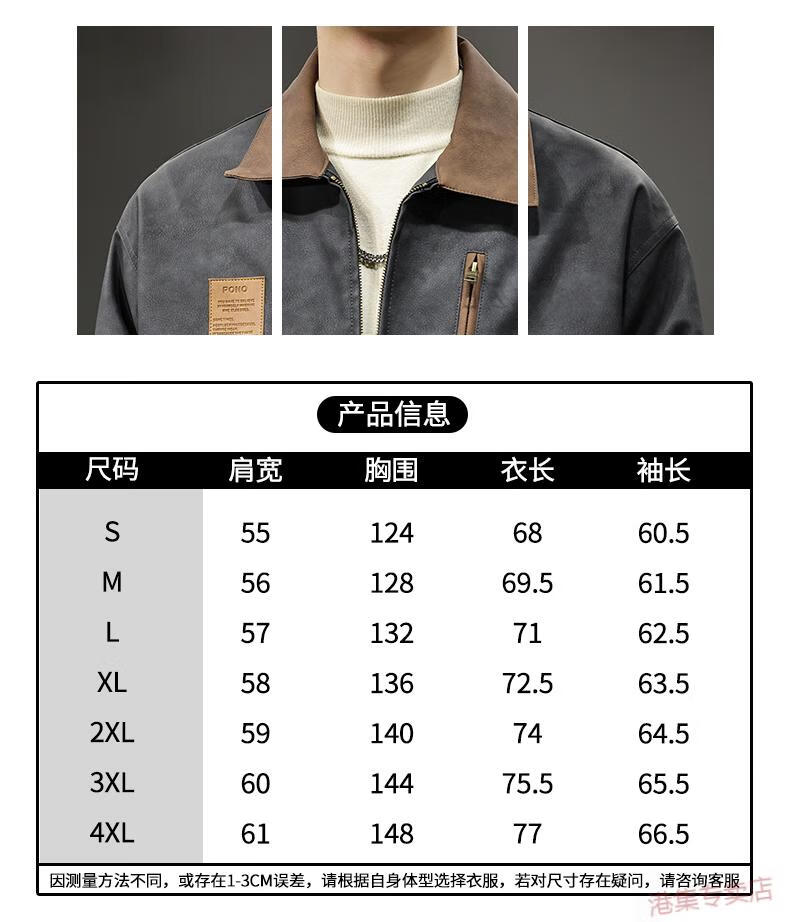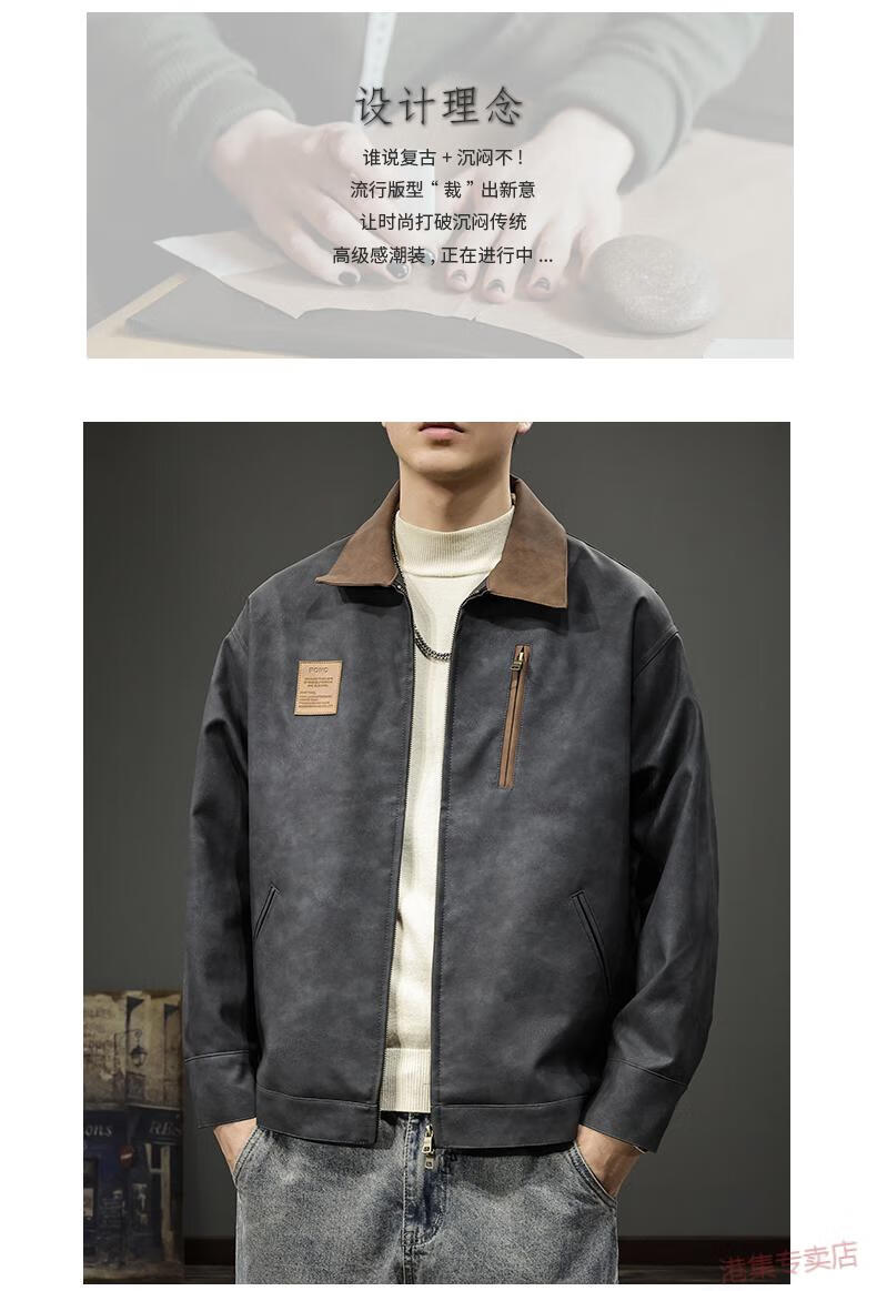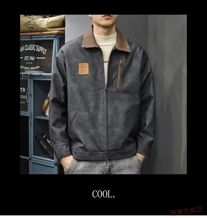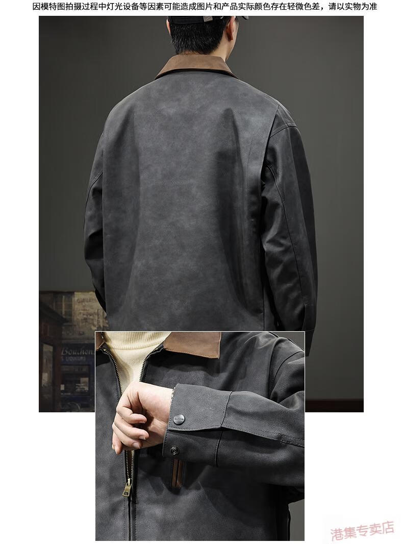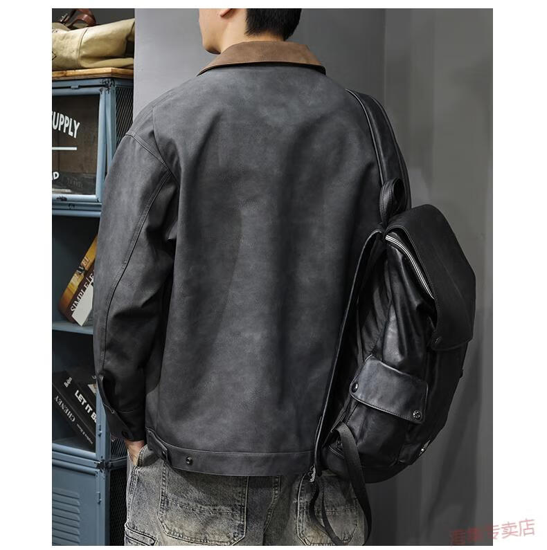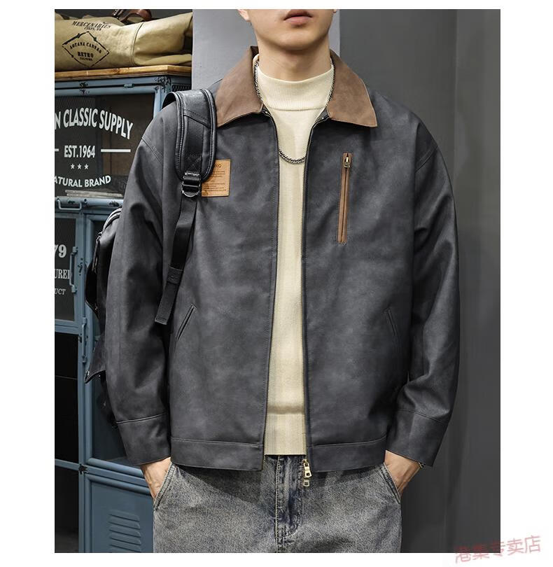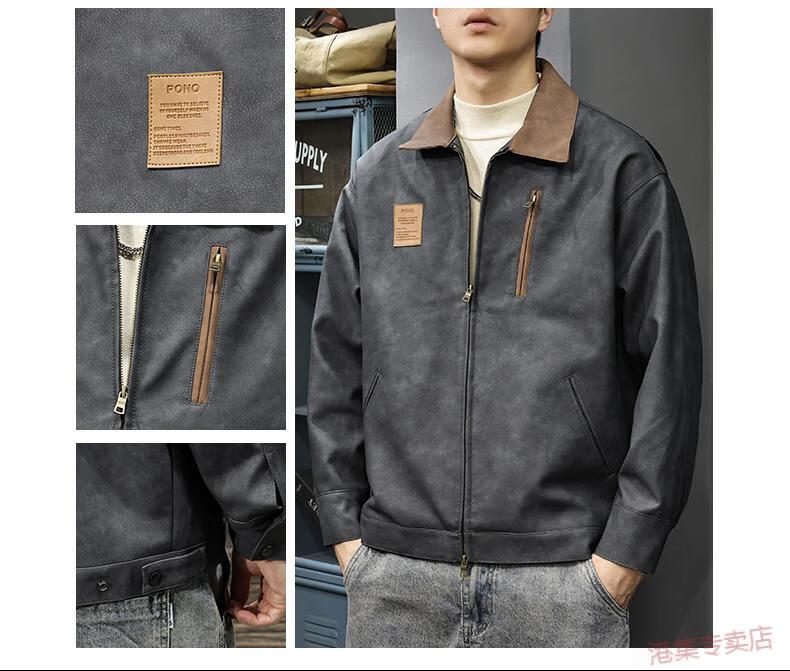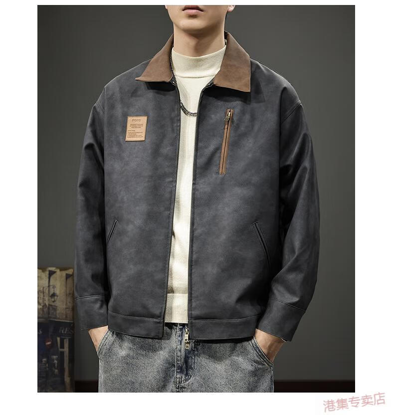 JEEP SPIRIT2025 New Autumn Trendy Brand Loose Leather Jacket Men's American Retro Contrast Color Lapel Motorcycle Pu Leather Jacket Black Gray S Suitable Weight 90-110Jin Jin is equal to 0.5 kg