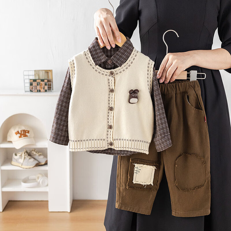 Min Sheng Boys Autumn and Winter Three-piece Suit Shirt Overalls Sweater Vest Fashionable Baby Clothes Birthday Gift 90 Height 75-85cm/Weight 20-25Jin Jin is equal to 0.5kg Usually shot according to height + 10