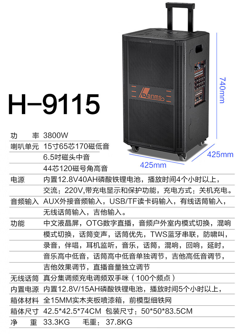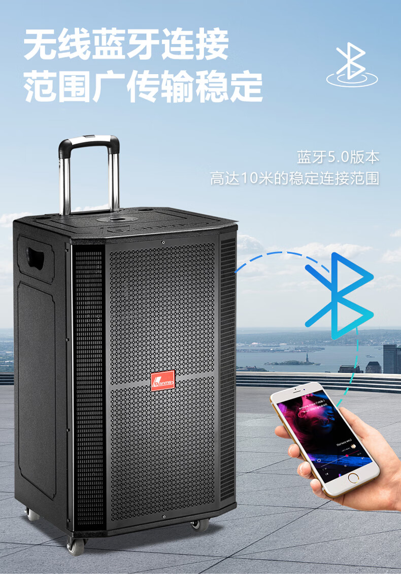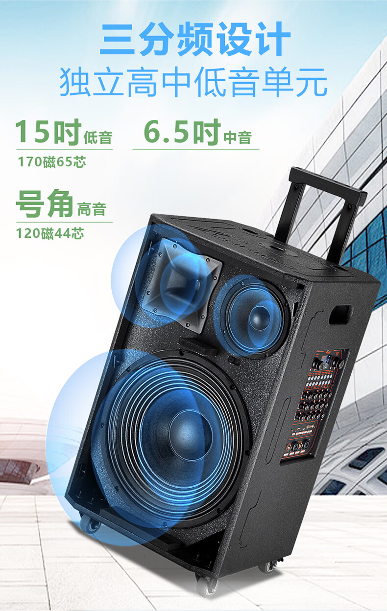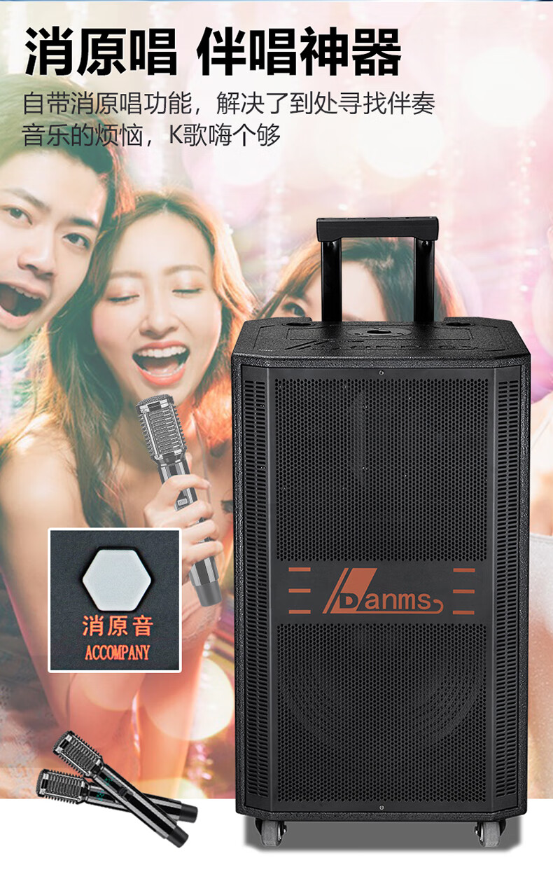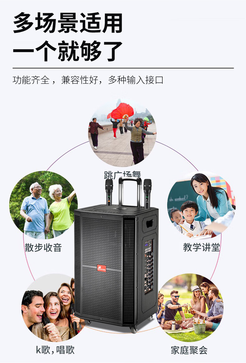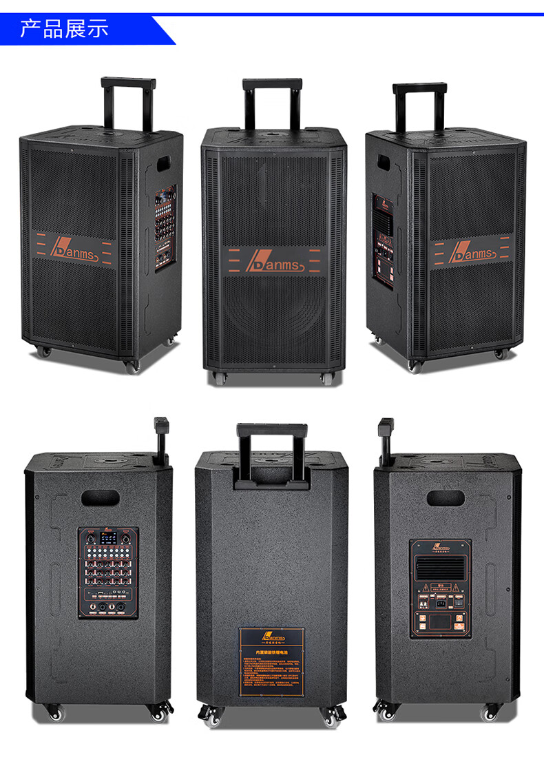 Danmark outdoor trolley audio high-power professional square dance karaoke audio 18-inch heavy bass three-way Bluetooth sound card live broadcast mobile event conference speaker dual charging microphone H-9115 (15-inch heavy bass)
