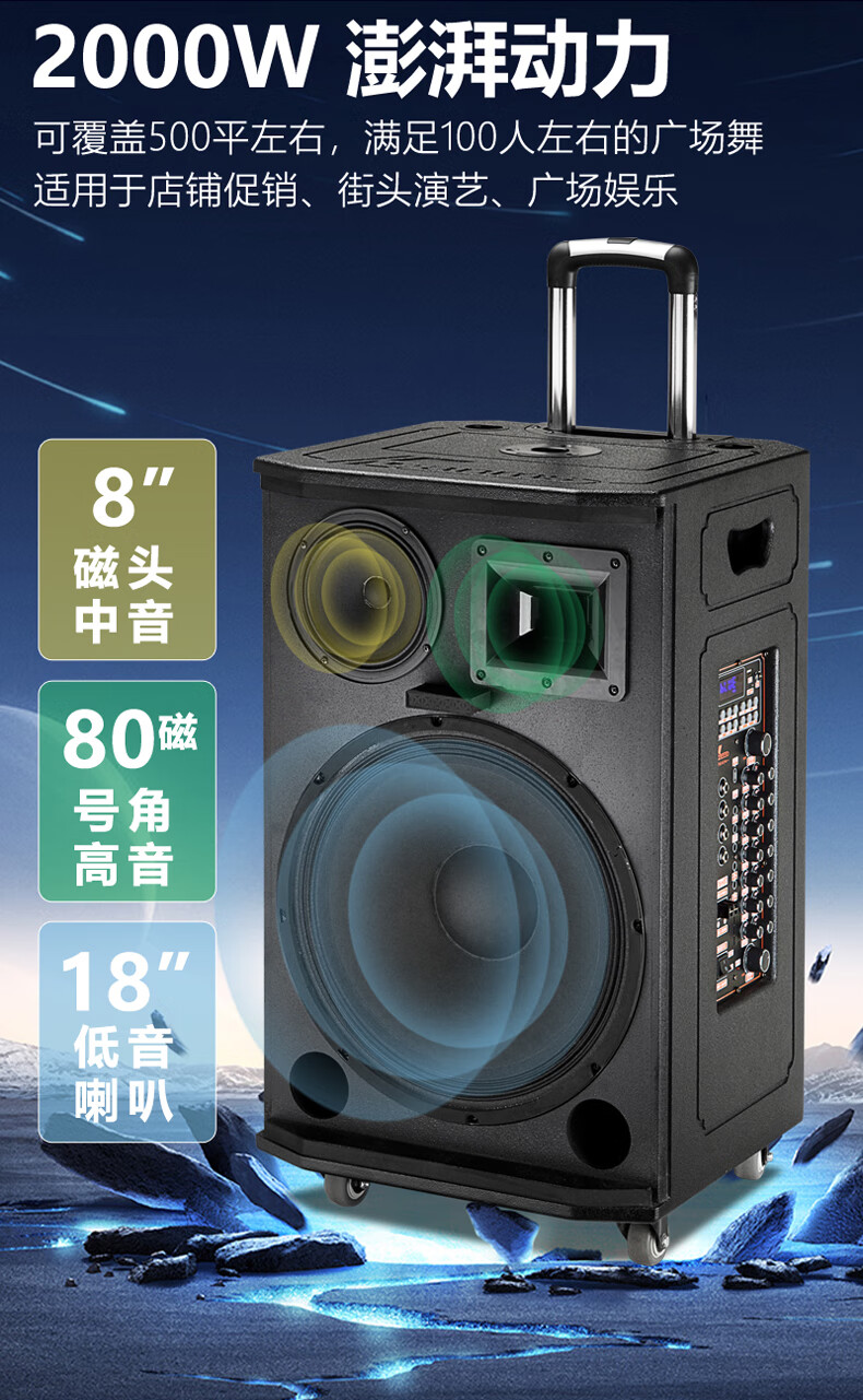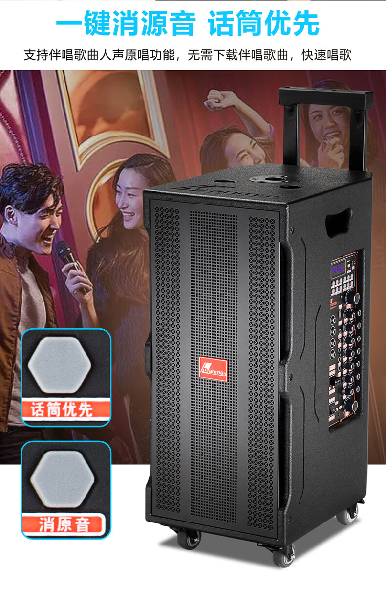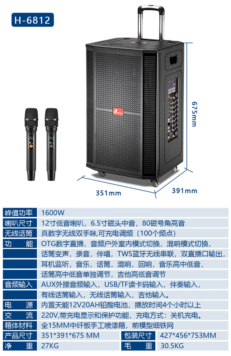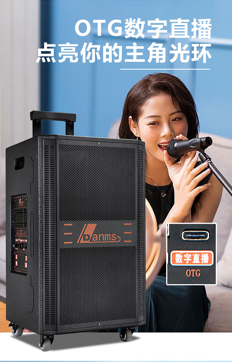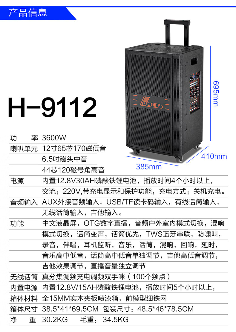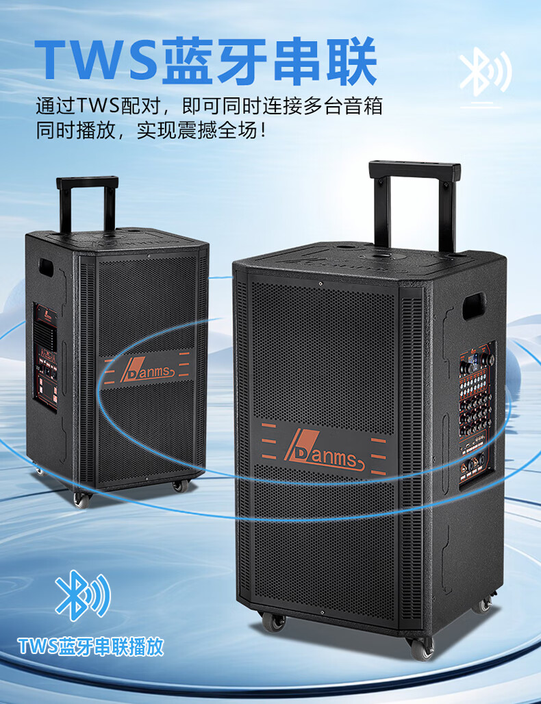 Danmark outdoor trolley audio high-power professional square dance karaoke audio 18-inch heavy bass three-way Bluetooth sound card live broadcast mobile event conference speaker dual charging microphone H-9115 (15-inch heavy bass)