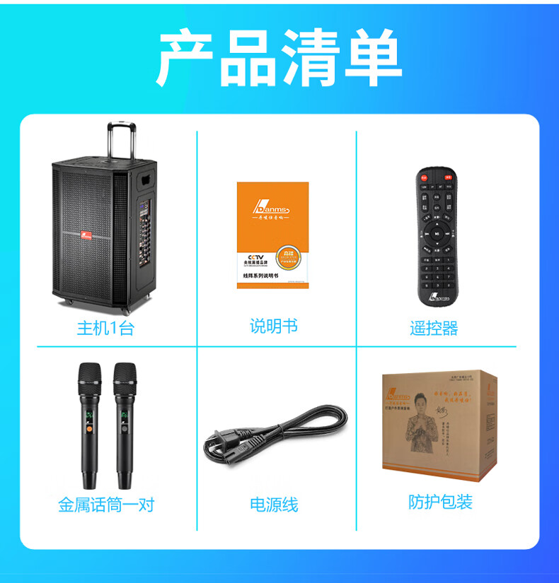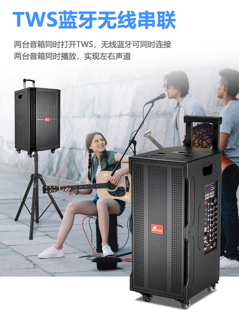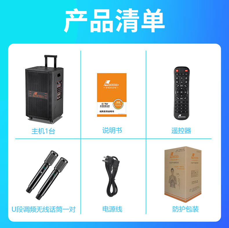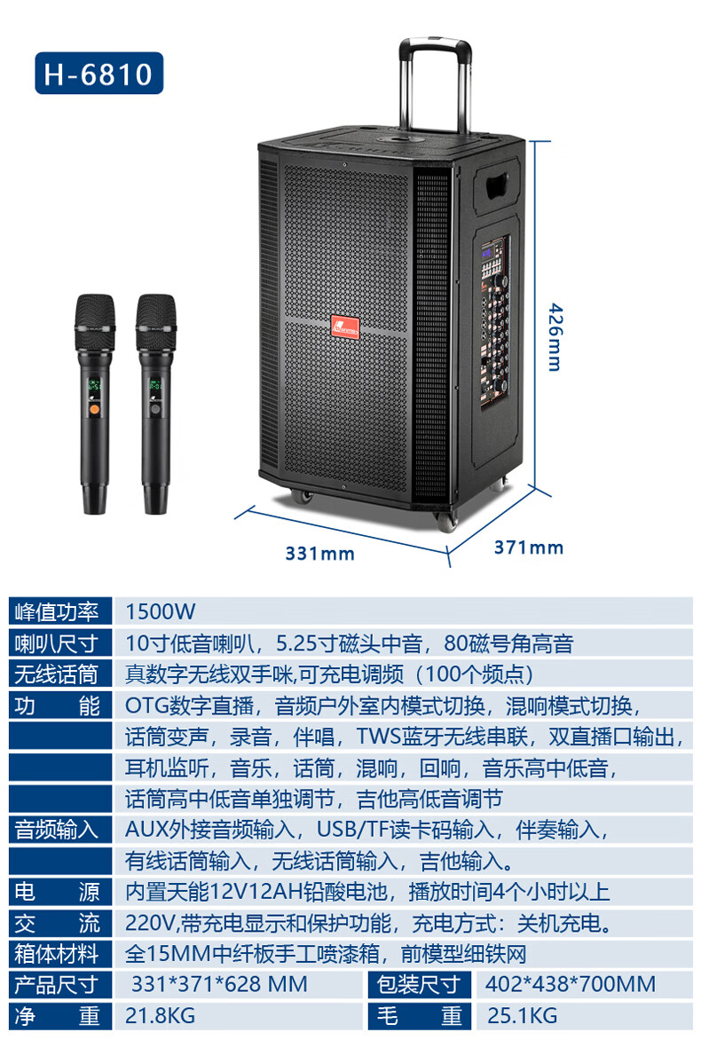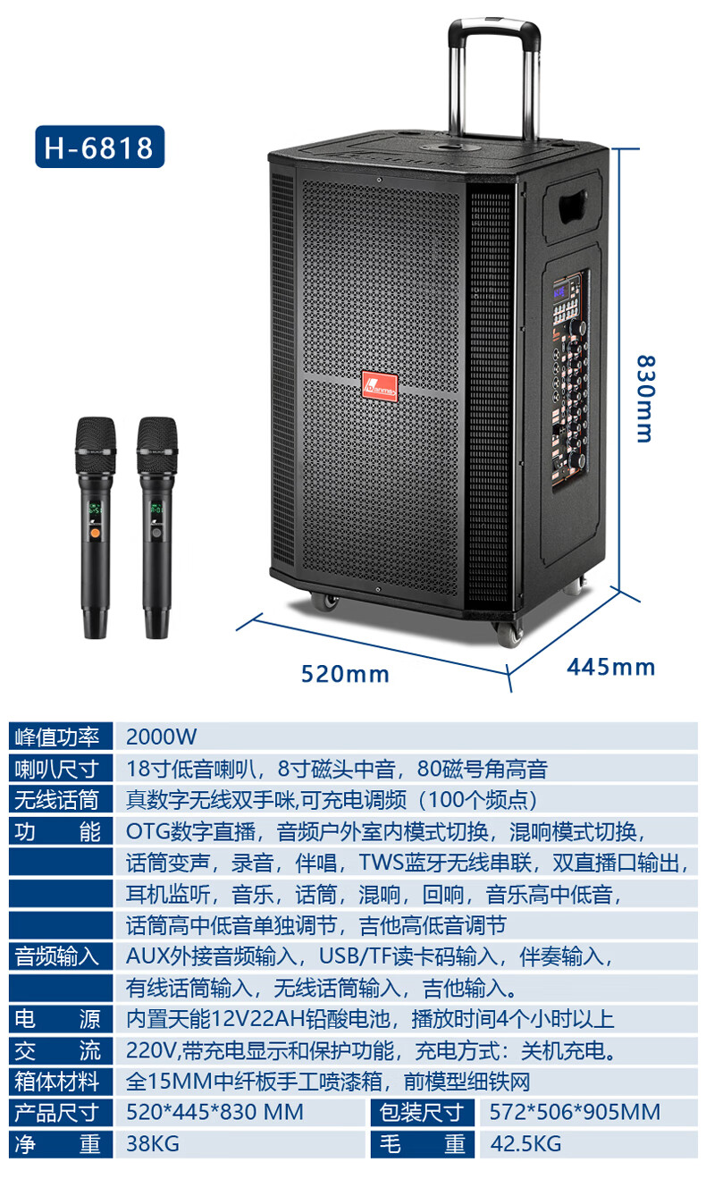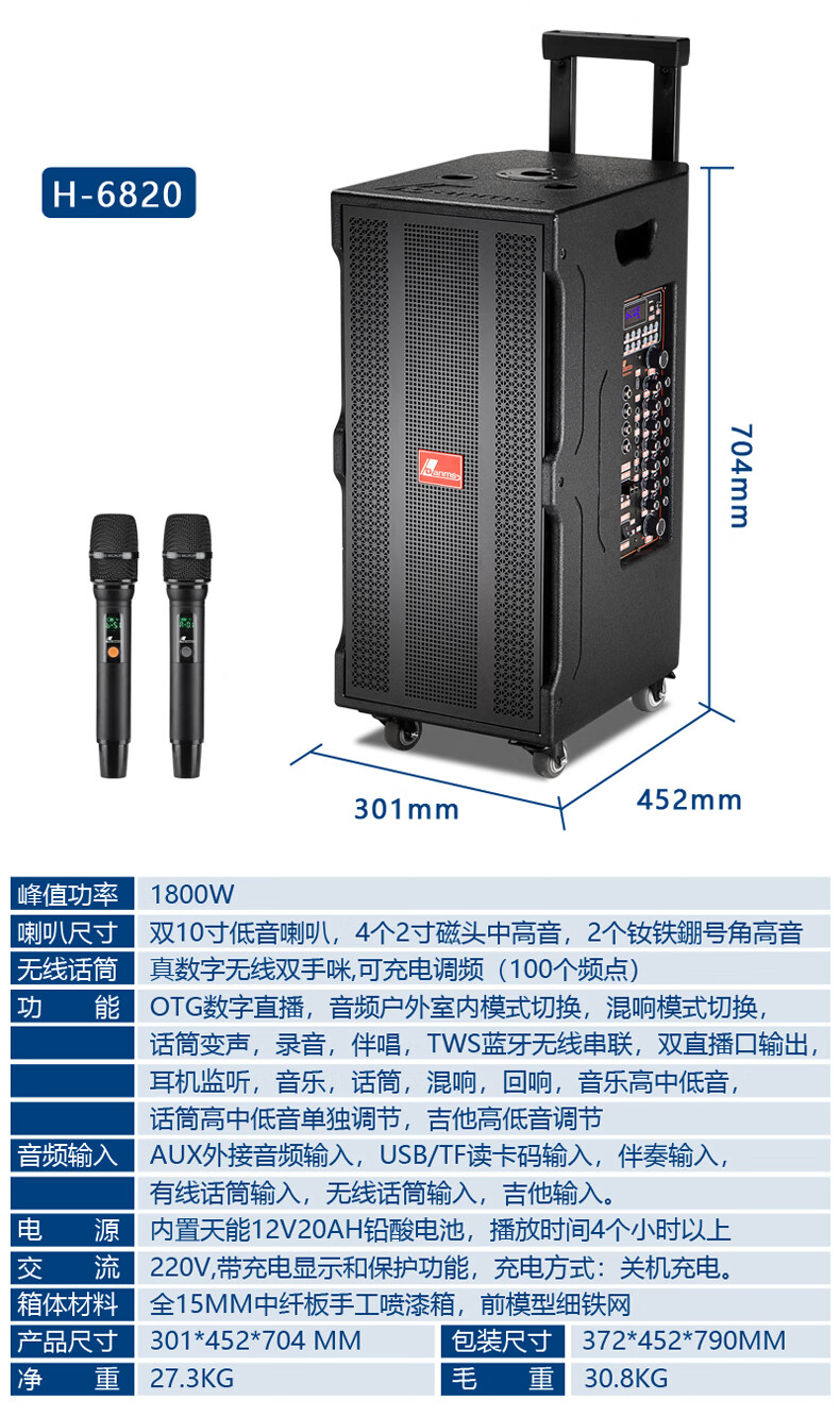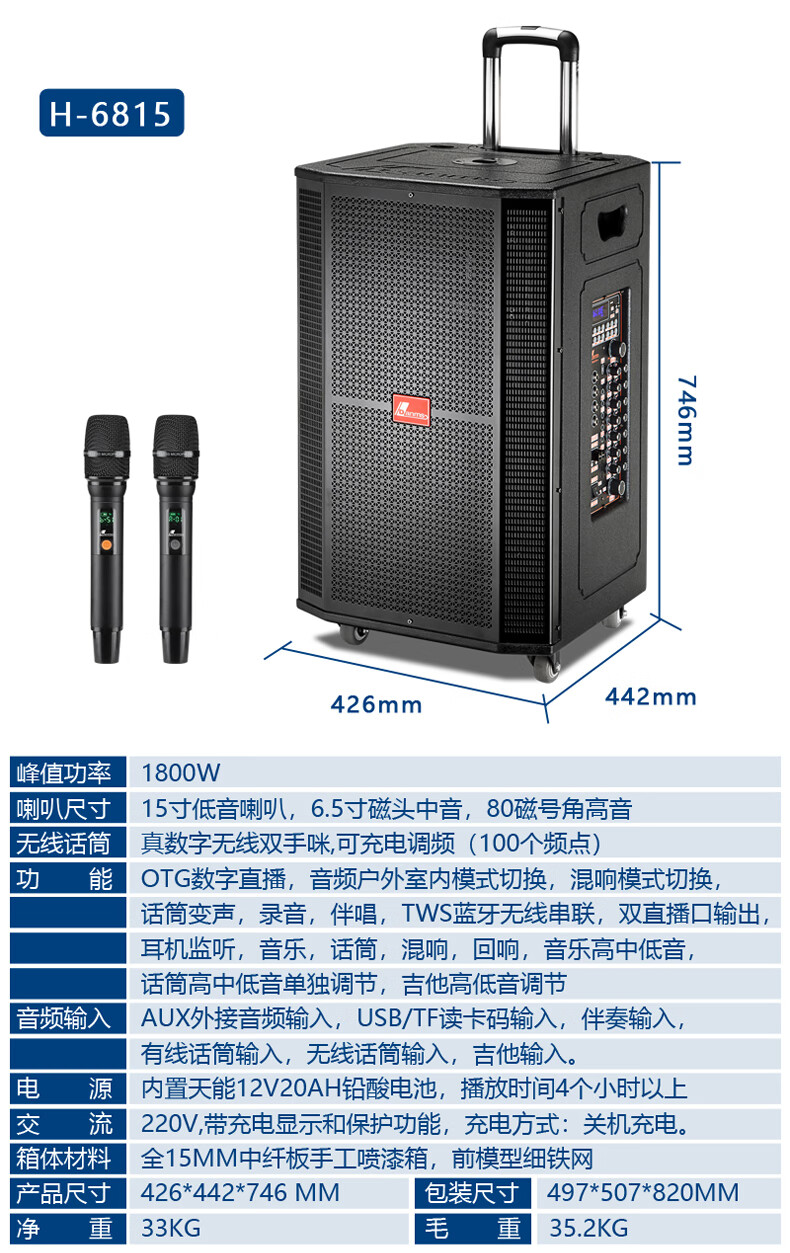 Danmark outdoor trolley audio high-power professional square dance karaoke audio 18-inch heavy bass three-way Bluetooth sound card live broadcast mobile event conference speaker dual charging microphone H-9115 (15-inch heavy bass)