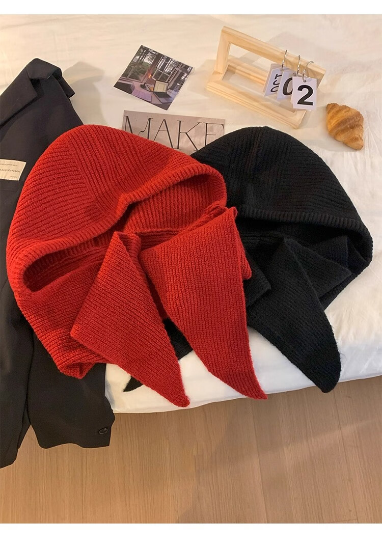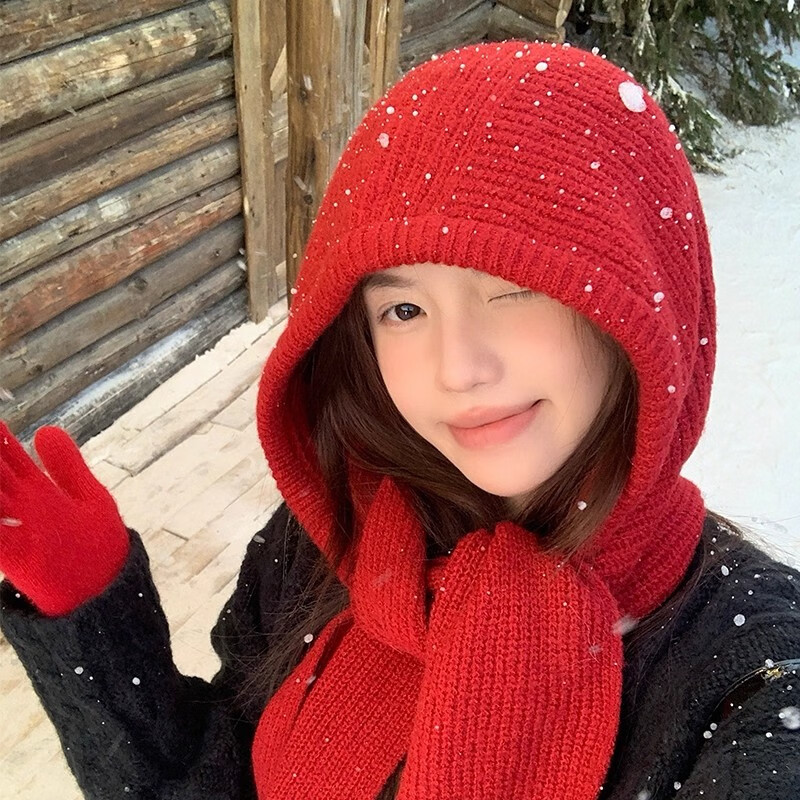 JIOESC red hat scarf one-piece barak farah women's autumn and winter warm wool hooded scarf knitted hat scarf shawl-red-one size