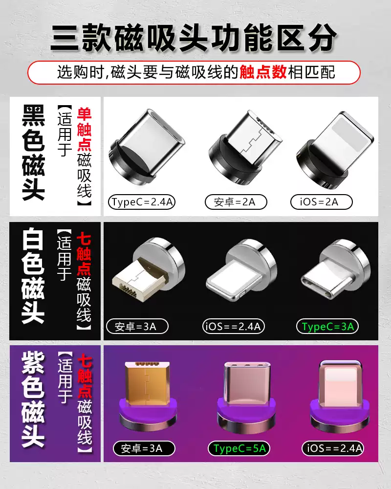 Tianmiaomiao three-pack universal seven-contact magnetic charging head fast charging Android single-pin blind head suitable for Apple tablet dust-proof plug car charger bracket magnetic charging seven-color contacts 3 suitable for Apple port 0.04m