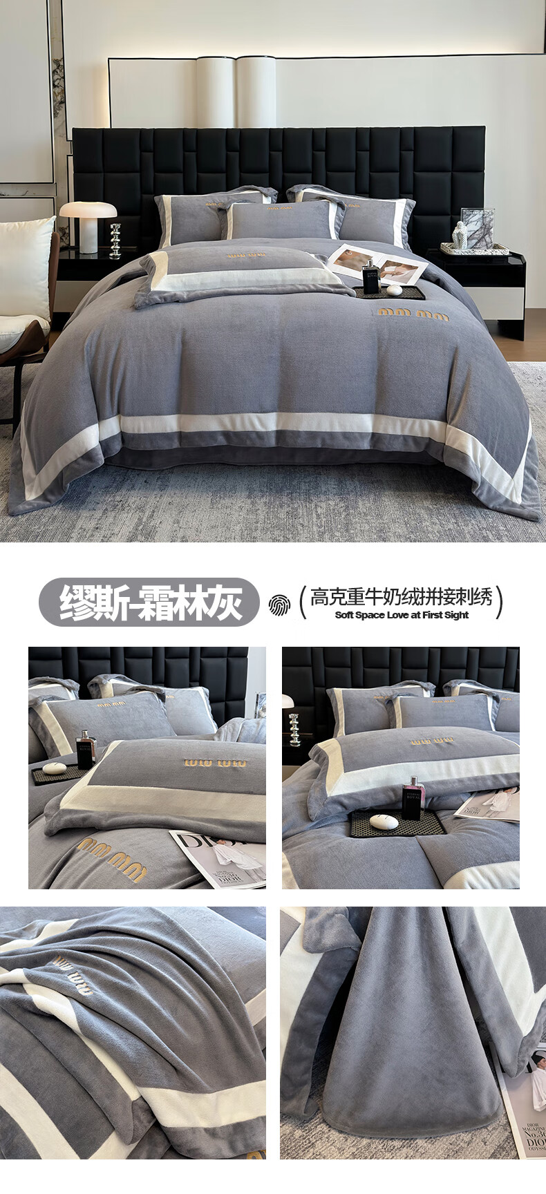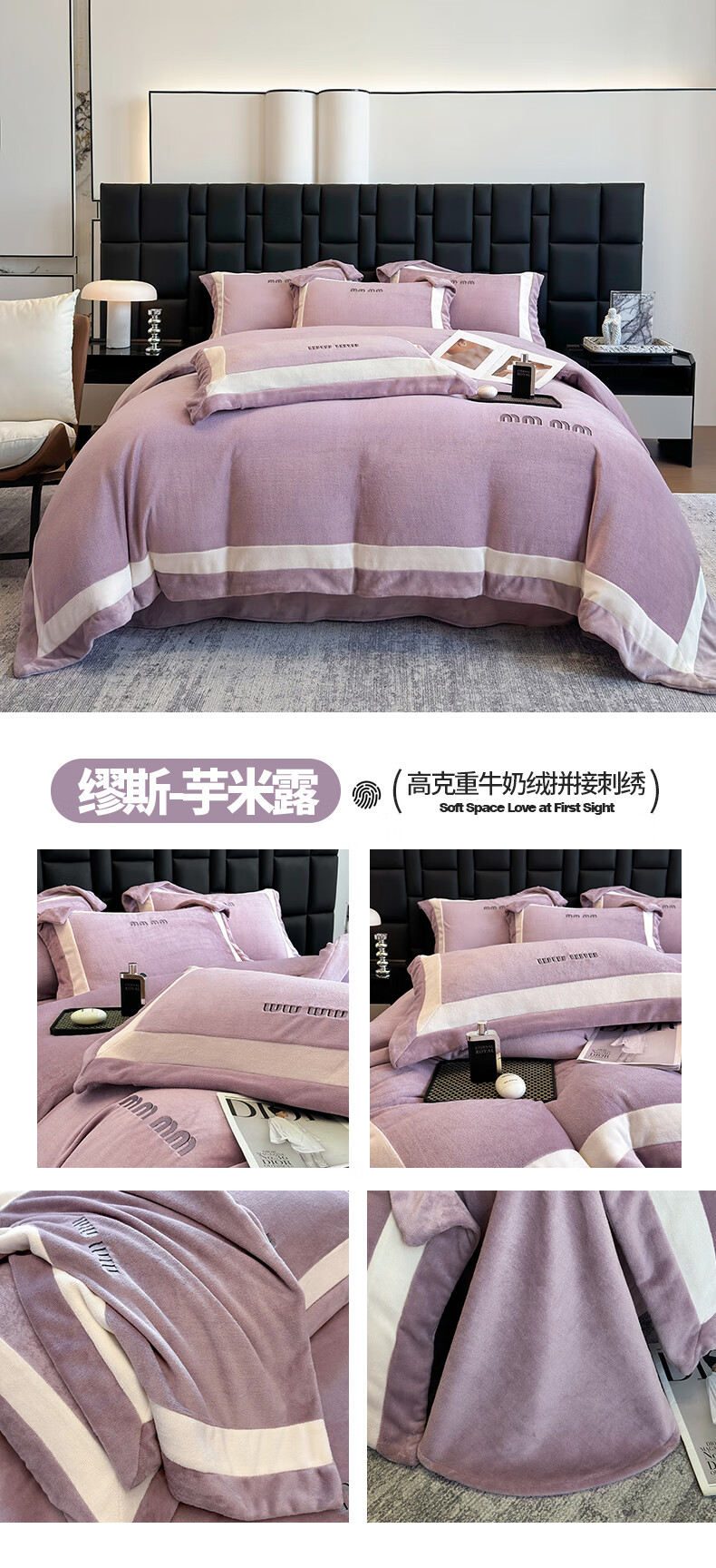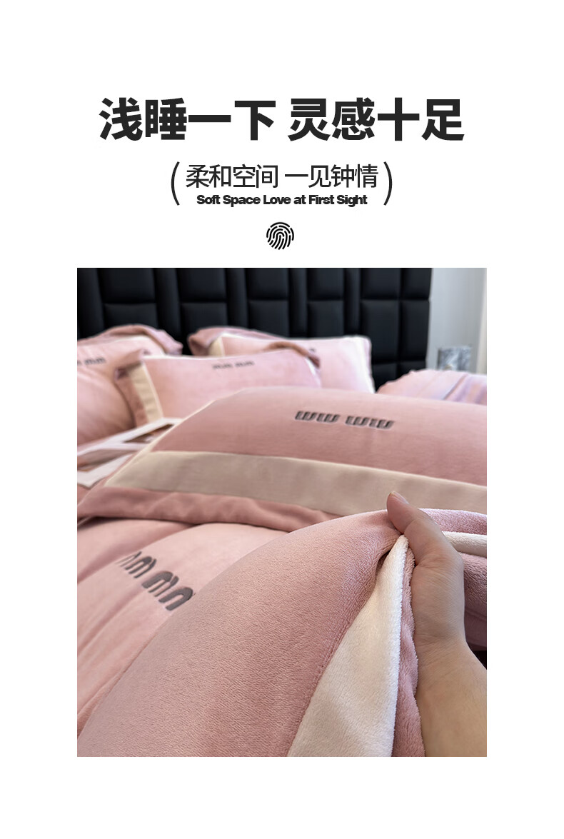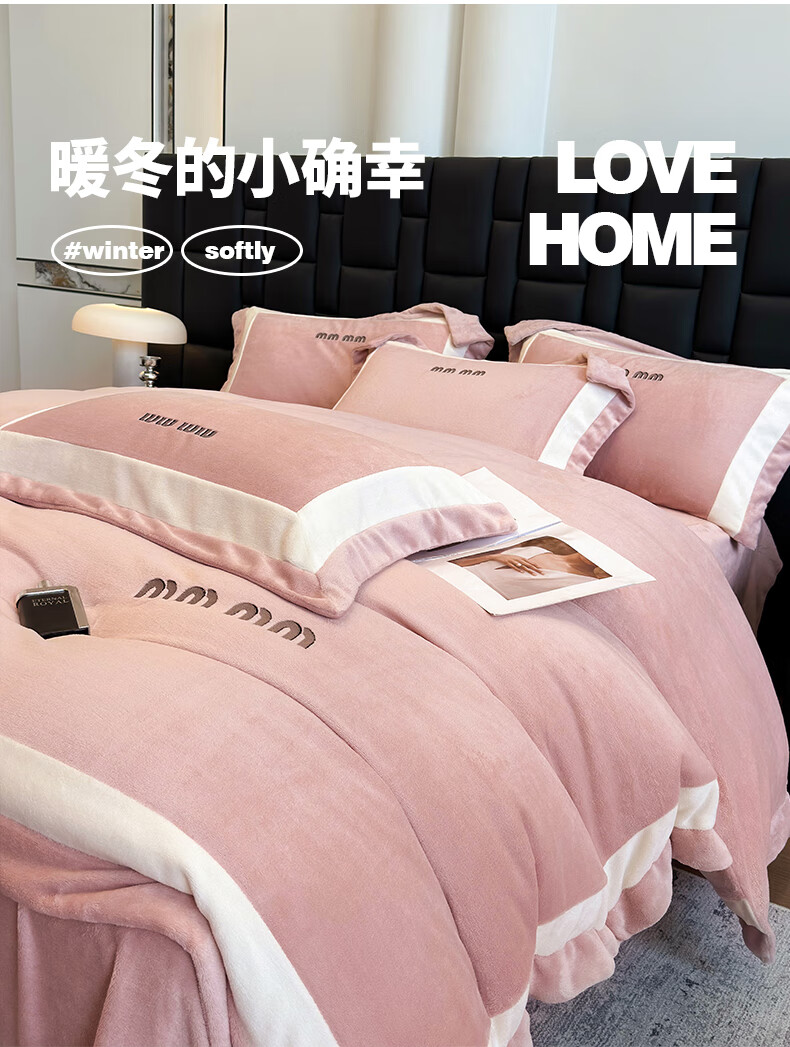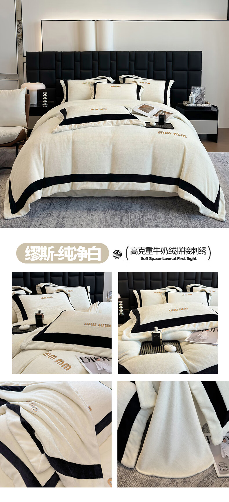 Mercury series 200 count high-end light luxury bed four-piece set winter coral milk suede duvet cover flannel thickened sheets Muse-pure white antistatic + thickened + no lint 1.5m bed sheet four-piece set antistatic + thickened + no lint