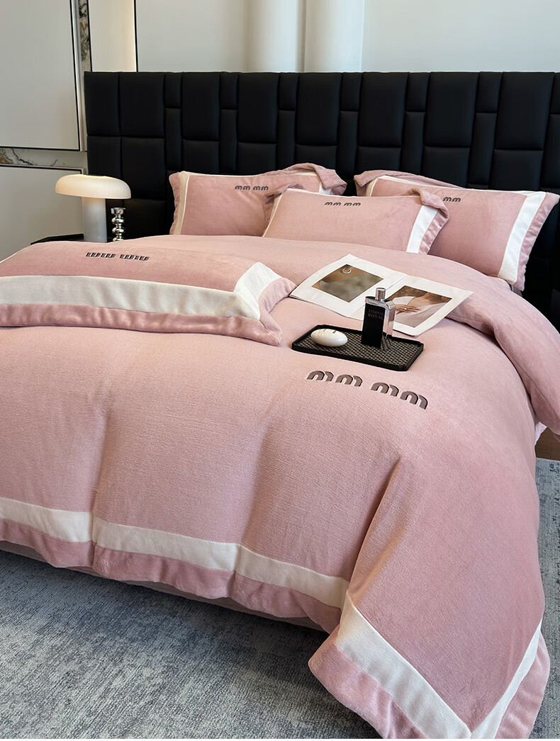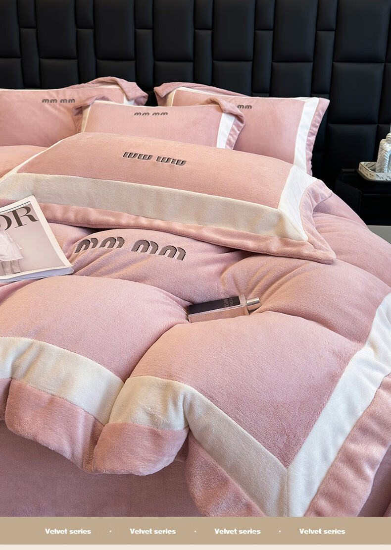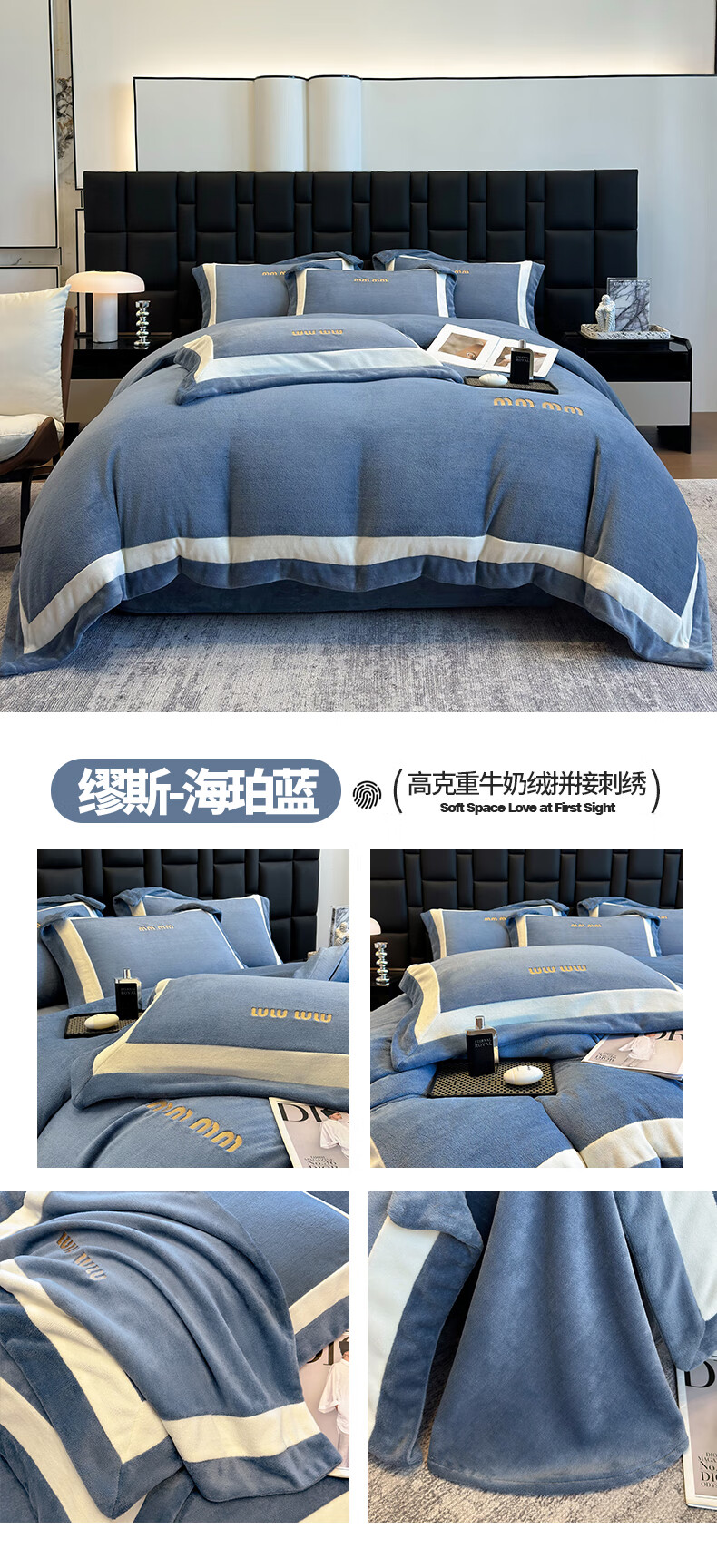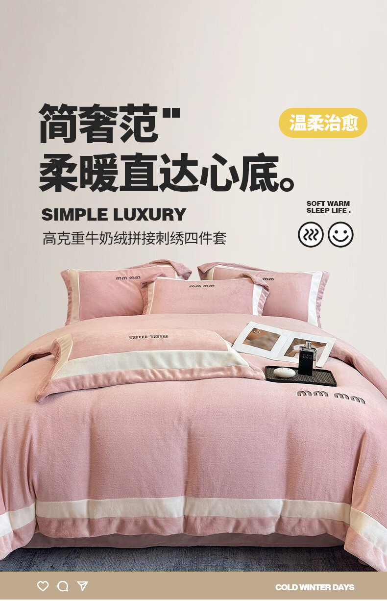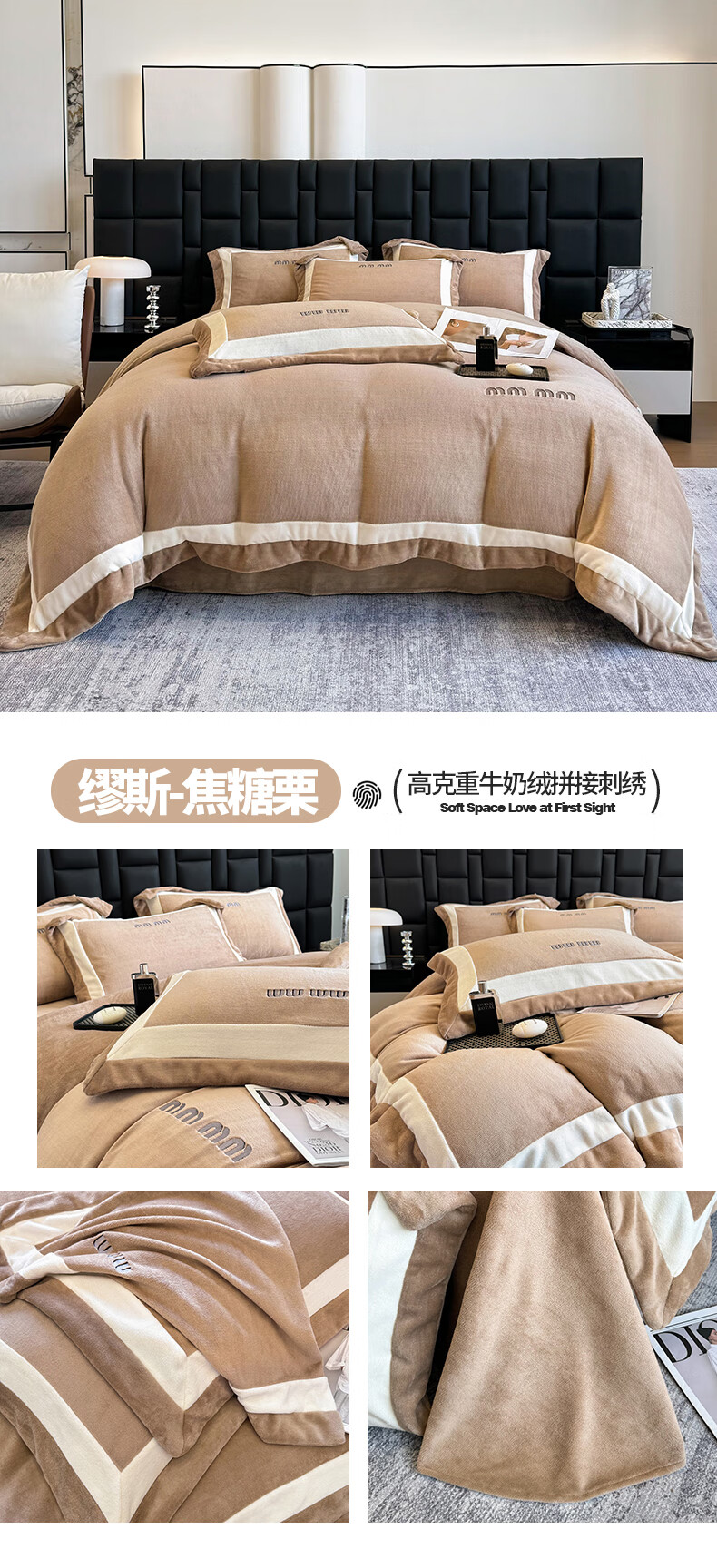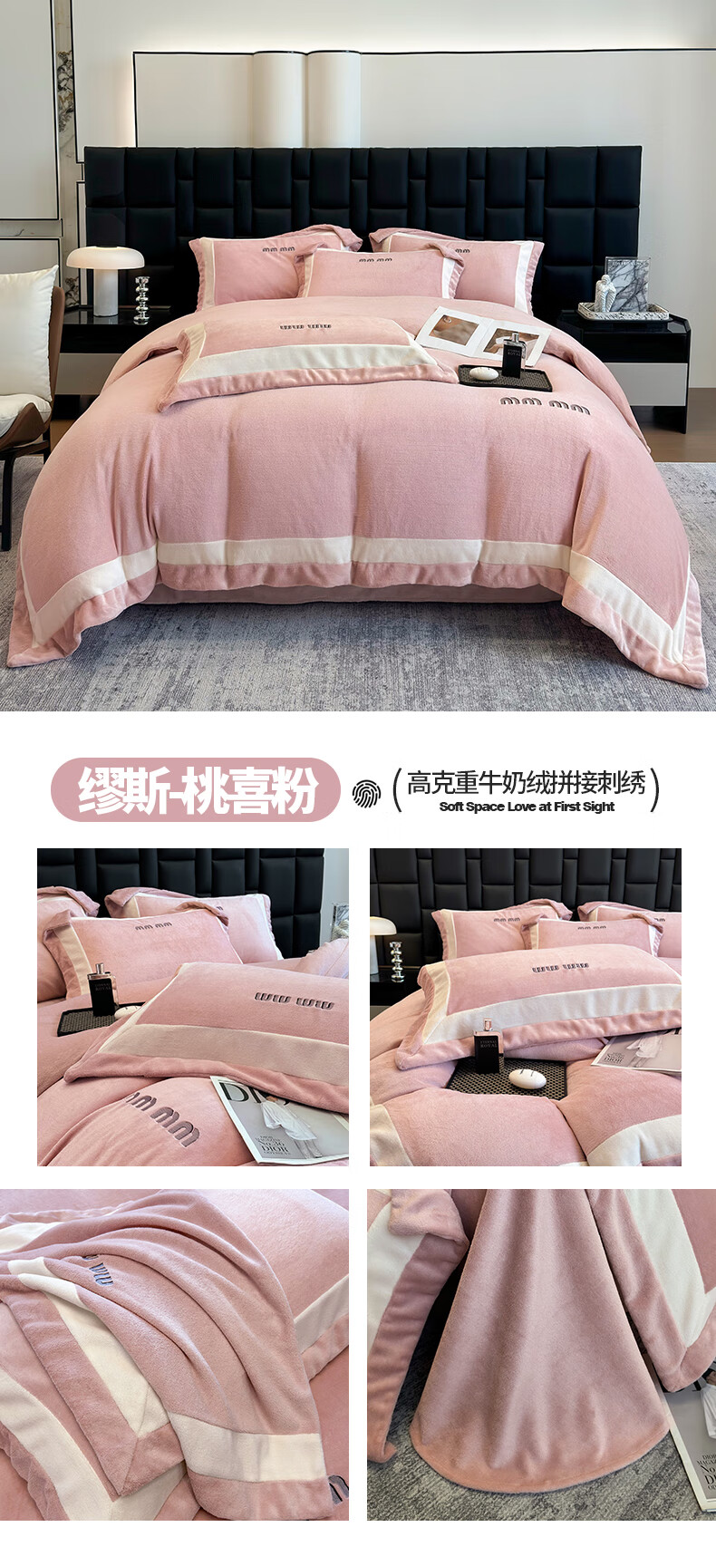 Mercury series 200 count high-end light luxury bed four-piece set winter coral milk suede duvet cover flannel thickened sheets Muse-pure white antistatic + thickened + no lint 1.5m bed sheet four-piece set antistatic + thickened + no lint