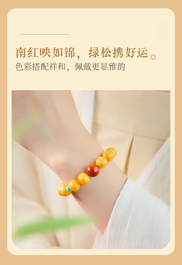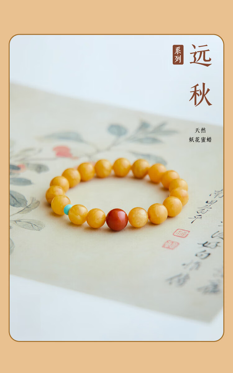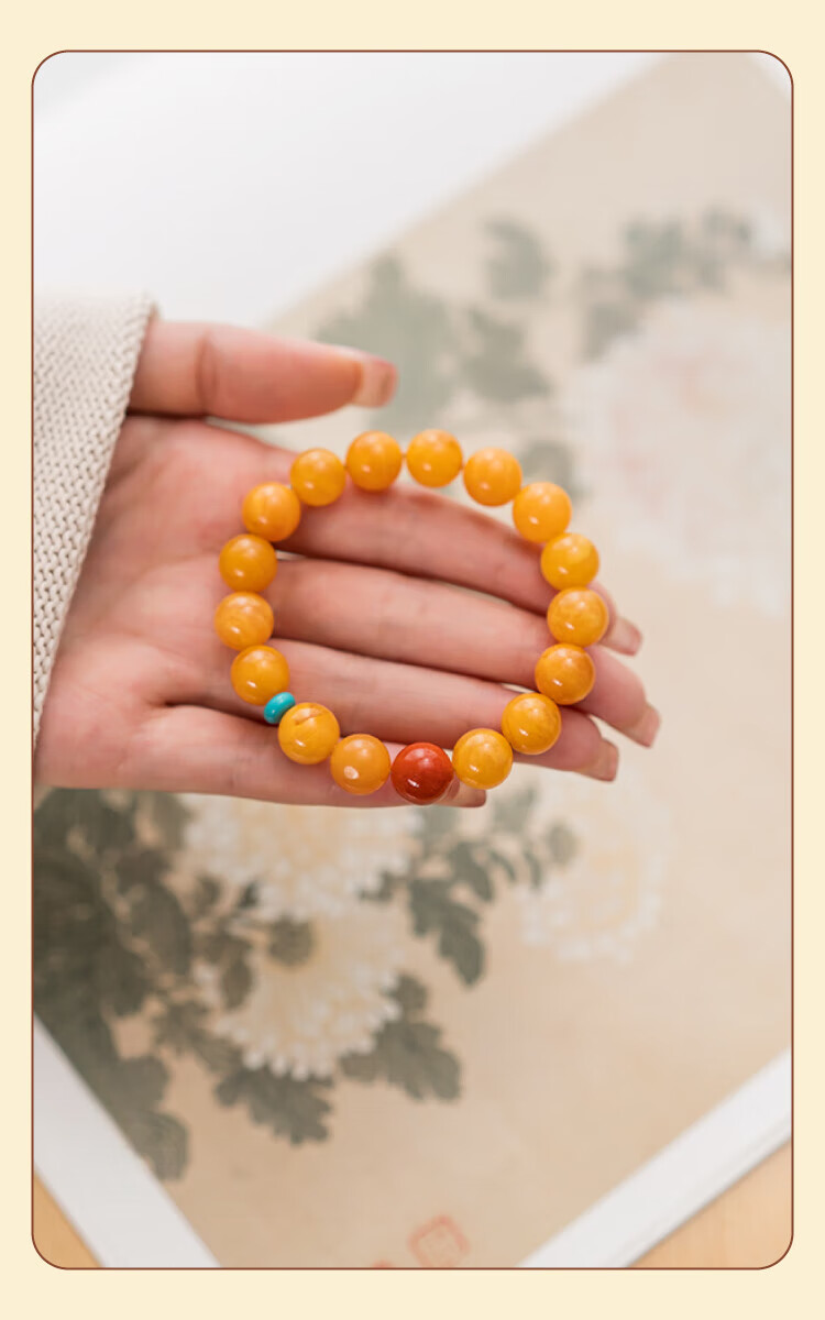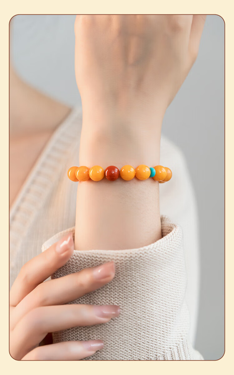 Amber Bracelet Women's Natural Chicken Fat Yellow Beeswax Bracelet New Chinese Style National Style Southern Red Turquoise String 12mm 16-17cm Hand Circumference Autumn Branch Bracelet