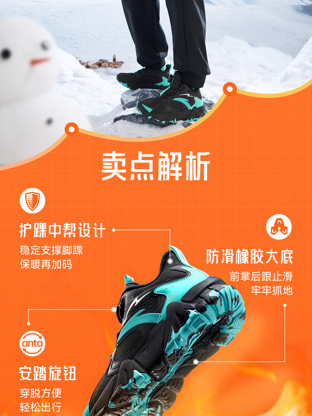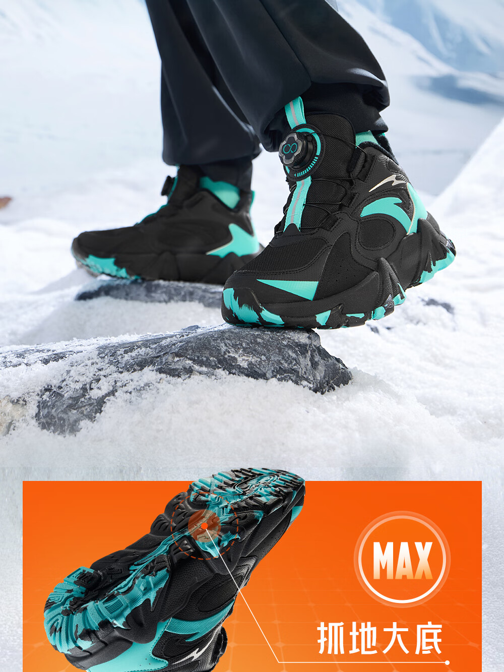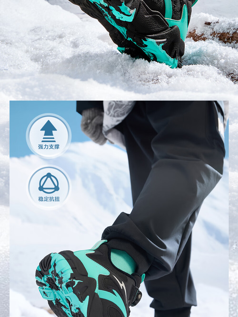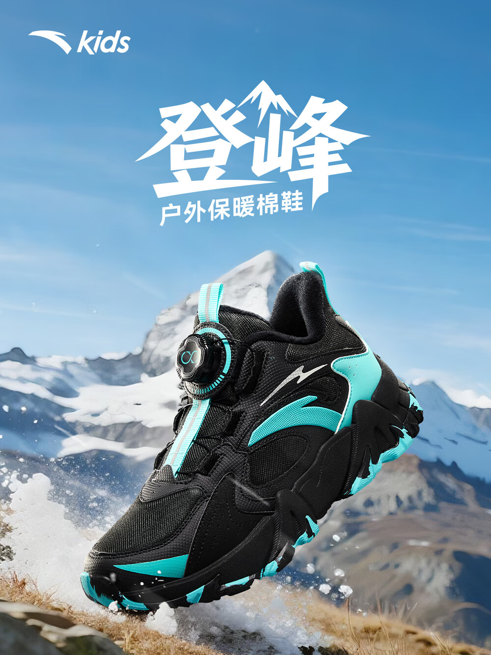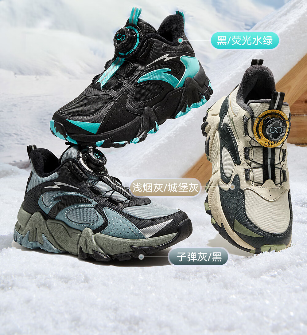 Anta children's cotton shoes for boys and girls winter non-slip knob buckle high top plus velvet warm outdoor snow boots two cotton shoes store manager recommended black/fluorescent aqua-4 35 shoe inner length 22cm