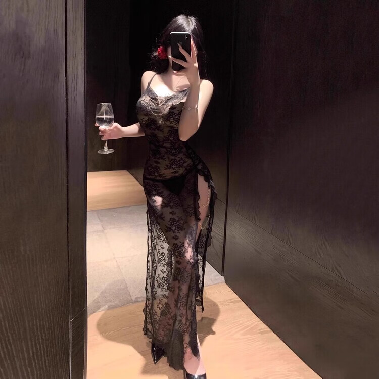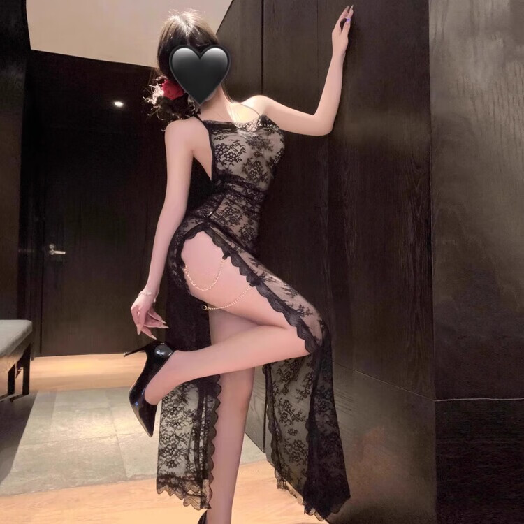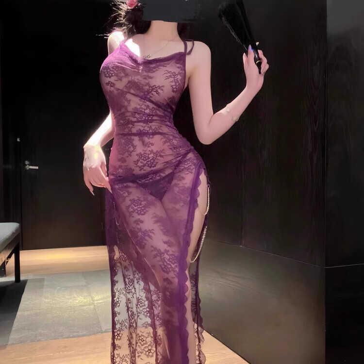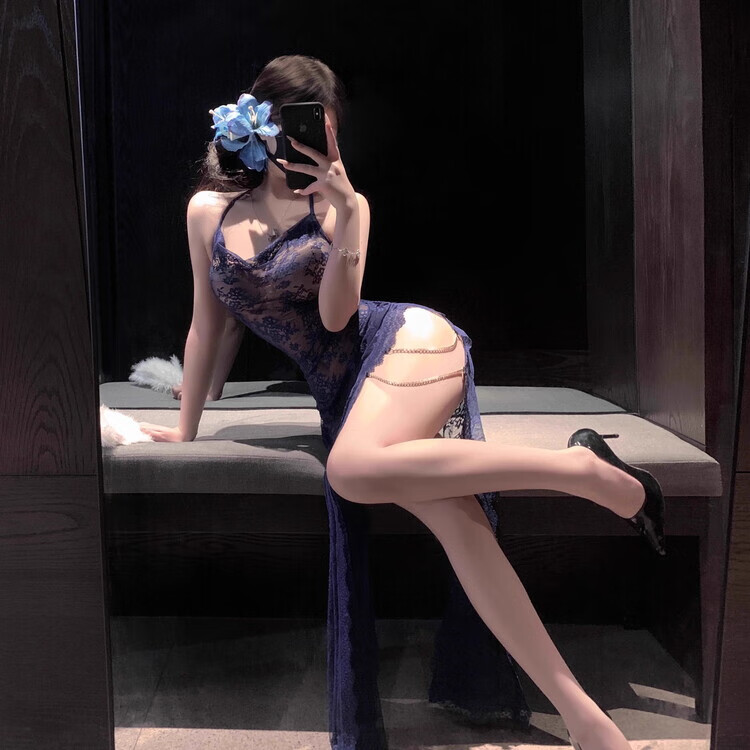 Kuangmo sexy qqny pajamas long lace transparent temptation looming cheongsam long skirt large size love and fun underwear blue nightgown + T pants one size fits all recommended 80-120 Jin Jin equals 0.5 kg