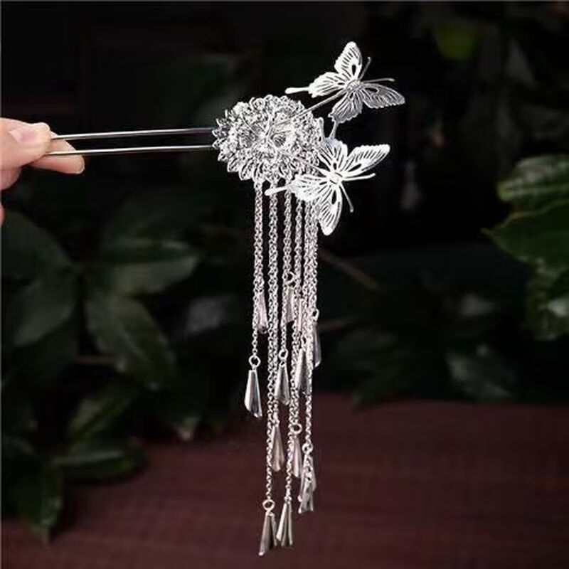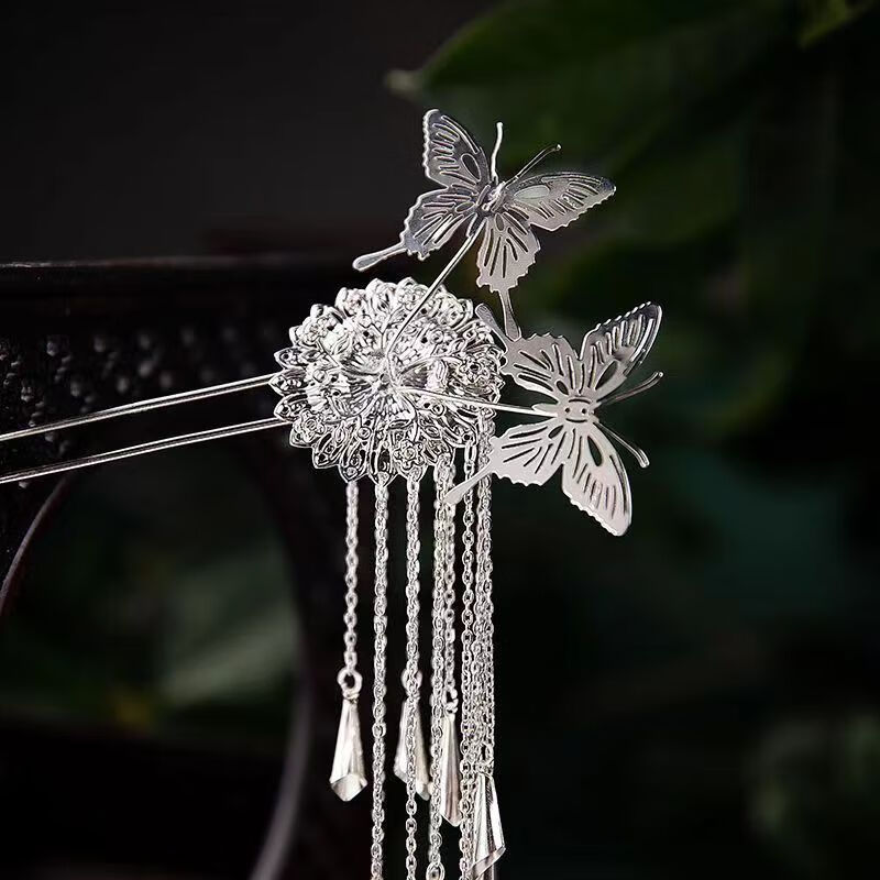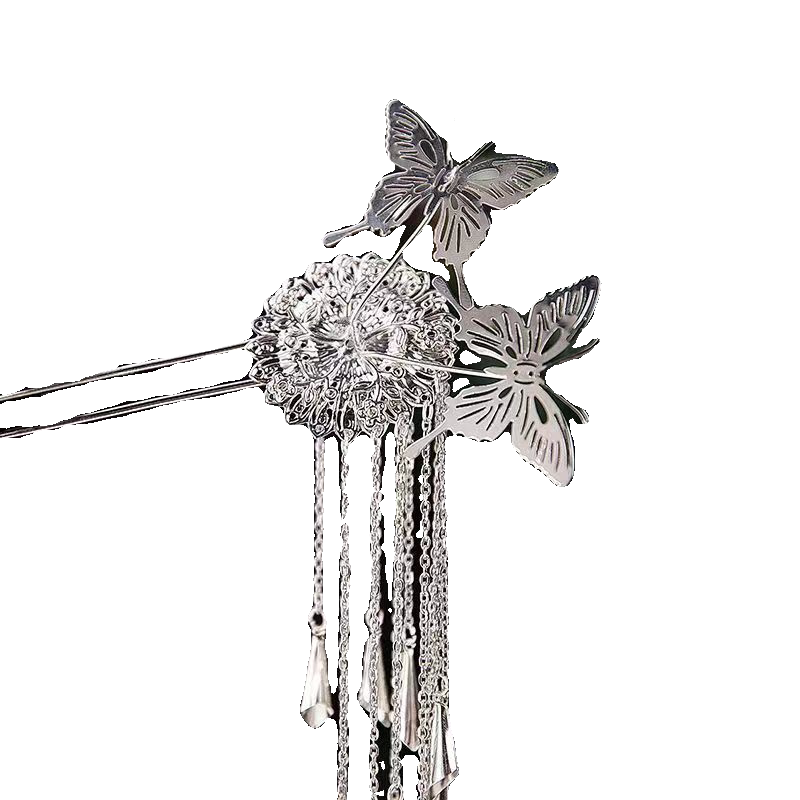 Hanfu butterfly silver tassel ancient style hairpin step rocking hairpin jewelry headwear palace hair accessories high-end tassel wind chime butterfly hairpin 2 pieces