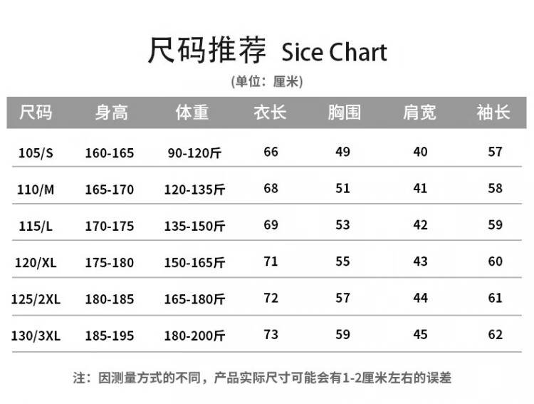 China (cm) 165 / 88-90 170 / 96-98 175 / 108-110 180 / 118-122 185 / 126-130