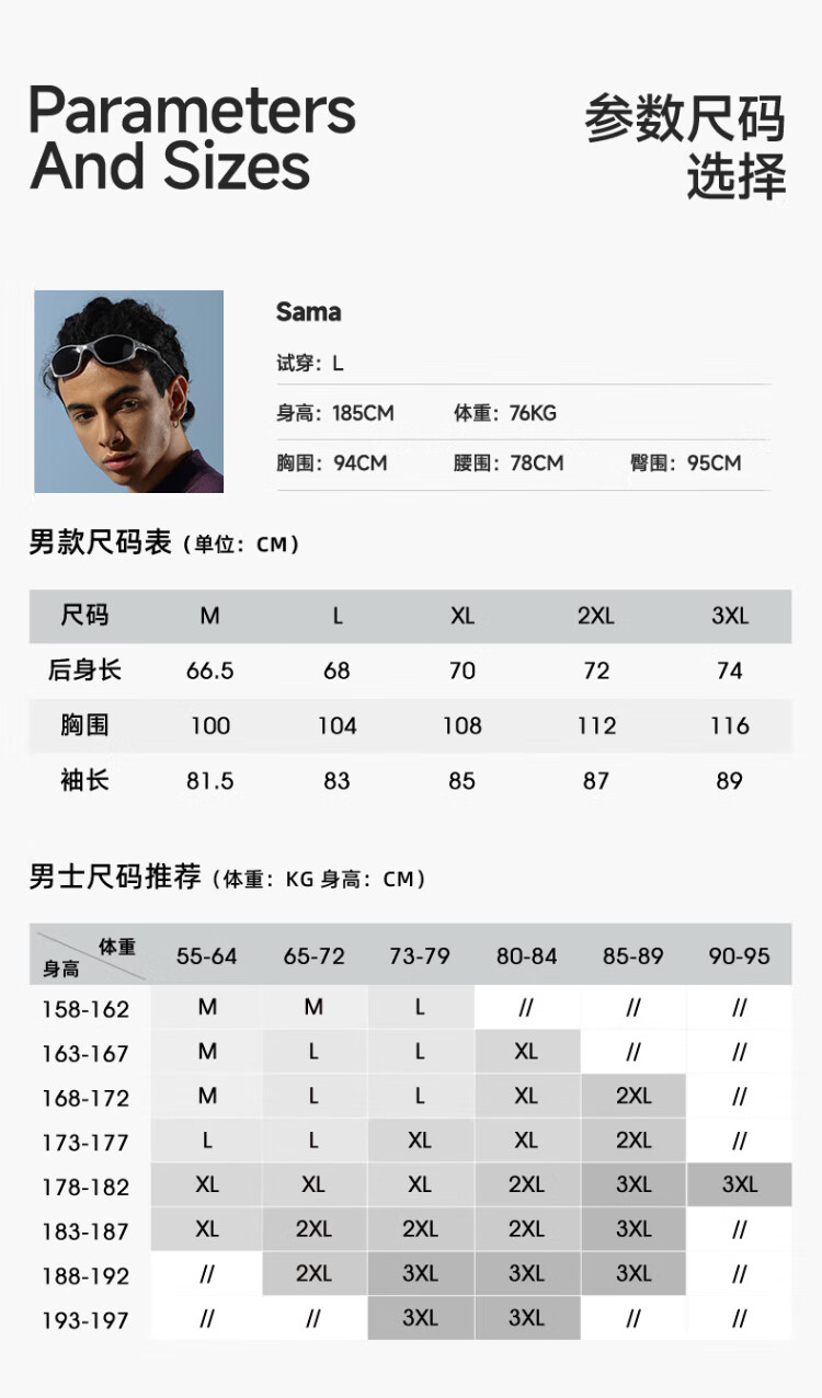 China (cm) 160-165/84-86 165-170 / 88-90 167-172 / 92-96 168-173 / 98-102 170-176 / 106-110