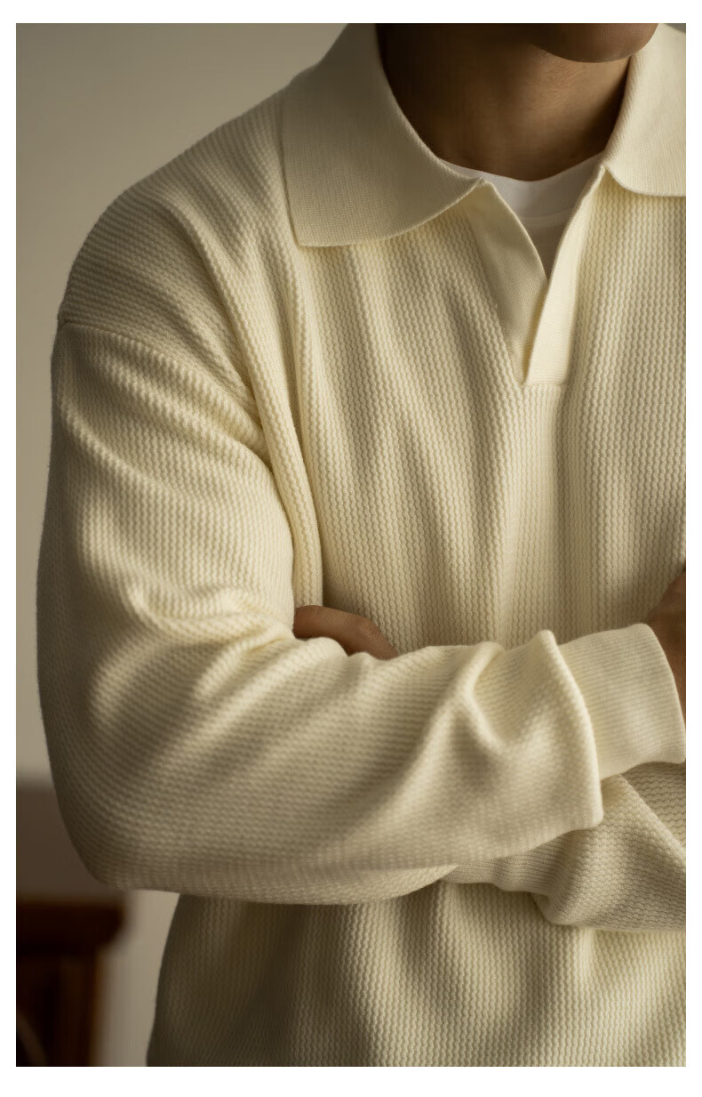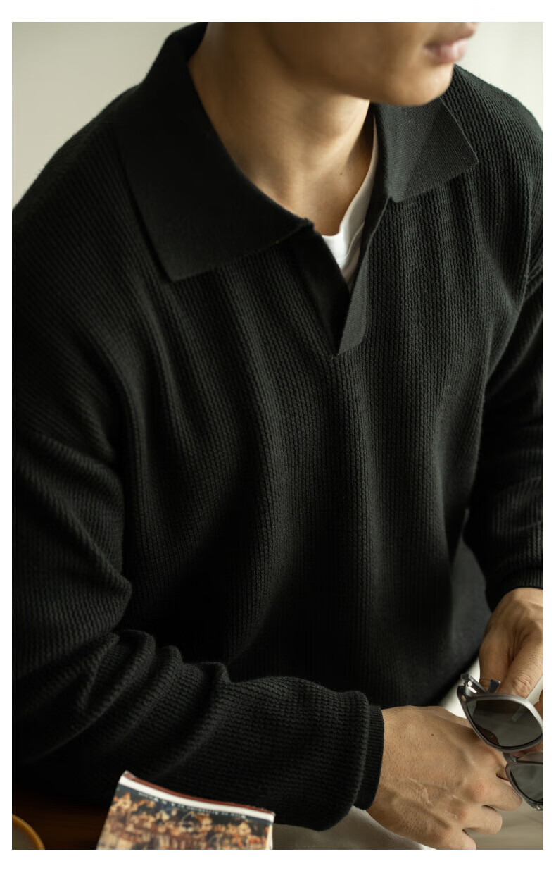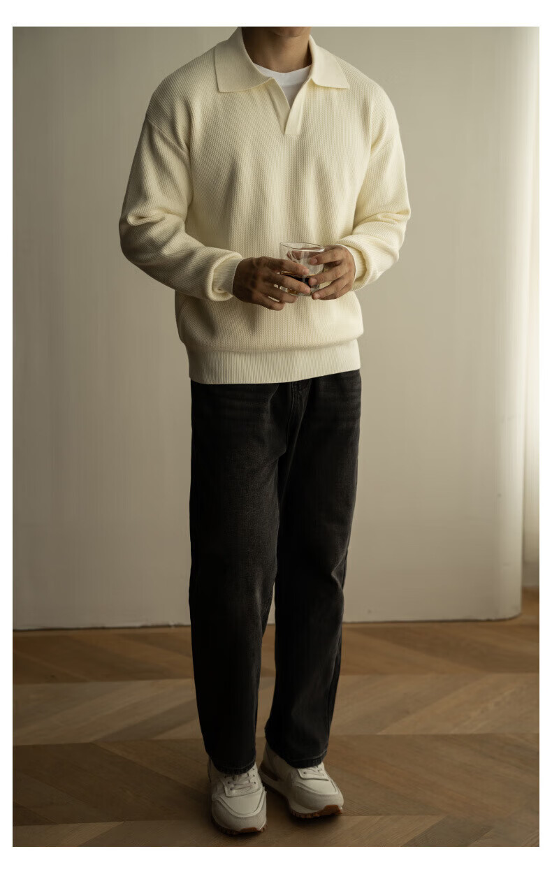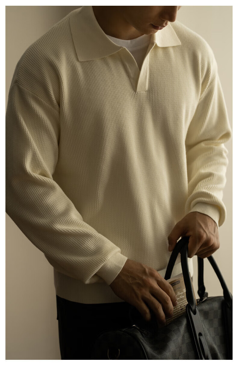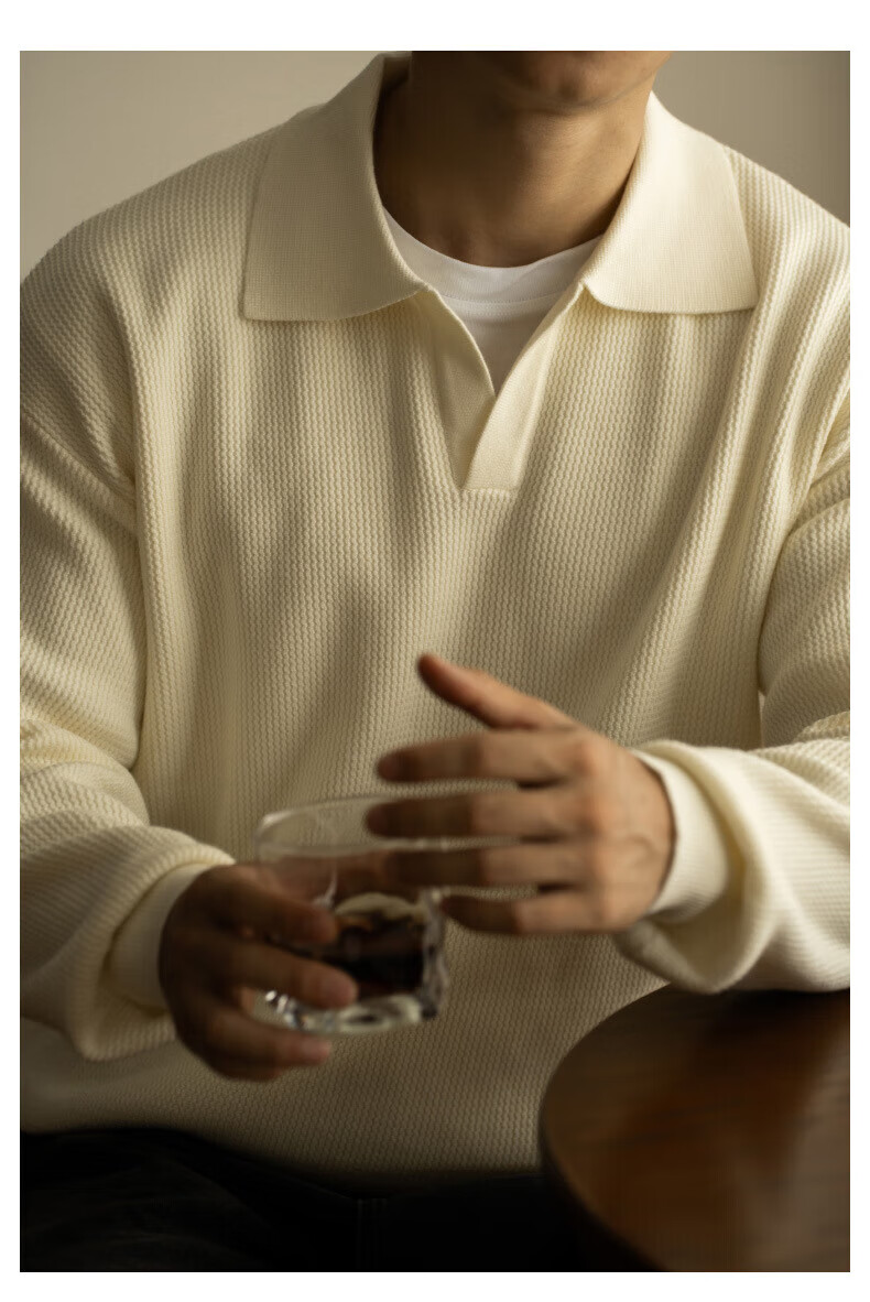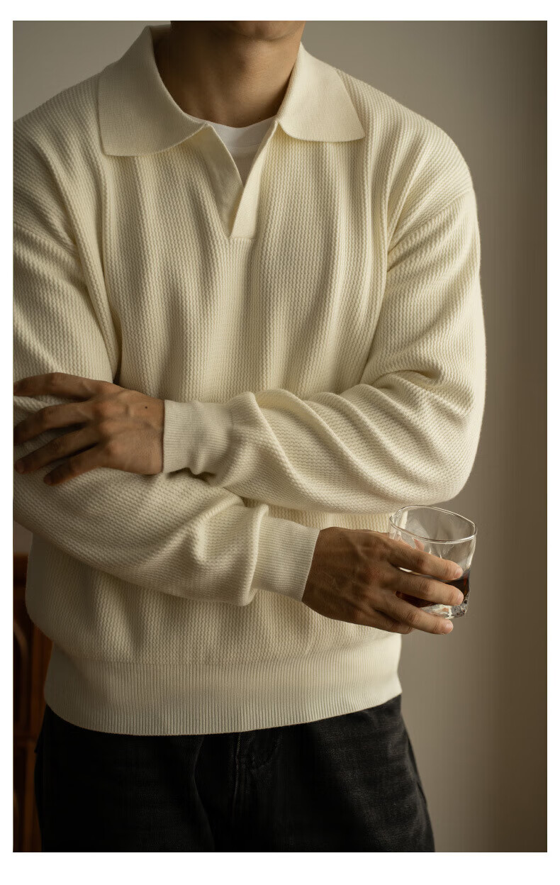 Kazuki Kuraishi KAZUKI KURAISHI autumn new V-neck sweater pullover heavy sweater yarn-dyed lapel long-sleeved POLO shirt casual light mature style for men off-white XL