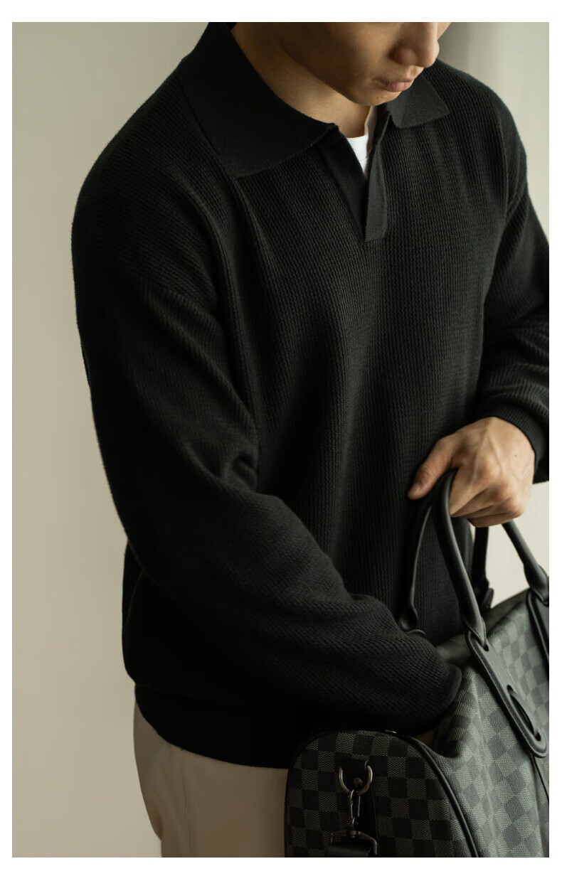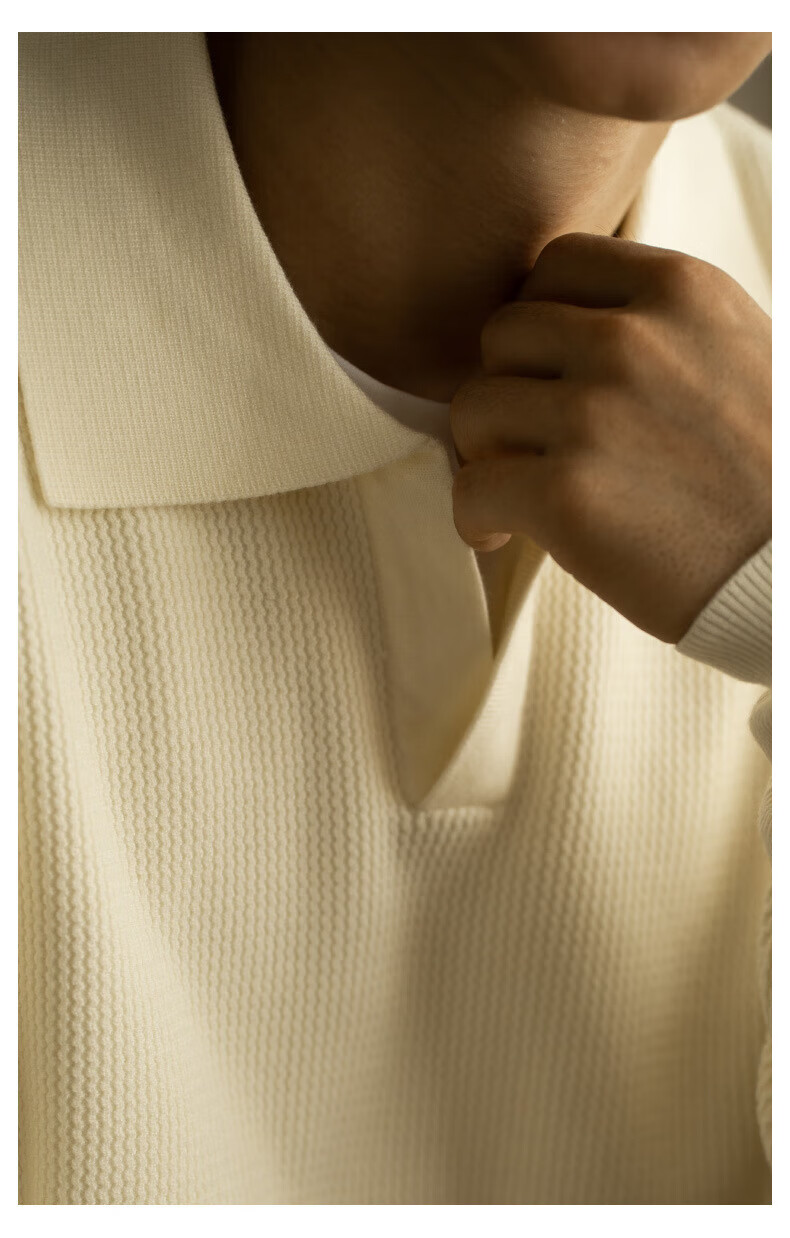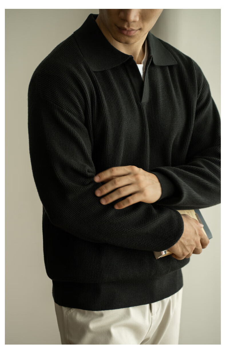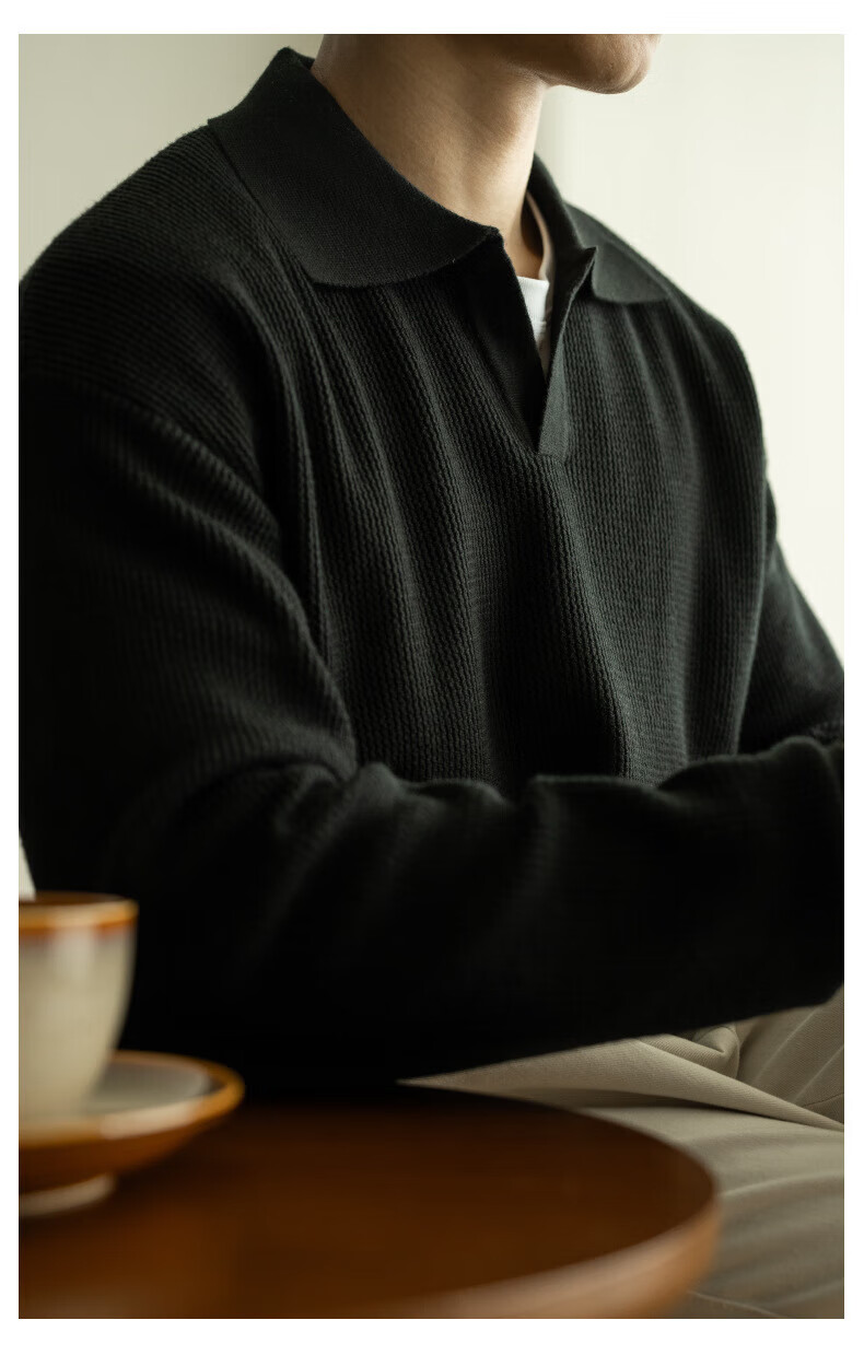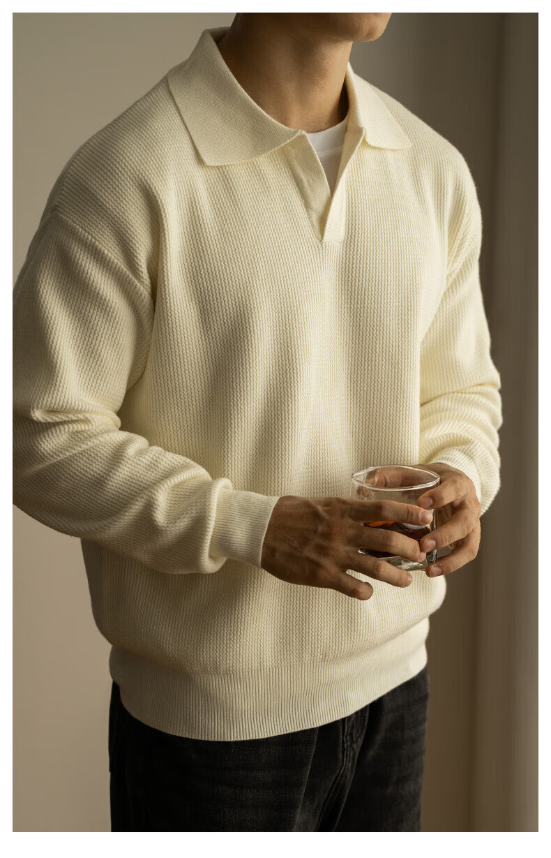 Kazuki Kuraishi KAZUKI KURAISHI autumn new V-neck sweater pullover heavy sweater yarn-dyed lapel long-sleeved POLO shirt casual light mature style for men off-white XL