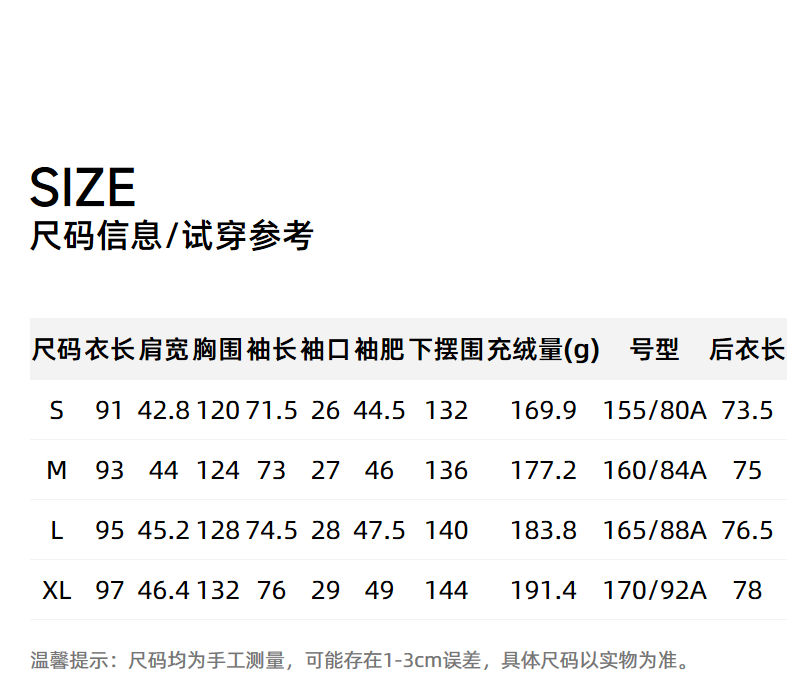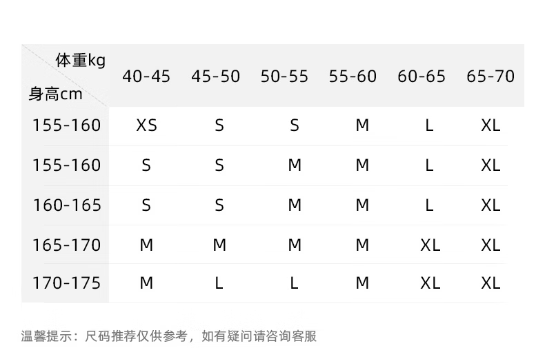 China (cm) 160-165/84-86 165-170 / 88-90 167-172 / 92-96 168-173 / 98-102 170-176 / 106-110