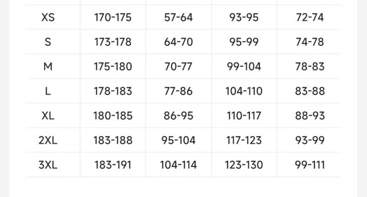 China (cm) 165 / 88-90 170 / 96-98 175 / 108-110 180 / 118-122 185 / 126-130