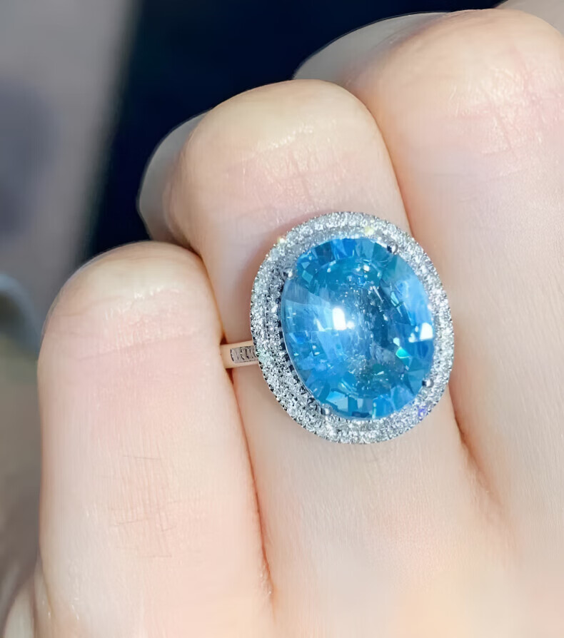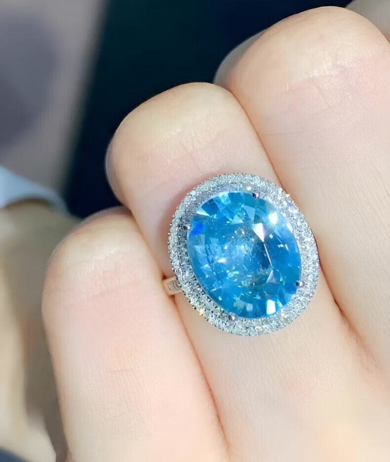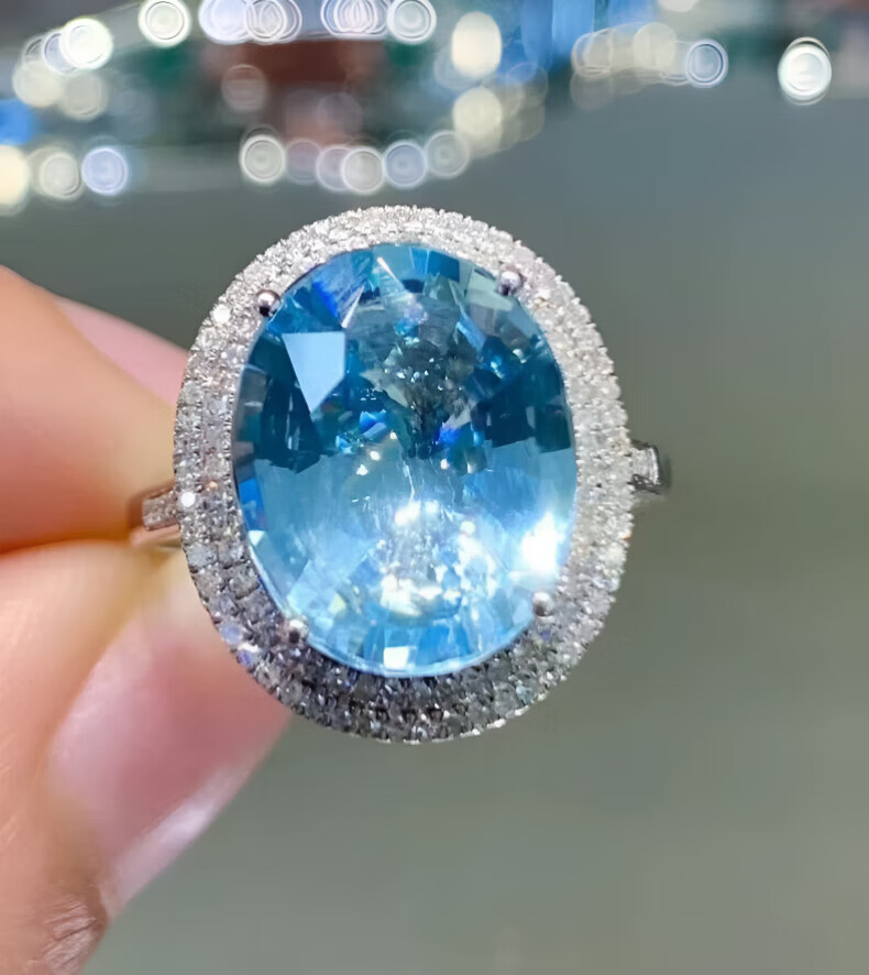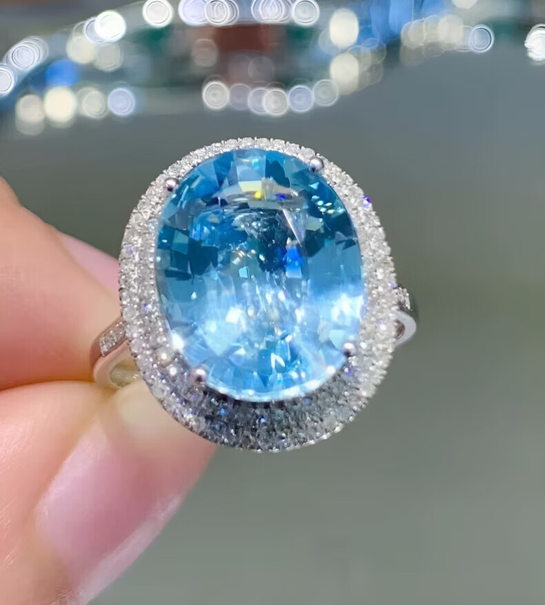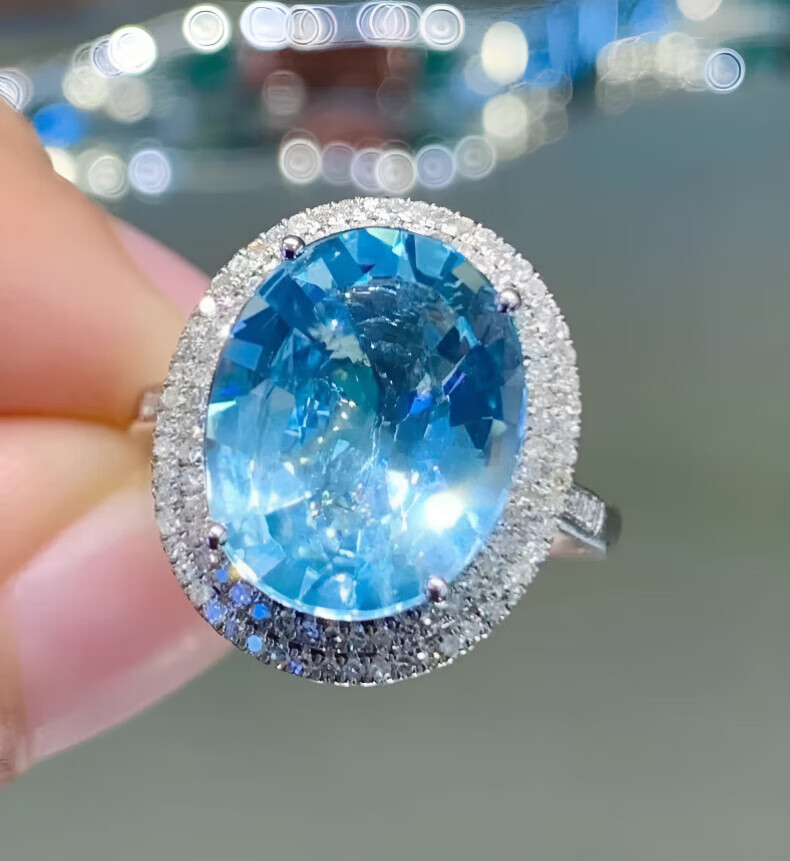 HEEKAIYI Santa Maria Aquamarine Ring Women's 18k Gold Diamond Ring Chinese Valentine's Day Birthday Gift for Wife Selected 4 Carat/Santa Maria Color