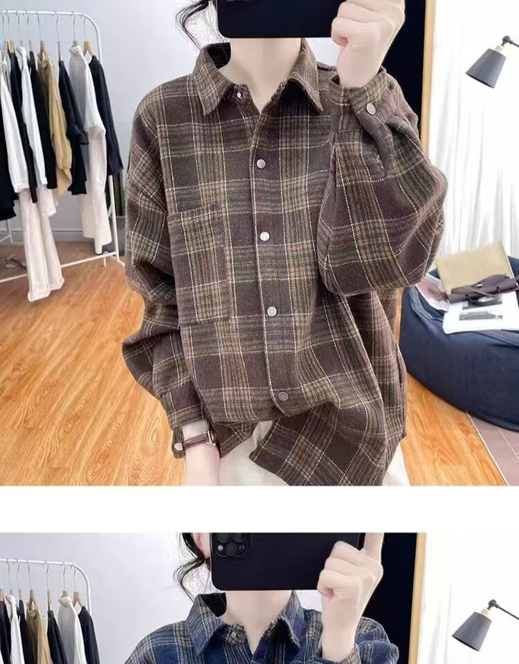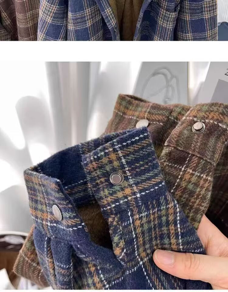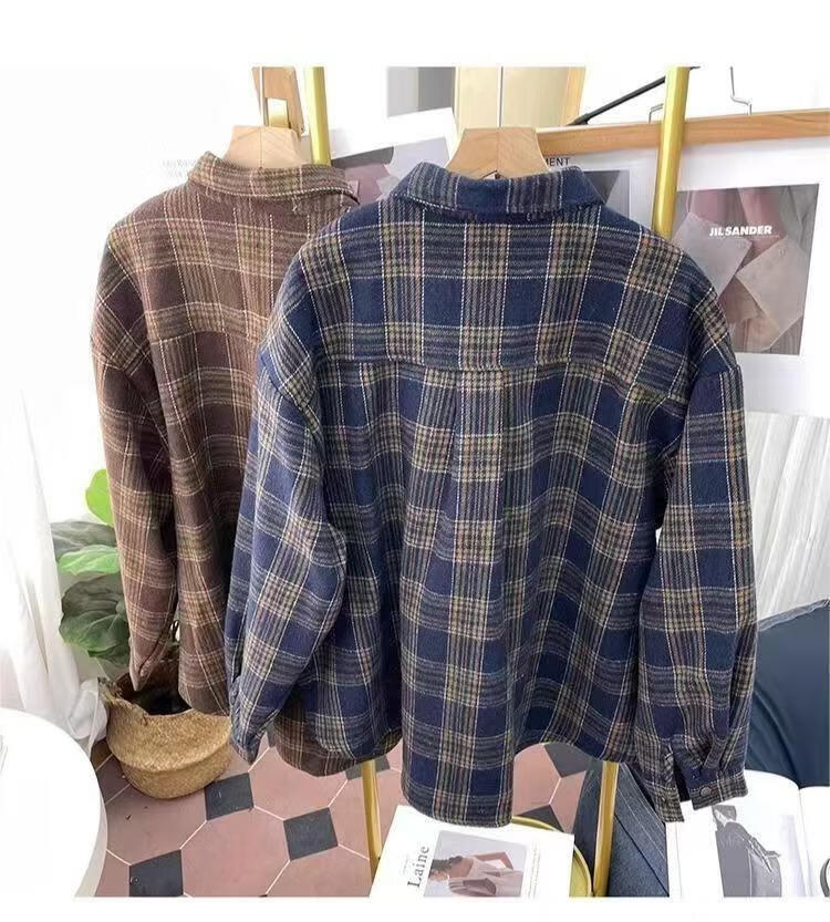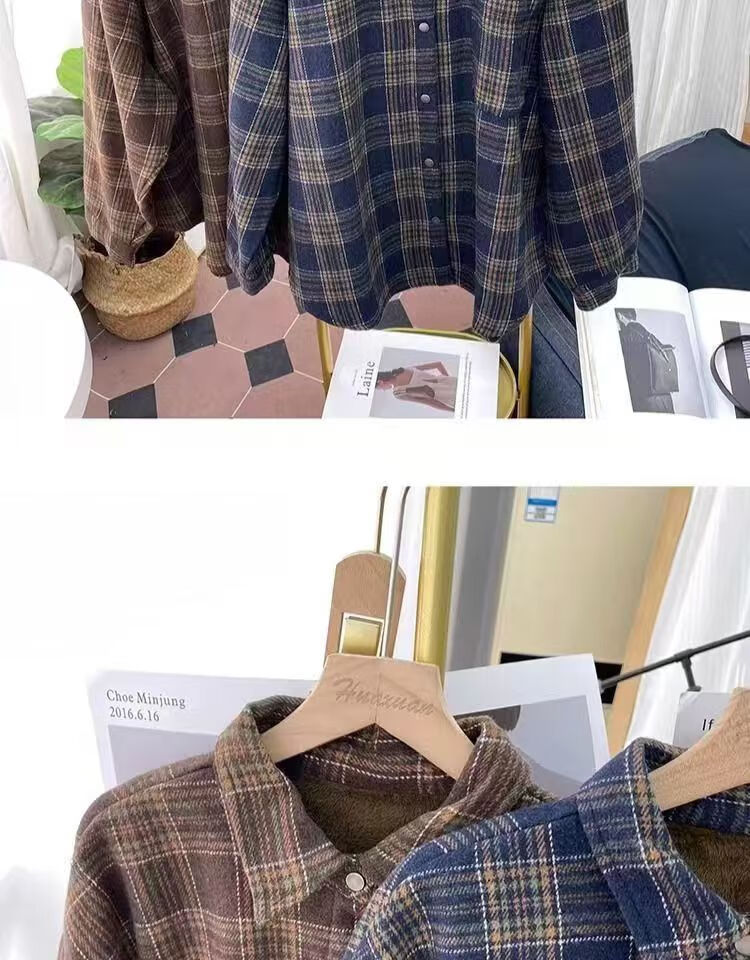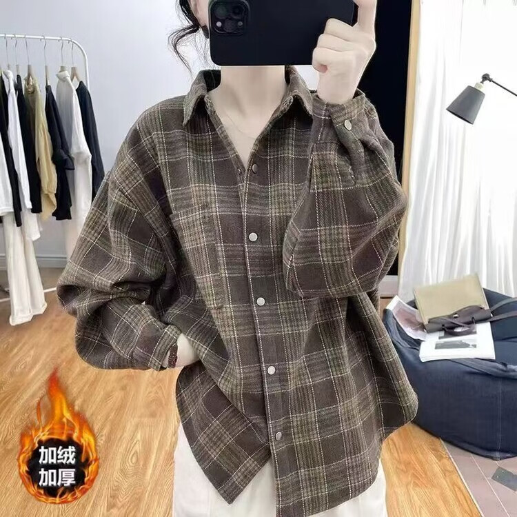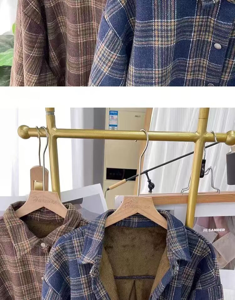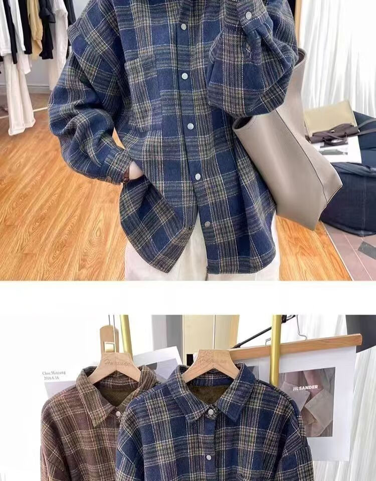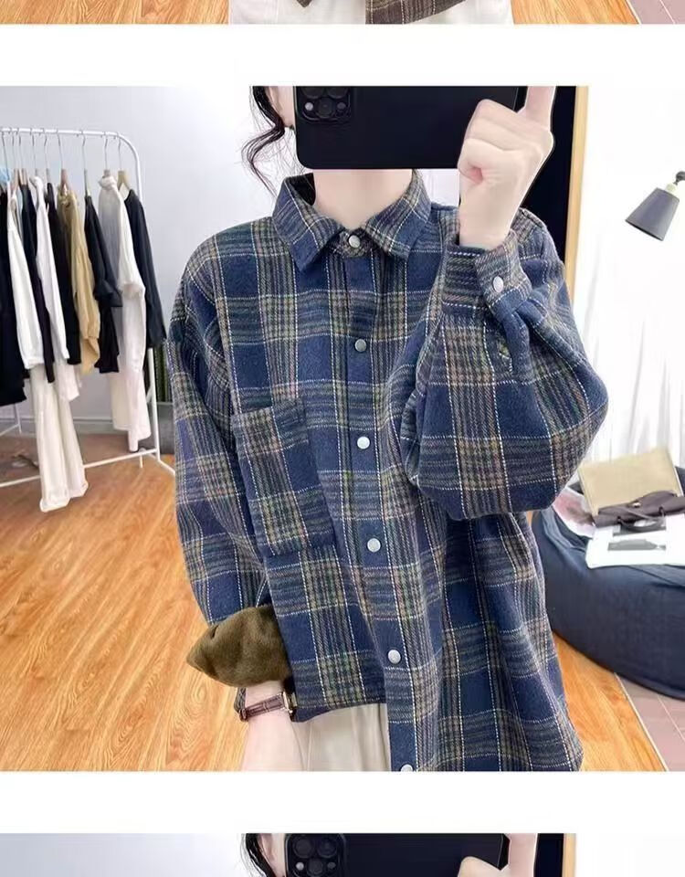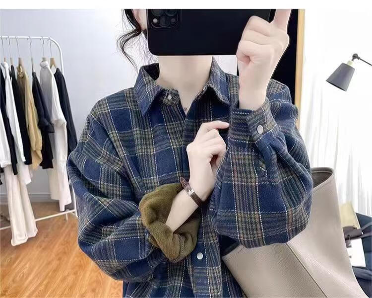 Gobanya lazy style velvet thickened plaid shirt for women retro simple casual loose lapel winter warm shirt jacket blue plus velvet L 90-110Jin Jin equals 0.5 kg