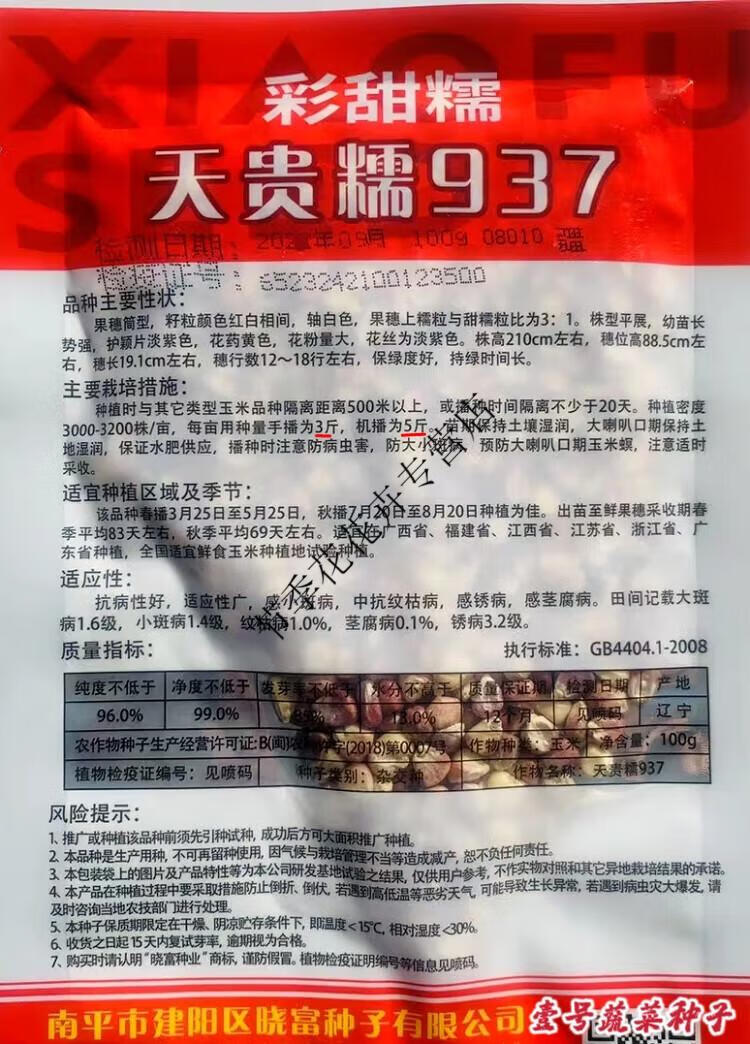 National Approval Xiaofu Tiangui Nuo 937 Big Stick High Yield Disease Resistance Spring and Autumn Field Base Colorful Sweet Nuo Jade 2018 BMW Tiangui Nuo 937 Original 200g